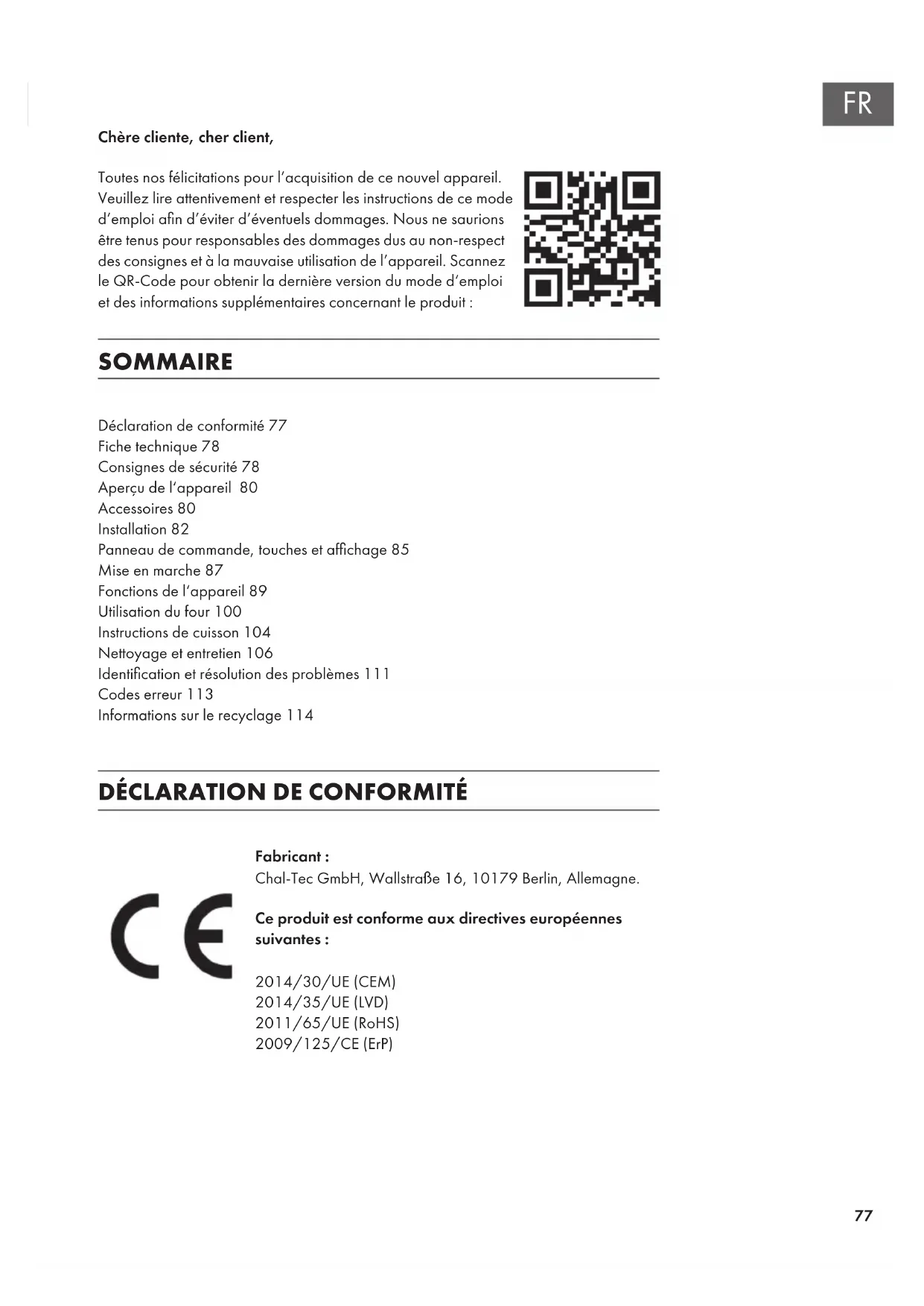 Déclaration de conformité77 Fiche technique78 Consignes de sécurité78 Aperçu de l‘appareil 80 Accessoires80 Installation82 Panneau de commande, touches et afchage85 Mise en marche87 Fonctions de l‘appareil89 Utilisation du four100 Instructions de cuisson104 Nettoyage et entretien106 Identication et résolution des problèmes111 Codes erreur113 Informations sur le recyclage114 Chère cliente, cher client, Toutes nos félicitations pour l’acquisition de ce nouvel appareil. Veuillez lire attentivement et respecter les instructions de ce mode d’emploi an d’éviter d’éventuels dommages. Nous ne saurions être tenus pour responsables des dommages dus au non-respect des consignes et à la mauvaise utilisation de l’appareil. Scannez le QR-Code pour obtenir la dernière version du mode d‘emploi et des informations supplémentaires concernant le produit : SOMMAIRE