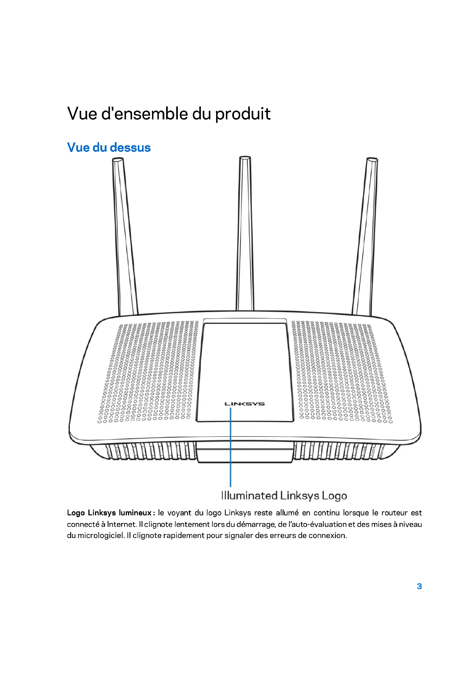 - Conditions environnementales Présentation du produit Vue de dessus Logo Linksys lumineux ------ Le logo Linksys reste allumé tant que l'appareil est connecté à Internet. Il clignote (normalement ou lentement) pendant le démarrage, le test automatique et les mises à niveau du micrologiciel. Il clignote rapidement pour signaler les erreurs de connexion.4 Vue arrière Antennes ajustables (1) — Pour une meilleure performance, positionnez les antennes à la verticale comme indiqué sur le dessin. Port USB 3.0 (2) — Connectez et partagez un disque ou une imprimante USB via votre réseau ou Internet. Port Internet (3) — Utilisez un câble Ethernet pour brancher un modem Internet à haut débit de type fibre optique ou câble / DSL sur ce port gigabit (10/100/1000) jaune. Remarque — Pour des performances optimales, utilisez des câbles de catégorie CAT5e ou supérieure sur les ports Internet. Ports Ethernet (4) — Utilisez des câbles Ethernet pour brancher des périphériques filaires de votre réseau sur ces ports Gigabit (10/100/1000) bleus.5 Remarque — Pour des performances optimales, utilisez des câbles de catégorie CAT5e ou supérieure sur les ports Ethernet. Port d'alimentation (5) ------ Branchez sur ce port l'adaptateur secteur fourni avec le routeur. Bouton Wi-Fi Protected Setup™ (6) — Appuyez sur ce bouton pour configurer la sécurité sans fil sur des périphériques réseau compatibles Wi-Fi Protected Setup. Bouton de réinitialisation (7) — Pour restaurer les paramètres d'usine du routeur, maintenez ce bouton enfoncé jusqu'à ce que le voyant d'alimentation se mette à clignoter. Vous pouvez également restaurer les paramètres d'usine à l'aide de Linksys Smart Wi-Fi via Internet ou une application mobile. Bouton d'alimentation (8) ------ Appuyez sur | pour allumer (on) le routeur.6 Installation : instructions de base Où trouver une aide supplémentaire En plus de ce guide de l'utilisateur, vous pouvez trouver de l'aide supplémentaire ici : p. 213
