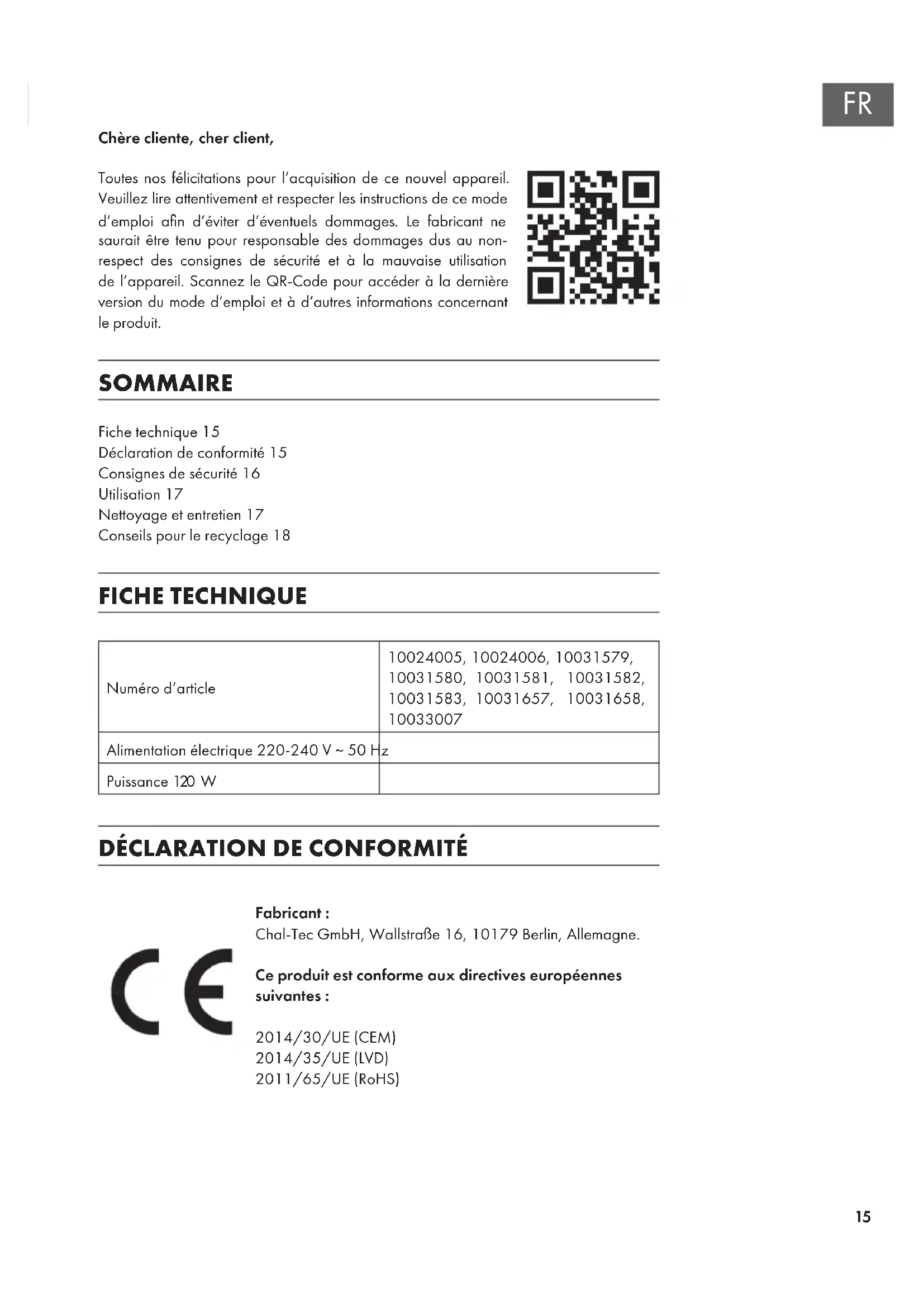 Fabricant : Chal-Tec GmbH, Wallstraße 16, 10179 Berlin, Allemagne. Ce produit est conforme aux directives européennes suivantes : 2014/30/UE (CEM) 2014/35/UE (LVD) 2011/65/UE (RoHS) Fiche technique15 Déclaration de conformité15 Consignes de sécurité16 Utilisation17 Nettoyage et entretien17 Conseils pour le recyclage1816