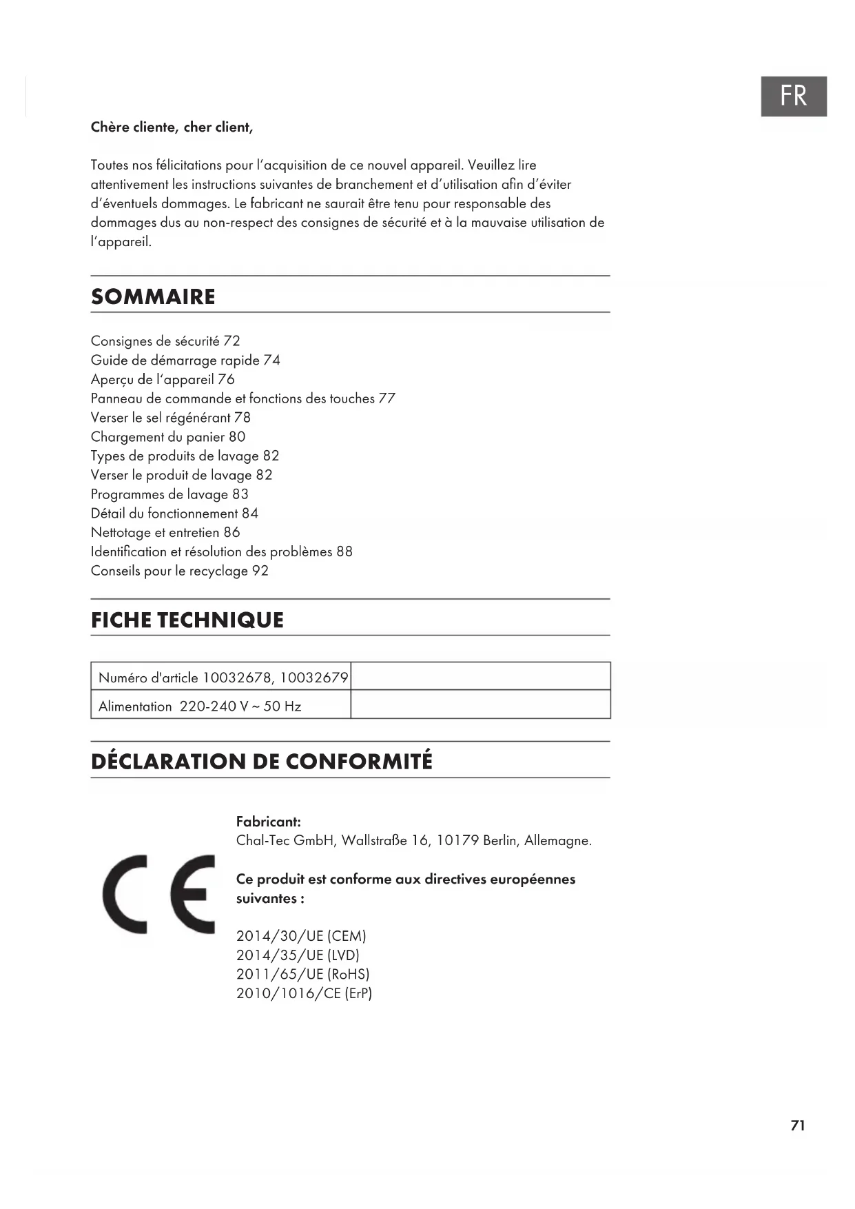 Fabricant: Chal-Tec GmbH, Wallstraße 16, 10179 Berlin, Allemagne. Ce produit est conforme aux directives européennes suivantes : 2014/30/UE (CEM) 2014/35/UE (LVD) 2011/65/UE (RoHS) 2010/1016/CE (ErP) Consignes de sécurité72 Guide de démarrage rapide74 Aperçu de l‘appareil76 Panneau de commande et fonctions des touches77 Verser le sel régénérant78 Chargement du panier80 Types de produits de lavage82 Verser le produit de lavage82 Programmes de lavage83 Détail du fonctionnement84 Nettotage et entretien86 Identication et résolution des problèmes88 Conseils pour le recyclage92 Chère cliente, cher client, Toutes nos félicitations pour l’acquisition de ce nouvel appareil. Veuillez lire attentivement les instructions suivantes de branchement et d’utilisation an d’éviter d’éventuels dommages. Le fabricant ne saurait être tenu pour responsable des dommages dus au non-respect des consignes de sécurité et à la mauvaise utilisation de l’appareil. SOMMAIRE English Español Français Italiano72