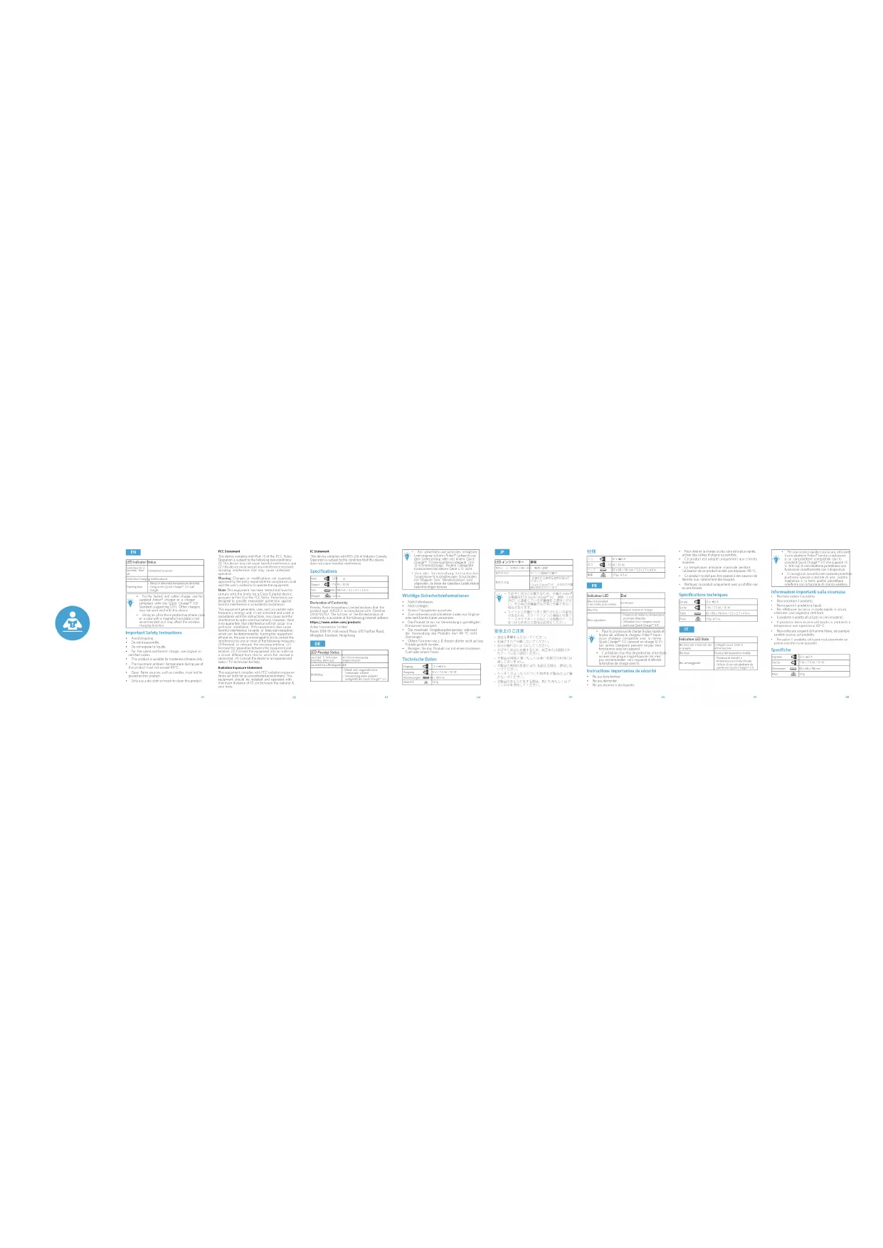 ƨȔ Pour le processus de charge le plus rapide et le plus sûr, utilisez le chargeur Anker® fourni ou un chargeur compatible avec la norme Quick Charge™ 3.0 (prenant en charge 12V). Les autres chargeurs peuvent ne pas bien fonctionner avec cet appareil. ƨȔ L'utilisation d'un étui de protection ultra-épais ou avec une plaque magnétique/en fer n'est pas recommandée: cela risquerait d'affecter la fonction de charge sans fil. Instructions importantes de sécurité ƨȔ Ne pas faire tomber. ƨȔ Ne pas démonter. ƨȔ Ne pas exposer à des liquides. ƨȔ Pour obtenir la charge la plus sûre et la plus rapide, utiliser des câbles d'origine ou certifiés. ƨȔ Ce produit est adapté uniquement aux climats modérés. ƨȔ La température ambiante maximale pendant l'utilisation de ce produit ne doit pas dépasser 40°C. ƨȔ Ce produit ne doit pas être exposé à des sources de flamme nue, notamment des bougies. ƨȔ Nettoyez ce produit uniquement avec un chiffon sec ou une brosse. Spécifications techniques Entrée 12 V 1.5 A Sortie 5 W / 7.5 W / 10 W Taille 82 x 68 x 118 mm / 3.2 x 2.7 x 4.6 in Poids 127g/ 4.5 oz