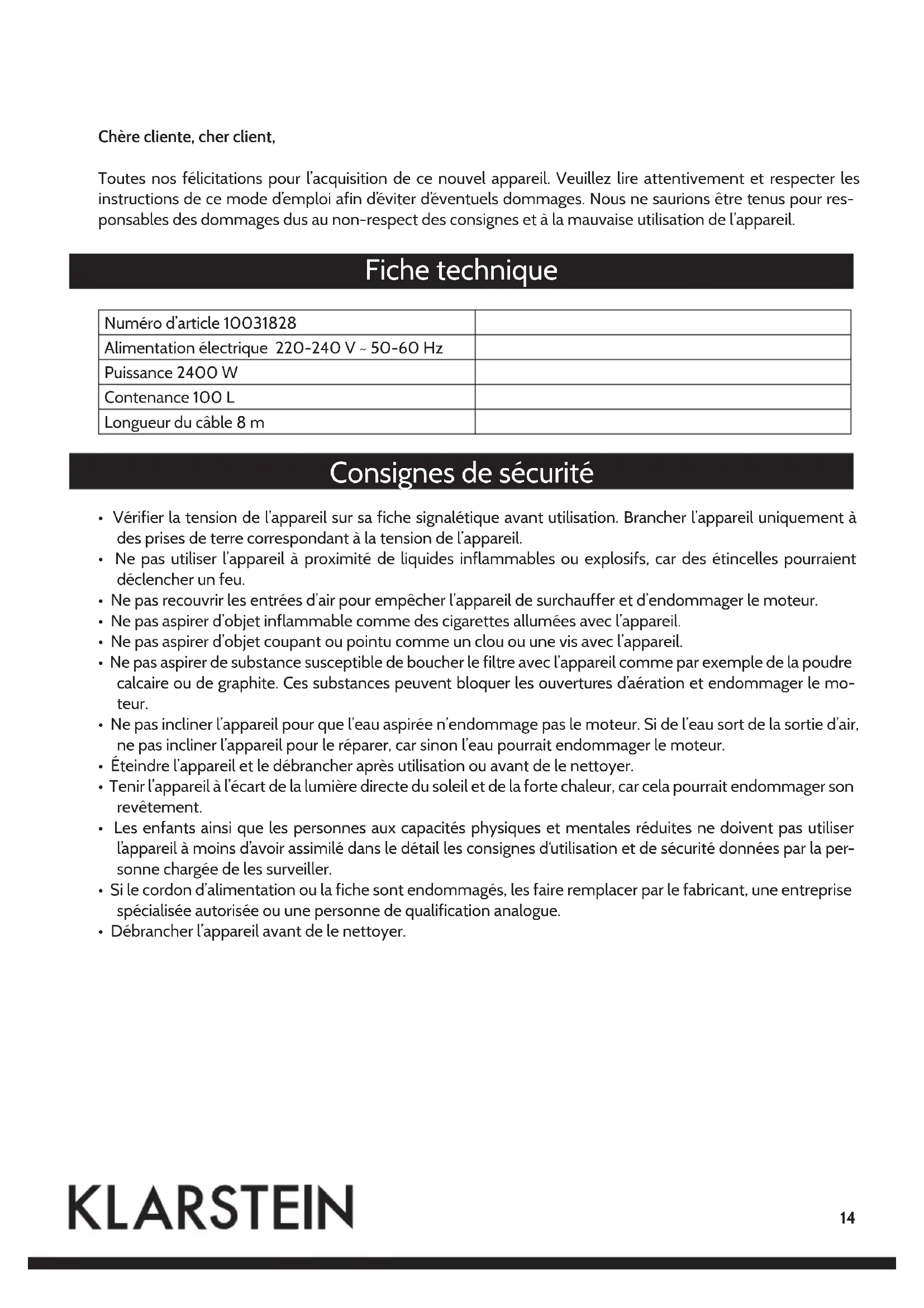 10031828 - Aspirateur Klarstein - Notice d'utilisation et mode d'emploi gratuit