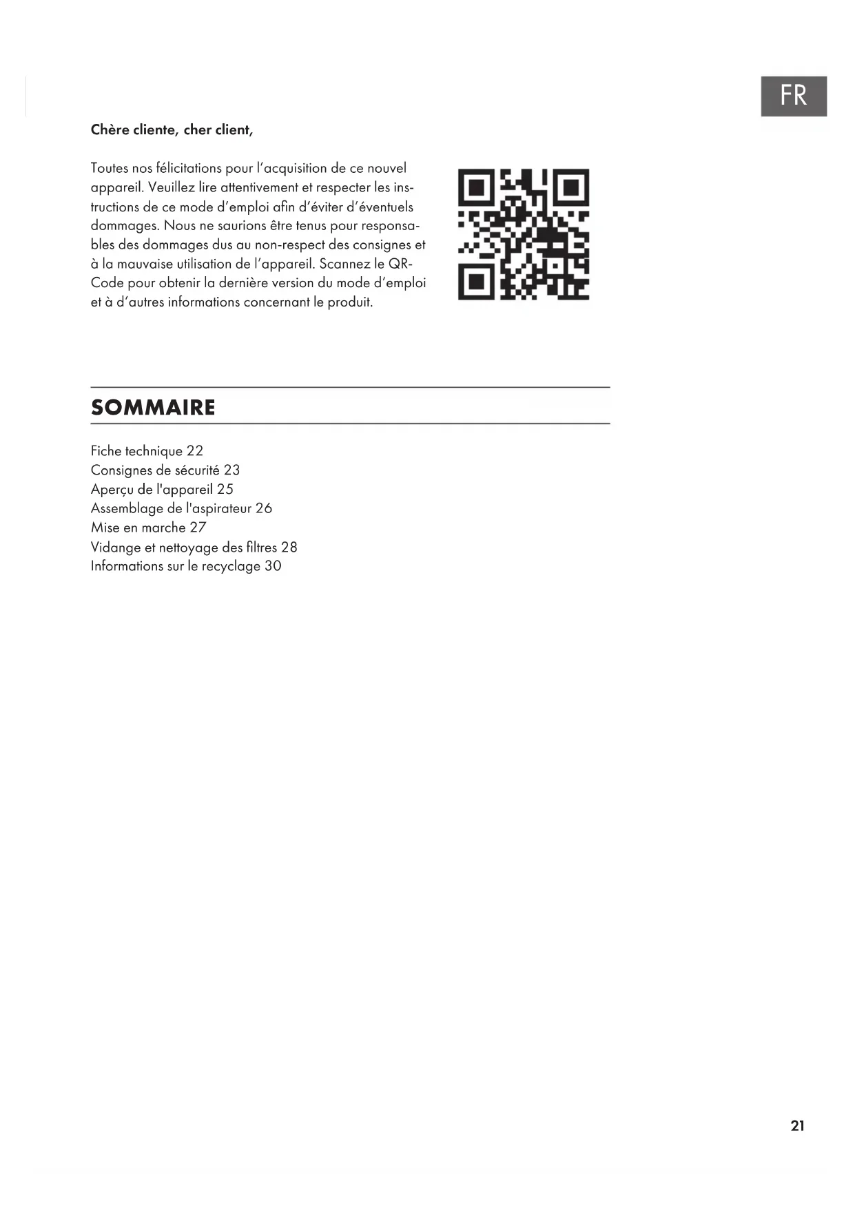 Fiche technique 22 Consignes de sécurité 23 Aperçu de l'appareil 25 Assemblage de l'aspirateur 26 Mise en marche 27 Vidange et nettoyage des ltres 28 Informations sur le recyclage 30 Chère cliente, cher client, Toutes nos félicitations pour l’acquisition de ce nouvel appareil. Veuillez lire attentivement et respecter les ins- tructions de ce mode d’emploi an d’éviter d’éventuels dommages. Nous ne saurions être tenus pour responsa- bles des dommages dus au non-respect des consignes et à la mauvaise utilisation de l’appareil. Scannez le QR- Code pour obtenir la dernière version du mode d‘emploi et à d‘autres informations concernant le produit. SOMMAIRE22