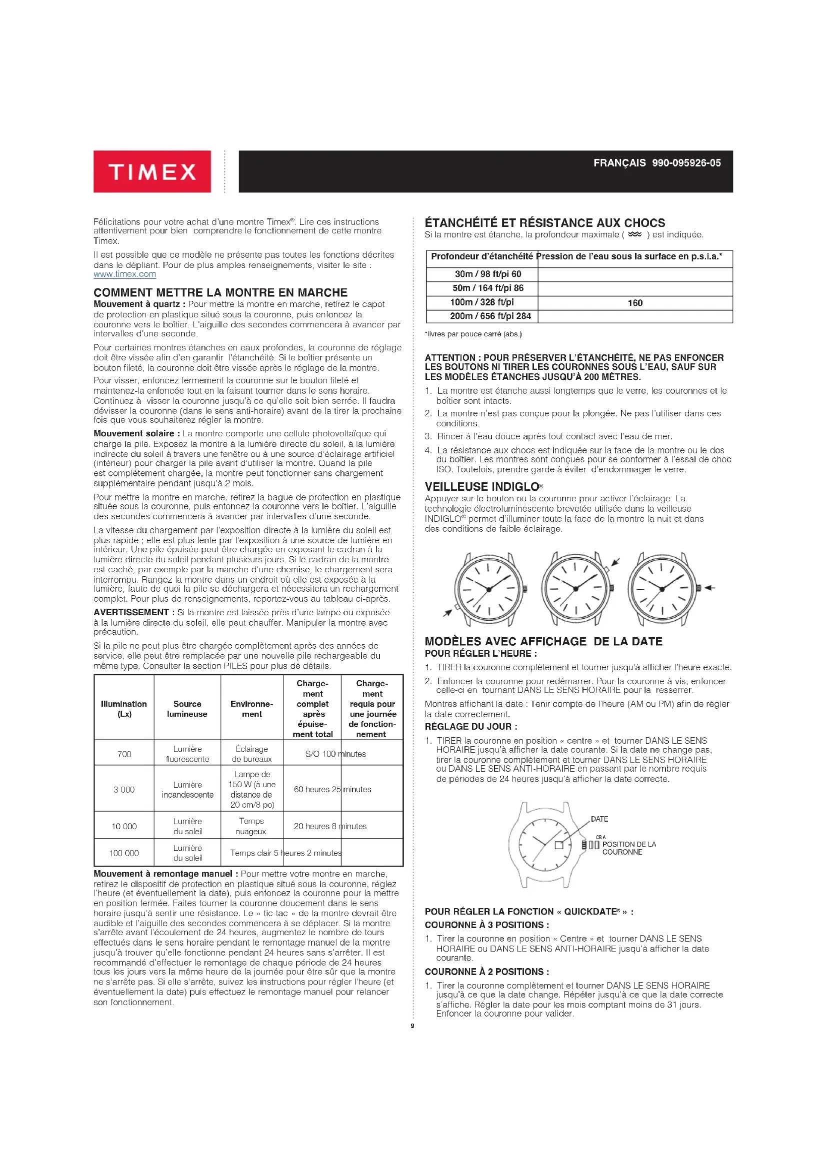 Mouvement à quartz : Pour mettre la montre en marche, retirez le capot de protection en plastique situé sous la couronne, puis enfoncez la couronne vers le boîtier. L’aiguille des secondes commencera à avancer par intervalles d’une seconde. Pour certaines montres étanches en eaux profondes, la couronne de réglage doit être vissée an d’en garantir l’étanchéité. Si le boîtier présente un bouton leté, la couronne doit être vissée après le réglage de la montre. Pour visser, enfoncez fermement la couronne sur le bouton leté et maintenez-la enfoncée tout en la faisant tourner dans le sens horaire. Continuez à visser la couronne jusqu’à ce qu’elle soit bien serrée. Il faudra dévisser la couronne (dans le sens anti-horaire) avant de la tirer la prochaine fois que vous souhaiterez régler la montre. Mouvement solaire : La montre comporte une cellule photovoltaïque qui charge la pile. Exposez la montre à la lumière directe du soleil, à la lumière indirecte du soleil à travers une fenêtre ou à une source d’éclairage articiel (intérieur) pour charger la pile avant d’utiliser la montre. Quand la pile est complètement chargée, la montre peut fonctionner sans chargement supplémentaire pendant jusqu’à 2 mois. Pour mettre la montre en marche, retirez la bague de protection en plastique située sous la couronne, puis enfoncez la couronne vers le boîtier. L’aiguille des secondes commencera à avancer par intervalles d’une seconde. La vitesse du chargement par l’exposition directe à la lumière du soleil est plus rapide ; elle est plus lente par l’exposition à une source de lumière en intérieur. Une pile épuisée peut être chargée en exposant le cadran à la lumière directe du soleil pendant plusieurs jours. Si le cadran de la montre est caché, par exemple par la manche d’une chemise, le chargement sera interrompu. Rangez la montre dans un endroit où elle est exposée à la lumière, faute de quoi la pile se déchargera et nécessitera un rechargement complet. Pour plus de renseignements, reportez-vous au tableau ci-après.