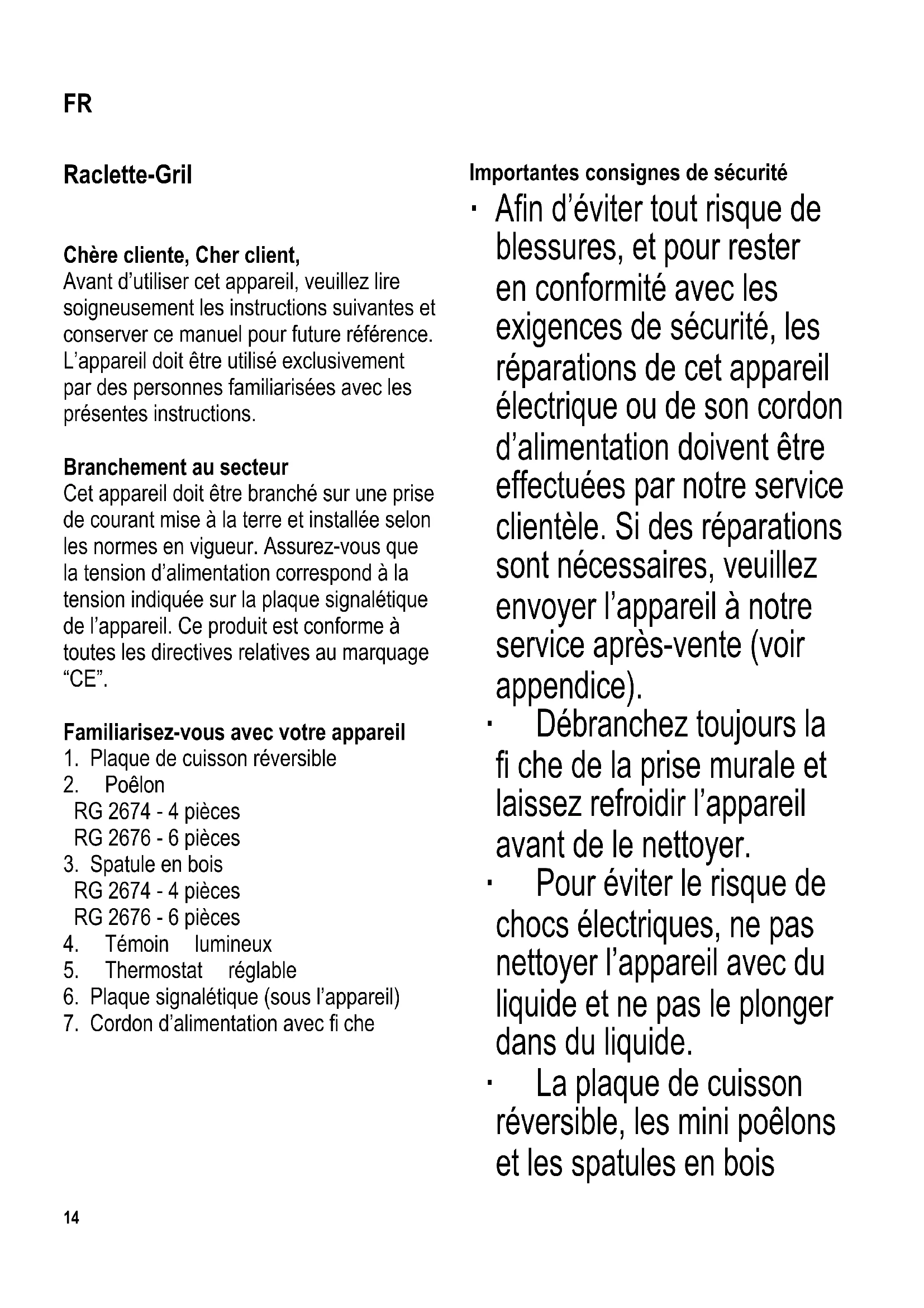 Importantes consignes de sécurité ∙ A fi n d’éviter tout risque de blessures, et pour rester en conformité avec les exigences de sécurité, les réparations de cet appareil électrique ou de son cordon d’alimentation doivent être effectuées par notre service clientèle. Si des réparations sont nécessaires, veuillez envoyer l’appareil à notre service après-vente (voir appendice). ∙ Débranchez toujours la fi che de la prise murale et laissez refroidir l’appareil avant de le nettoyer. ∙ Pour éviter le risque de chocs électriques, ne pas nettoyer l’appareil avec du liquide et ne pas le plonger dans du liquide. ∙ La plaque de cuisson réversible, les mini poêlons et les spatules en bois FR15 peuvent être nettoyés à l’eau chaude savonneuse. Pour des informations détaillées concernant le nettoyage de l’appareil, veuillez vous référer au paragraphe Nettoyage et entretien. ∙ L’appareil n’est pas destiné à être utilisé avec un programmateur externe ou une télécommande indépendante. ∙ Cet appareil est destiné à être utilisé dans des applications domestiques et analogues telles que : - des coins cuisines réservés au personnel dans des magasins, bureaux et autres environnements professionnels ; - des fermes ; - l’utilisation par les clients des hôtels, motels et autres environnements à caractère résidentiel ; - des environnements de type chambres d’hôtes. ∙ Cet appareil peut être utilisé par des enfants âgés d’au moins 8 ans, à condition qu’ils bénéfi cient d’une surveillance ou qu’ils aient reçu des instructions quant à l’utilisation de l’appareil en toute sécurité et qu’ils comprennent bien les dangers encourus. ∙ Les enfants ne doivent pas utiliser l’appareil comme un jouet. ∙ Le nettoyage et l’entretien par l’utilisateur ne doivent pas être effectués par des enfants, à moins qu’ils ne soient âgés de plus de 8 ans et qu’ils soient sous la surveillance d’un adulte. ∙ Conserver l’appareil et son câble hors de portée des16 enfants âgés de moins de 8ans. ∙ Cet appareil peut être utilisé par des personnes dont les capacités physiques, sensorielles ou mentale sont réduites ou dont l’expérience ou les connaissances ne sont pas suffi santes, à condition qu’ils bénéfi cient d’une surveillance ou qu’ils aient reçu des instructions quant à l’utilisation de l’appareil en toute sécurité et en comprennent bien les dangers potentiels. ∙ Attention : Tenez les enfants à l’écart des emballages, qui représentent un risque potentiel, par exemple, de suffocation. ∙ Avant d’utiliser cet appareil, le corps principal comprenant le cordon d’alimentation ainsi que tout accessoire en place doivent être soigneusement vérifi és afi n de détecter des dommages ou défauts éventuels. Au cas où l’appareil, par exemple, serait tombé sur une surface dure, ou si une force excessive aurait été employée pour tirer sur le cordon d’alimentation, il ne doit plus être utilisé. ∙ Le cordon doit toujours être tenu à l’écart des surfaces chaudes de l’appareil. ∙ Attention : Risque de brûlure. Les parties extérieures de l’appareil, les surfaces de cuisson et les mini poêlons deviennent chauds pendant l’utilisation et le restent quelque temps après. ∙ Laissez toujours suffi samment de temps à l’appareil de refroidir avant d’enlever la plaque de cuisson et avant de nettoyer ou de ranger l’appareil. ∙ Ne jamais faire fonctionner l’appareil sans surveillance. ∙ Placez l’appareil sur une surface de travail plane, horizontale et résistante à la chaleur et aux éclaboussures d’eau ou de graisse. ∙ Prenez soin de ne pas placer l’appareil contre un mur ou dans un angle, et de le tenir à l’écart de toute matière infl ammable. ∙ L’appareil doit fonctionner uniquement lorsque la plaque de cuisson réversible est correctement installée au-dessus de la résistance. ∙ Attention : N’utilisez pas l’appareil à l’extérieur. ∙ Débranchez toujours la fi che de la prise murale - après utilisation, - en cas de fonctionnement défectueux, - avant de nettoyer l’appareil. ∙ Ne pas débrancher l’appareil en tirant sur le cordon ; tirez toujours sur la fi che. ∙ L’appareil doit être utilisé uniquement avec les accessoires originaux.17 ∙ Nous déclinons toute responsabilité pour les dommages éventuels subis par cet appareil, résultant d’une utilisation incorrecte ou du non-respect de ce mode d’emploi. Avant la première mise en marche ∙ Retirez tous les éléments d’emballage et les autocollants de l’appareil. ∙ Avant d’utiliser l’appareil pour la première fois, essuyez la plaque de cuisson réversible, les spatules en bois et les mini poêlons avec un torchon humide. ∙ Faites chauffer l’appareil et les mini poêlons pendant environ 30 minutes, sans aucun aliment, pour éliminer l’odeur caractéristique qui se dégage lorsqu’un gril est allumé pour la première fois (une légère fumée peut également se dégager). Assurez une ventilation suffi sante en ouvrant les fenêtres ou les porte-fenêtres. ∙ Laissez à nouveau refroidir le gril. ∙ Nettoyez-le tel indiqué au paragraphe Nettoyage et entretien. Plaque de cuisson réversible ∙ Le côté strié de la plaque de cuisson réversible convient parfaitement pour la cuisson des viandes, tels que les steaks, les saucisses, etc. ∙ Le côté lisse de la plaque de cuisson réversible sert à griller les légumes et les fruits de mer. ∙ Avant d’allumer l’appareil, installez la plaque de cuisson réversible sur l’appareil, sur la résistance supérieure, en vous assurant que les encoches de la plaque s’emboîtent parfaitement sur les supports correspondants. Thermostat réglable ∙ Le thermostat variable contrôle le temps de fonctionnement de la résistance. Pour griller ou faire fondre, tournez, à fond, vers la droi