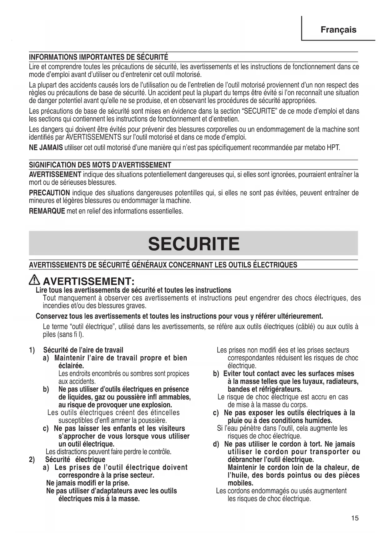 Lire et comprendre toutes les précautions de sécurité, les avertissements et les instructions de fonctionnement dans ce mode d’emploi avant d’utiliser ou d’entretenir cet outil motorisé. La plupart des accidents causés lors de l’utilisation ou de l’entretien de l’outil motorisé proviennent d’un non respect des règles ou précautions de base de sécurité. Un accident peut la plupart du temps être évité si l’on reconnaît une situation de danger potentiel avant qu’elle ne se produise, et en observant les procédures de sécurité appropriées. Les précautions de base de sécurité sont mises en évidence dans la section “SECURITE” de ce mode d’emploi et dans les sections qui contiennent les instructions de fonctionnement et d’entretien. Les dangers qui doivent être évités pour prévenir des blessures corporelles ou un endommagement de la machine sont identifi és par AVERTISSEMENTS sur l’outil motorisé et dans ce mode d’emploi. NE JAMAIS utiliser cet outil motorisé d’une manière qui n’est pas spécifi quement recommandée par metabo HPT.