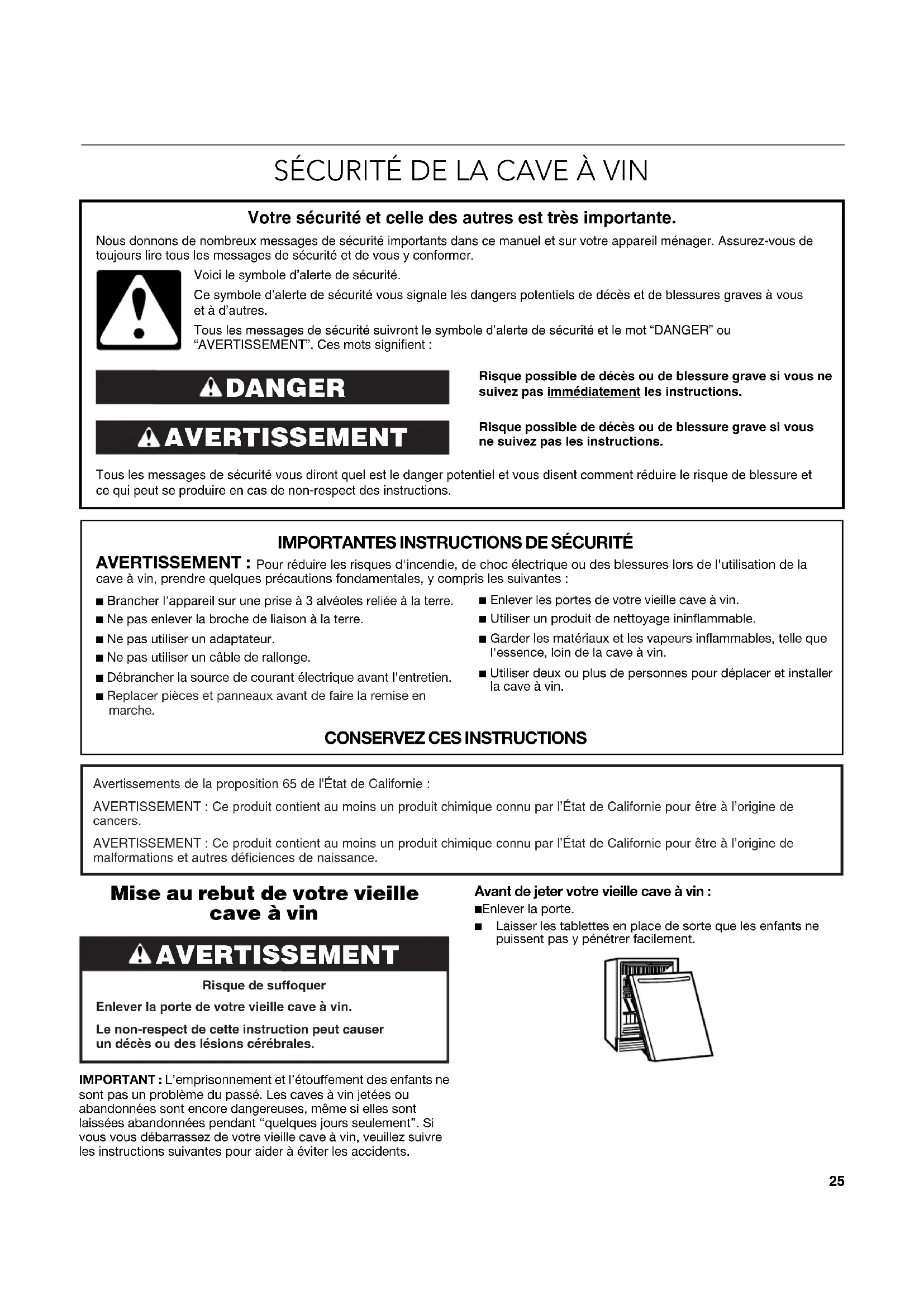 Mise au rebut de votre vieille cave à vin IMPORTANT : L’emprisonnement et l’étouffement des enfants ne sont pas un problème du passé. Les caves à vin jetées ou abandonnées sont encore dangereuses, même si elles sont laissées abandonnées pendant “quelques jours seulement”. Si vous vous débarrassez de votre vieille cave à vin, veuillez suivre les instructions suivantes pour aider à éviter les accidents.Avant de jeter votre vieille cave à vin :■ Enlever la porte. ■ Laisser les tablettes en place de sorte que les enfants ne puissent pas y pénétrer facilement. Risque possible de décès ou de blessure grave si vous ne suivez pas immédiatement les instructions. Risque possible de décès ou de blessure grave si vous ne suivez pas les instructions. Tous les messages de sécurité vous diront quel est le danger potentiel et vous disent comment réduire le risque de blessure et ce qui peut se produire en cas de non-respect des instructions. Votre sécurité et celle des autres est très importante. Nous donnons de nombreux messages de sécurité importants dans ce manuel et sur votre appareil ménager. Assurez-vous de toujours lire tous les messages de sécurité et de vous y conformer. AVERTISSEMENT DANGER Voici le symbole d’alerte de sécurité.Ce symbole d’alerte de sécurité vous signale les dangers potentiels de décès et de blessures graves à vous et à d’autres.Tous les messages de sécurité suivront le symbole d’alerte de sécurité et le mot “DANGER” ou “AVERTISSEMENT”. Ces mots signifient :