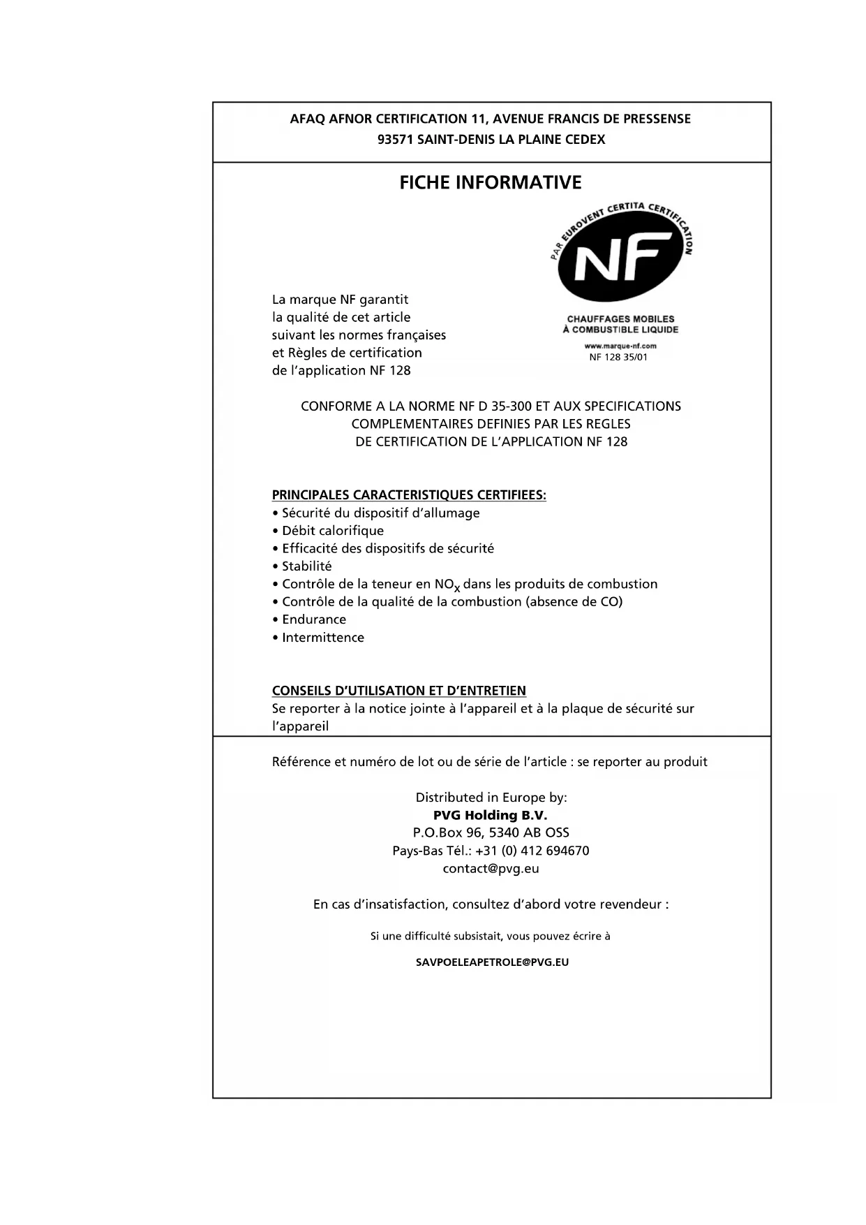 - Kadar naprava ni v uporabi, vedno odstranite vtič iz vtičnice.52 Chère Madame, Cher Monsieur, Nous vous remercions de la confiance que vous avez bien voulu témoigner à notre marque en choisissant un appareil mobile de chauffage à combustible liquide. Vous venez d’acquérir un produit de qualité, qui vous donnera entière satisfaction durant de très nombreuses années. A condition, bien sûr, de res- pecter les consignes d’utilisation. C’est pourquoi nous vous invitons vivement à consulter ce manuel afin d’assurer à votre appareil une durée de vie optimale. Les produits sont garantis contre tout vice de fabrication ou de conception (hors consommables) pendant une durée de 4 ans à compter de leur date d’achat. Nous vous souhaitons beaucoup de chaleur et de confort avec votre appareil. Bien cordialement, PVG Holding b.v. Service-Consommateurs 1 LISEZ PRÉALABLEMENT LE MANUEL D’UTILISATION. 2 EN CAS DE DOUTE, CONTACTEZ VOTRE REVENDEUR.