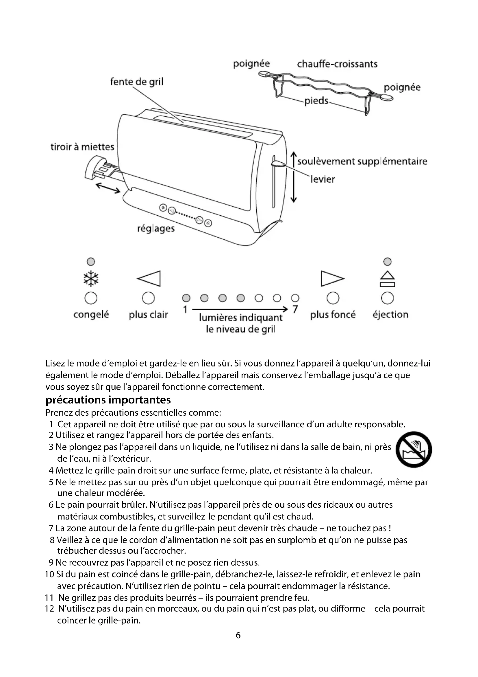 - Il se peut que cela sente un peu, mais cela est normal. Assurez-vous que la pièce soit bien aérée. griller du pain 1 Mettez le grille-pain droit sur une surface ferme, plate, et résistante à la chaleur. 2 Ne le mettez pas sur ou près d’un objet quelconque qui pourrait être endommagé, même par une chaleur modérée. 3 Le pain pourrait brûler. N’utilisez pas l’appareil près de ou sous des rideaux ou autres matériaux combustibles, et surveillez-le pendant qu’il est chaud. 4 Mettez la fiche dans la prise de courant. 5 L’appareil va exécuter automatique un contrôle de routine. 6 Les lumières des quatre niveaux de gril de gauche s’allumeront. 7 Utilisez les boutons à chaque extrémité des lumières du niveau de gril pour éclaircir % ou foncer & le toast. 8 Les lumières du niveau de gril s’allumeront ou s’éteindront pour indiquer le niveau choisi. 9 Plus il y a de lumières allumées, plus le toast sera foncé. 10 Mettez le pain dans la fente à griller (épaisseur maximum: 28 mm). 11 Appuyez fort sur le levier. , Il ne se bloquera pas si le grille-pain n’est pas branché dans une prise de courant. 12 Le décompteur de grillage va se déclancher a) La lumière la plus à droite va se mettre à clignoter, pendant que celles situées sur sa gauche vont rester illuminées. b) Cette lumière va s’éteindre, puis celle située à sa gauche va se mettre à clignoter c) Ceci se répétera jusqu’à l’extinction de toutes les lumières. d) Une fois toutes ces lumières éteintes, le toast sera prêt. mode d’emploi8 ejection $ 13 Pour annuler toutes opération, toucher le symbole $. 14 Le symbole $ s’illuminera, le toast sera éjecté, puis le symbole $ s’éteindra. soulèvement supplémentaire 15 Après avoir grillé des produits de petite taille (bagels, crumpets, etc.), le levier peut être soulevé davantage, pour qu’ils soient retirés plus facilement. pain congelé f 16 Laisser le niveau de grillage réglé à l’accoutumée, insérer le pain congelé dans la fente, puis toucher le symbole f. 17 La lumière f s’allumera, et la durée de gril sera automatiquement changée pour obtenir le même niveau de gril que vous obtenez avec du pain non congelé. chauffe-croissants , Utiliser le chauffe-croissants uniquement sur la position 1. 18 Le chauffe-croissants ne convient pas pour décongeler des croissants, réchauffer des croissants beurrés, fourrés ou enrobés. 19 Placer le chauffe-croissants sur le haut du grille-pain, avec les pieds à l’intérieur de la fente. 20 Placer les croissants sur le chauffe-croissants. 21 Réglez le niveau du gril sur 1 et abaisser le levier. 22 Lorsque la manette monte vers le haut, les croissants sont prêts. 23 Ne pas toucher les fils du chauffe-croissants: risque de brûlure! 24 Retirer le chauffe-croissants avant d’utiliser le grille-pain pour griller du pain. réchauffage du toast 25 Utilisez le réglage le plus bas. Ne réchauffez que du toast tel quel, non beurré. conseils et suggestions 26 Lorsque vous grillez plus d’une tranche de pain, utilisez des tranches de taille, d’épaisseur et de fraîcheur semblables. 27 Le vieux pain (datant de la veille) contient moins d’humidité, ce qui rend le pain plus croustillant. 28 Le pain plus vieux ou plus fin grille plus rapidement que le pain frais ou épais. Utilisez un réglage plus faible. 29 Les produits de pain doux (tea cakes, fruit loaf, etc.) dorent beaucoup plus rapidement que le pain ordinaire, et doivent donc être grillés sur un réglage plus faible. soins et entretien 30 Débranchez le grille pain et laissez-le refroidir. 31 Essuyer les surfaces extérieures à l’aide d’un chiffon humide. 32 Enlevez et videz le tiroir à miettes. Essuyez-le avec un chiffon humide, séchez-le, et remettez- le ensuite dans le grille pain. 33 N’utilisez pas le grille-pain si le tiroir à miettes n’est pas fixé et fermé. 34 N’immergez pas l’appareil dans de l’eau ou autre liquide. 35 N’utilisez pas de produits ou solvants de nettoyage agressifs ou abrasifs. symbole poubelle barrée Ce symbole signifie que l’appareil ne doit pas être jeté avec les autres déchets et qu’il fera l’objet d’une collecte sélective en vue de sa réutilisation, de son recyclage ou de sa valorisation. S’il contient des substances susceptibles de nuire à l’environnement, celles-ci seront éliminées ou neutralisées.910 Lees de instructies en bewaar ze op een veilige plaats. Als u het apparaat aan iemand doorgeeft, geeft u dan ook de instructies mee door. Verwijder alle verpakkingsonderdelen, maar gooi ze pas weg als u zeker weet dat het apparaat goed functioneert. belangrijke veiligheidsmaatregelen Volg de gebruikelijke veiligheidsmaatregelen, zoals: 1 Dit apparaat mag uitsluitend worden gebruikt door of onder toezicht van een volwassene. 2 Het apparaat moet steeds buiten het bereik van kinderen gebruikt en opgeborgen worden. 3 Dit apparaat mag niet in vloeistoffen worden ondergedompeld of in de badkamer, in de buurt van water of in de open lucht worden gebruikt. 4 Zet de broodrooster rechtop op een stevige, vlakke, hittebestendige ondergrond. 5 Zet hem niet op of in de buurt van voorwerpen die zelfs bij matige hitte kunnen beschadigen. 6 Brood kan verbranden. Gebruik het apparaat niet onder of in de buurt van gordijnen of andere brandbare stoffen en houd het apparaat zolang het heet is in de gaten. 7 Rondom de gleuf wordt de broodrooster zeer heet; niet aanraken! 8 Leg het snoer zodanig dat het niet uitsteekt en niemand erover kan struikelen of erachter kan blijven haken. 9 Houd de bovenkant van het apparaat vrij; zet er niets bovenop. 10 Als er brood vast blijft zitten, haalt u de stekker van het apparaat uit het stopcontact, laat u het apparaat afkoelen en haalt u het brood er voorzichtig uit. Gebruik geen scherpe voorwerpen; hierdoor beschadigen de elementen. 11 Rooster behalve tosti’s geen beboterde etenswaren; ze kunnen vlam vatten. 12 Gebruik g