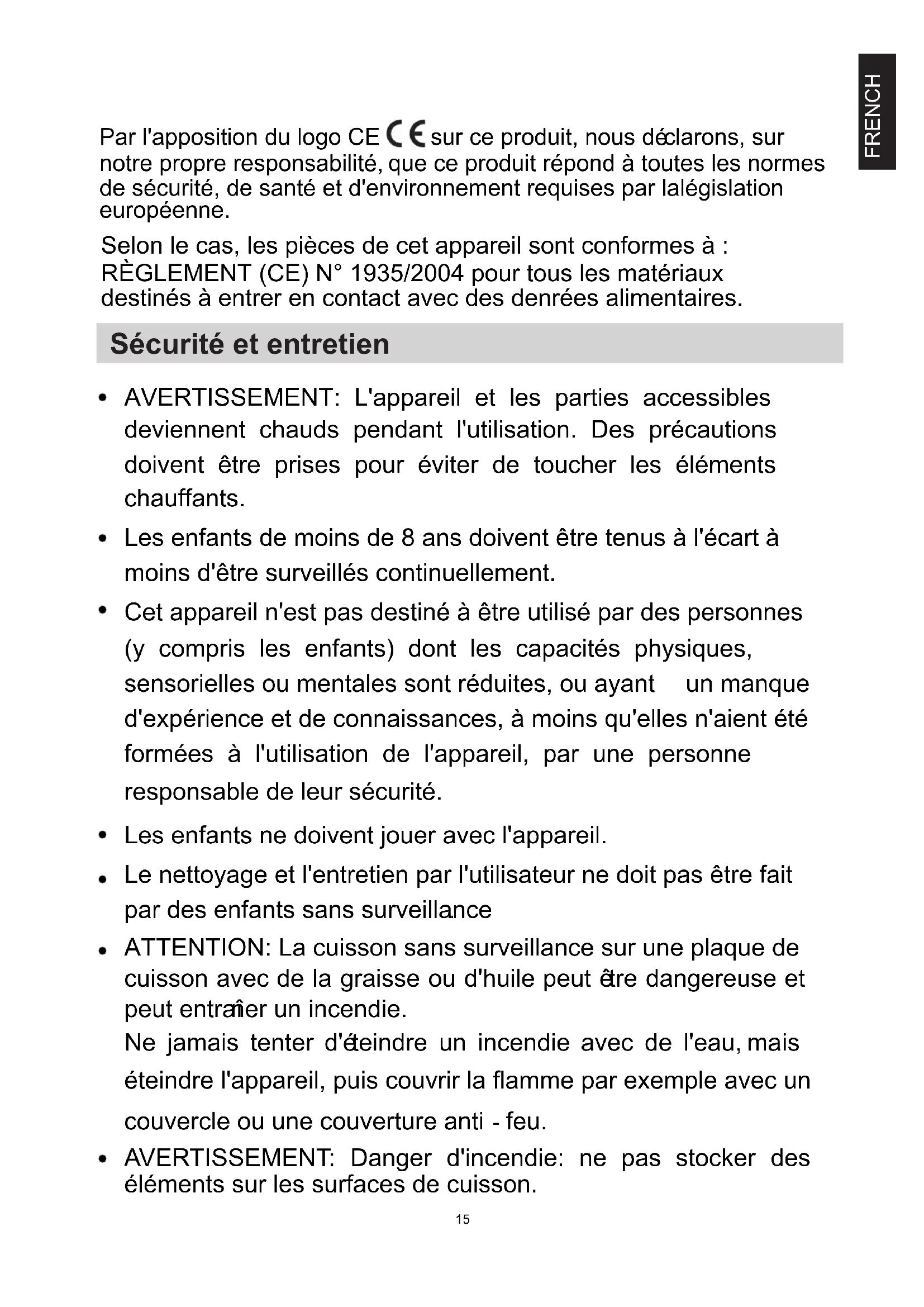 14AVERTISSEMENT: L'appareil et les parties accessibles deviennent chauds pendant l'utilisation. Des précautions doivent être prises pour éviter de toucher les éléments chauffants. Les enfants de moins de 8 ans doivent être tenus à l'écart à moins d'être surveillés continuellement. Cet appareil n'est pas destiné à être utilisé par des personnes (y compris les enfants) dont les capacités physiques, sensorielles ou mentales sont réduites, ou ayant un manque d'expérience et de connaissances, à moins qu'elles n'aient été formées à l'utilisation de l'appareil, par une personne responsable de leur sécurité. Les enfants ne doivent jouer avec l'appareil. Le nettoyage et l'entretien par l'utilisateur ne doit pas être fait par des enfants sans surveillance. ATTENTION: La cuisson sans surveillance sur une plaque de cuisson avec de la graisse ou d'huile peut être dangereuse et peut entraîner un incendie. Ne jamais tenter d'éteindre un incendie avec de l'eau, mais éteindre l'appareil, puis couvrir la flamme par exemple avec un couvercle ou une couverture anti - feu.