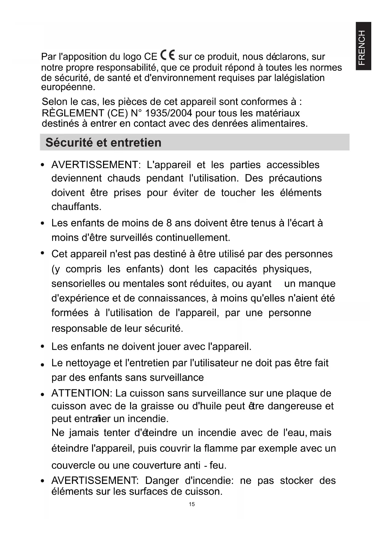 14AVERTISSEMENT: L'appareil et les parties accessibles deviennent chauds pendant l'utilisation. Des précautions doivent être prises pour éviter de toucher les éléments chauffants. Les enfants de moins de 8 ans doivent être tenus à l'écart à moins d'être surveillés continuellement. Cet appareil n'est pas destiné à être utilisé par des personnes (y compris les enfants) dont les capacités physiques, sensorielles ou mentales sont réduites, ou ayant un manque d'expérience et de connaissances, à moins qu'elles n'aient été formées à l'utilisation de l'appareil, par une personne responsable de leur sécurité. Les enfants ne doivent jouer avec l'appareil. Le nettoyage et l'entretien par l'utilisateur ne doit pas être fait par des enfants sans surveillance. ATTENTION: La cuisson sans surveillance sur une plaque de cuisson avec de la graisse ou d'huile peut être dangereuse et peut entraîner un incendie. Ne jamais tenter d'éteindre un incendie avec de l'eau, mais éteindre l'appareil, puis couvrir la flamme par exemple avec un couvercle ou une couverture anti - feu.