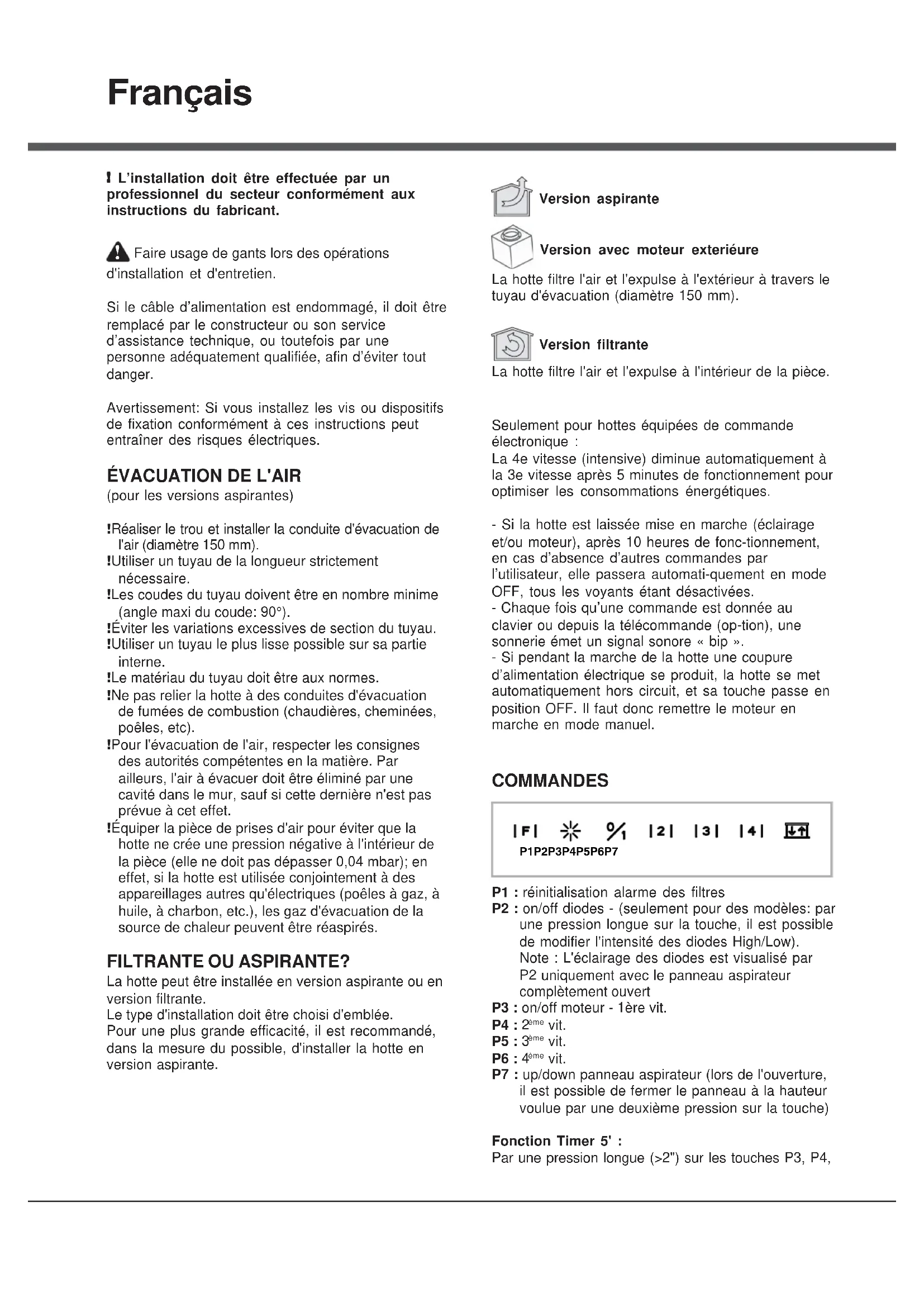 (pour les versions aspirantes) ! Réaliser le trou et installer la conduite d'évacuation de l'air (diamètre 150 mm). ! Utiliser un tuyau de la longueur strictement nécessaire. ! Les coudes du tuyau doivent être en nombre minime (angle maxi du coude: 90°). ! Éviter les variations excessives de section du tuyau. ! Utiliser un tuyau le plus lisse possible sur sa partie interne. ! Le matériau du tuyau doit être aux normes. ! Ne pas relier la hotte à des conduites d'évacuation de fumées de combustion (chaudières, cheminées, poêles, etc). ! Pour l'évacuation de l'air, respecter les consignes des autorités compétentes en la matière. Par ailleurs, l'air à évacuer doit être éliminé par une cavité dans le mur, sauf si cette dernière n'est pas prévue à cet effet. ! Équiper la pièce de prises d'air pour éviter que la hotte ne crée une pression négative à l'intérieur de la pièce (elle ne doit pas dépasser 0,04 mbar); en effet, si la hotte est utilisée conjointement à des appareillages autres qu'électriques (poêles à gaz, à huile, à charbon, etc.), les gaz d'évacuation de la source de chaleur peuvent être réaspirés. FILTRANTE OU ASPIRANTE? La hotte peut être installée en version aspirante ou en version filtrante. Le type d'installation doit être choisi d'emblée. Pour une plus grande efficacité, il est recommandé, dans la mesure du possible, d'installer la hotte en version aspirante. Version aspirante Version avec moteur exteriéure La hotte filtre l'air et l'expulse à l'extérieur à travers le tuyau d'évacuation (diamètre 150 mm). Version filtrante La hotte filtre l'air et l'expulse à l'intérieur de la pièce. Seulement pour hottes équipées de commande électronique : La 4e vitesse (intensive) diminue automatiquement à la 3e vitesse après 5 minutes de fonctionnement pour optimiser les consommations énergétiques. - Si la hotte est laissée mise en marche (éclairage et/ou moteur), après 10 heures de fonc-tionnement, en cas d’absence d’autres commandes par l’utilisateur, elle passera automati-quement en mode OFF, tous les voyants étant désactivées. - Chaque fois qu’une commande est donnée au clavier ou depuis la télécommande (op-tion), une sonnerie émet un signal sonore « bip ». - Si pendant la marche de la hotte une coupure d’alimentation électrique se produit, la hotte se met automatiquement hors circuit, et sa touche passe en position OFF. Il faut donc remettre le moteur en marche en mode manuel. COMMANDES P1 P2 P3 P4 P5 P6 P7 P1 : réinitialisation alarme des filtres P2 : on/off diodes - (seulement pour des modèles: par une pression longue sur la touche, il est possible de modifier l'intensité des diodes High/Low). Note : L'éclairage des diodes est visualisé par P2 uniquement avec le panneau aspirateur complètement ouvert P3 : on/off moteur - 1ère vit. P4 : 2 ème vit. P5 : 3 ème vit. P6 : 4 ème vit. P7 : up/down panneau aspirateur (lors de l'ouverture, il est possible de fermer le panneau à la hauteur voulue par une deuxième pression sur la touche) Fonction Timer 5' : Par une pression longue (>2") sur les touches P3, P4,P5 ou P6, on active la fonction Timer 5'. Une fois ce temps écoulé, le moteur s'arrête et le chariot se ferme. Les éclairages passent de l'intensité High à l'intensité Low. Lorsque la fonction est activée la diode correspondant à la vitesse en cours du moteur, clignote. Affichage alarme des filtres : Filtres à graisse : Après 30 h de fonctionnement du moteur, la diode de la touche P1 s'allume pendant 30'' toutes les fois que le moteur s'arrête. Filtre à charbon : Après 120 h de fonctionnement du moteur, la diode de la touche P1 clignote pendant 30'' toutes les fois que le moteur s'arrête. COMMANDES P1 : réinitialisation alarme des filtres P2 : on/off moteur - 1ère vit. P3 : 2 ème vit. P4 : 3 ème vit. P5 : 4 ème vit. P6 : up/down panneau aspirateur (lors de l'ouverture, il est possible de fermer le panneau à la hauteur voulue par une deuxième pression sur la touche) Fonction Timer 5' : Par une pression longue (>2") sur les touches P2, P3, P4 ou P5, on active la fonction Timer 5'. Une fois ce temps écoulé, le moteur s'arrête et le chariot se ferme. Les éclairages passent de l'intensité High à l'intensité Low. Lorsque la fonction est activée la diode correspondant à la vitesse en cours du moteur, clignote. Affichage alarme des filtres : Filtres à graisse : Après 30 h de fonctionnement du moteur, la diode de la touche P1 s'allume pendant 30'' toutes les fois que le moteur s'arrête. Filtre à charbon : Après 120 h de fonctionnement du moteur, la diode de la touche P1 clignote pendant 30'' toutes les fois que le moteur s'arrête. COMMANDES P1 : on/off moteur - 1ère vit. P2 : 2 ème vit. P3 : 3 ème vit. P4 : 4 ème vit. P5 : up/down panneau aspirateur (lors de l'ouverture, il est possible de fermer le panneau à la hauteur voulue par une deuxième pression sur la touche) Fonction Timer 5' : Avec le moteur allumé, par une pression longue sur les touches P1-P4 (selon la vitesse paramétrée), on active la fonction Timer 5'. Lorsque cette fonction est activée la diode correspondant à la vitesse (L1-L4) clignote. Après 5' le moteur s'arrête et le chariot se bloque. Affichage alarme des filtres : Après 30h de fonctionnement du moteur, les diodes L1-L5 s'allument pendant 30'' toutes les fois que le moteur s'arrête. Après 120h de fonctionnement du moteur, la diode L1-L5 clignotent pendant 30'' toutes les fois que le moteur s'arrête. Pour la REINITIALISATION de l'alarme, il faut appuyer sur l'une des touches P1-P5 pendant 2" lors de la visualisation de l'alarme.