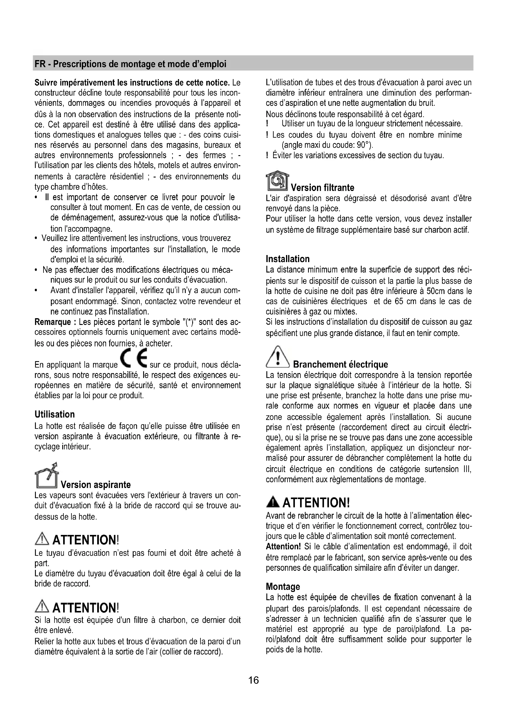 - EMC: EN 55014-1; CISPR 14-1; EN 55014-2; CISPR 14-2; EN/IEC 61000-3-2; EN/IEC 61000-3-3. Suggestions for a correct use in order to reduce the environmental impact: Switch ON the hood at minimum speed when you start coo- king and kept it running for few minutes after cooking is fini- shed. Increase the speed only in case of large amount of smoke and vapor and use boost speed(s) only in extreme situations. Replace the charcoal filter(s) when necessary to maintain a good odor reduction efficiency. Clean the grease filter(s) when necessary to maintain a good grease filter effi- ciency. Use the maximum diameter of the ducting system indicated in this manual to optimize efficiency and minimize noise.16 FR - Prescriptions de montage et mode d’emploi Suivre impérativement les instructions de cette notice. Le constructeur décline toute responsabilité pour tous les incon- vénients, dommages ou incendies provoqués à l’appareil et dûs à la non observation des instructions de la présente noti- ce. Cet appareil est destiné à être utilisé dans des applica- tions domestiques et analogues telles que : - des coins cuisi- nes réservés au personnel dans des magasins, bureaux et autres environnements professionnels ; - des fermes ; - l’utilisation par les clients des hôtels, motels et autres environ- nements à caractère résidentiel ; - des environnements du type chambre d’hôtes.