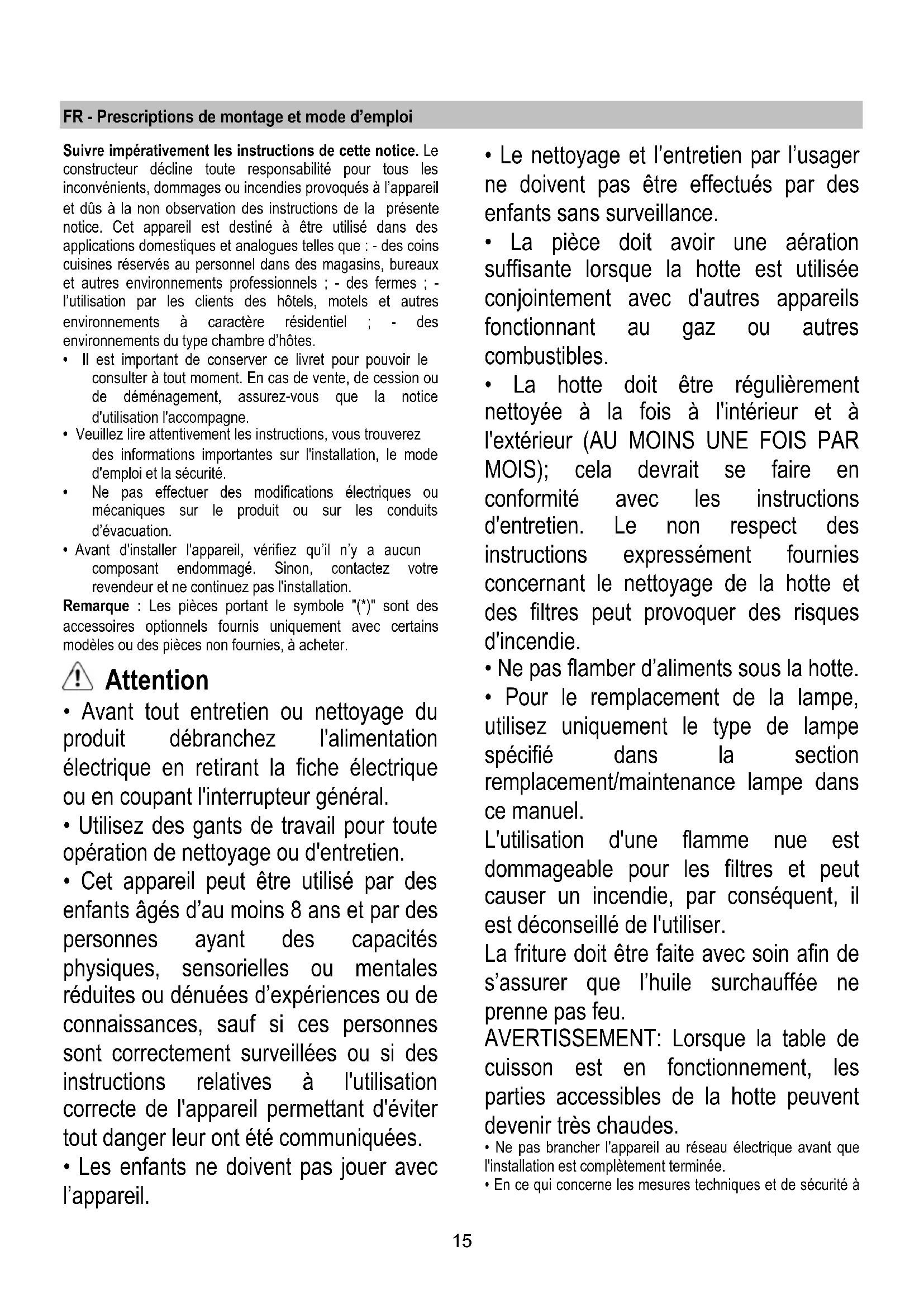 Put the grill back. If the lights do not work, make sure that the lamps are fitted properly into their housings before you call for technical assistance.15 FR - Prescriptions de montage et mode d’emploi Suivre impérativement les instructions de cette notice. Le constructeur décline toute responsabilité pour tous les inconvénients, dommages ou incendies provoqués à l’appareil et dûs à la non observation des instructions de la présente notice. Cet appareil est destiné à être utilisé dans des applications domestiques et analogues telles que : - des coins cuisines réservés au personnel dans des magasins, bureaux et autres environnements professionnels ; - des fermes ; - l’utilisation par les clients des hôtels, motels et autres environnements à caractère résidentiel ; - des environnements du type chambre d’hôtes.