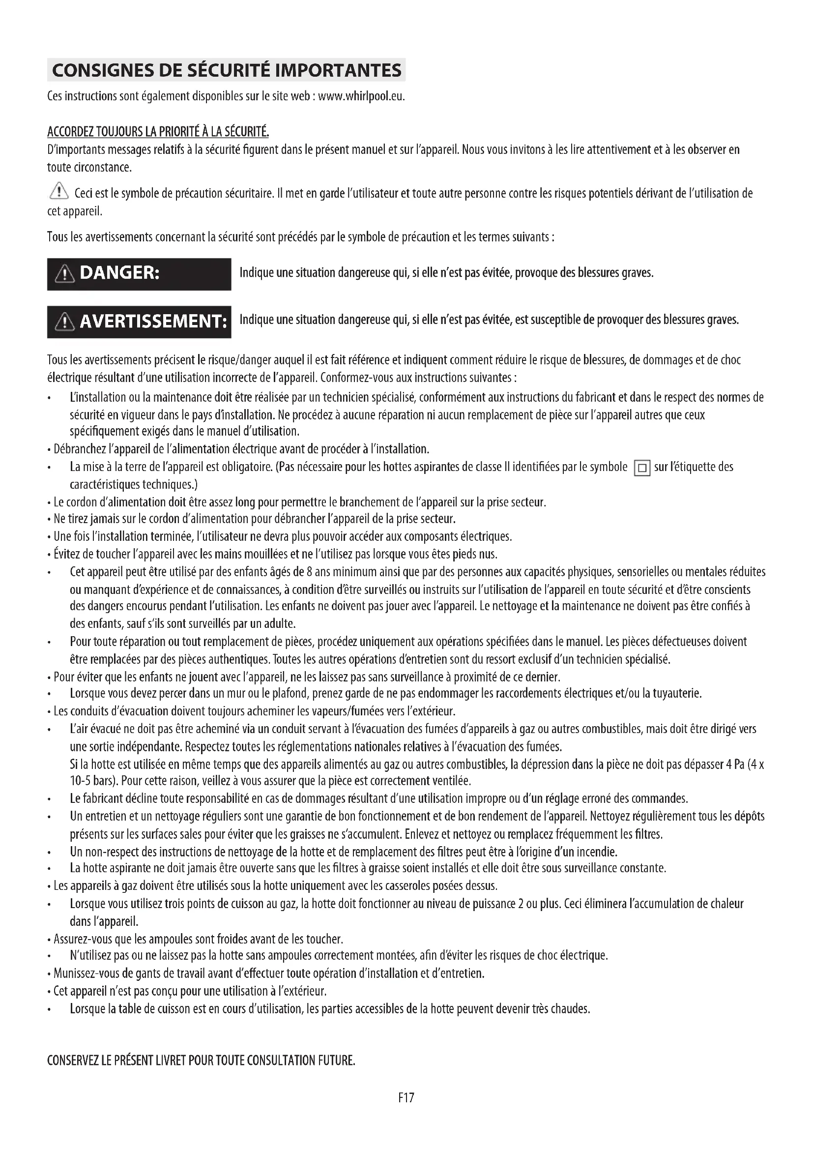 Ces instructions sont également disponibles sur le site web : www.whirlpool.eu. ACCORDEZ TOUJOURS LA PRIORITÉ À LA SÉCURITÉ. D’importants messages relatifs à la sécurité gurent dans le présent manuel et sur l’appareil. Nous vous invitons à les lire attentivement et à les observer en toute circonstance. Ceci est le symbole de précaution sécuritaire. Il met en garde l’utilisateur et toute autre personne contre les risques potentiels dérivant de l’utilisation de cet appareil. Tous les avertissements concernant la sécurité sont précédés par le symbole de précaution et les termes suivants : Indique une situation dangereuse qui, si elle n’est pas évitée, provoque des blessures graves. Indique une situation dangereuse qui, si elle n’est pas évitée, est susceptible de provoquer des blessures graves. Tous les avertissements précisent le risque/danger auquel il est fait référence et indiquent comment réduire le risque de blessures, de dommages et de choc électrique résultant d’une utilisation incorrecte de l’appareil. Conformez-vous aux instructions suivantes :