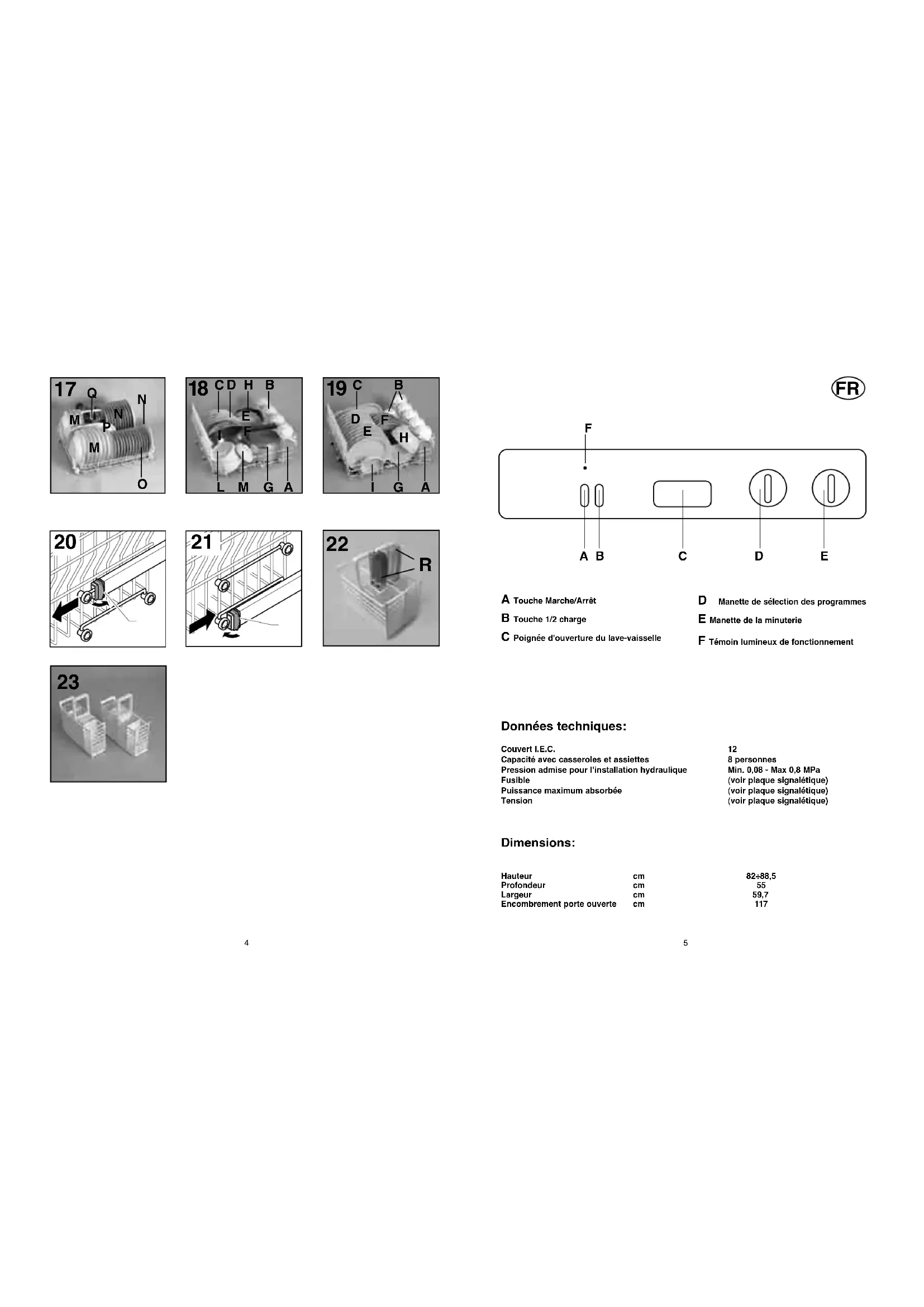 d'origine (fig. 21). Cette opération permet de charger dans le panier supérieur de la vaisselle d'un diamètre de plus de 20 cm et ne permet pas d'utiliser les supports mobiles en position haute. Charger la vaisselle Chargement de la vaisselle Pour garantir constamment d'excellents résul- tats de lavage, éliminer la plus grosse partie des restes (os, arêtes, curedents, restes de viande et de légumes, peaux de fruits, etc.) afin d'éviter d'obstruer les filtres, la vidange et les gicleurs des bras de lavage, causant la diminution de l'efficacité de lavage. Eviter de rincer la vaisselle avant de la placer dans la machine. Si les poêles et les casseroles sont excessive- ment incrustées de restes de mets brûlés, nous vous conseillons de les laisser tremper avant le lavage. Utilisation du panier supérieur Le panier supérieur est pourvu de supports mobiles accrochés au bord latéral et pouvant occuper deux positions: haute et basse. Sur la position basse les supports servent pour recevoir les tasses à thé, à café, les couteaux longs et les louches. Aux extrémités des supports, vous pouvez suspendre les verres à pied. En-dessous vous pouvez ranger les verres, les tasses, les soucoupes et les assiettes à dessert. Quand les supports occupent la position haute, ils permettent de placer les assiettes plates et creuses. Ayez soin de placer les assiettes creuses ver- ticalement et en tournant leur partie concave vers l'avant de la machine; laisser toujours de l'espace entre chaque assiette pour que l'eau circule librement. Pour exploiter au maximum la capacité du panier nous vous conseillons de grouper les assiettes de même forme. Les assiettes peuvent être placées sur une seule rangée (fig. 13) ou sur les deux rangées (fig. 14). Nous vous conseillons de ranger les plats de grande dimension, dont le diamètre est d'environ 270 mm, légèrement inclinés vers l'avant de façon à favoriser l'introduction du panier à l'intérieur de la machine. Dans le panier supérieur vous pouvez ranger différente vaisselle comme le saladier et les bols en plastique qu'il vaut mieux bloquer afin d'éviter que les jets d'eau ne les renversent. Le panier supérieur a été conçu pour permet- tre une souplesse maximum d'utilisation. Il peut n'être chargé qu'avec des assiettes placées sur deux rangées, 24 pièces maxi- mum, avec des verres sur cinq rangées, 30 pièces maximum, ou bien avec de la vaisselle mixte. Utilisation du panier inférieur Dans le panier inférieur vous placerez les cas- seroles, les poêles, les soupières, les sala- diers, les couvercles, les plats, les assiettes plates et creuses et les louches. Les couverts doivent être placés manche vers le bas dans le panier à couverts, que l'on pla- cera à son tour dans le panier inférieur (fig. 15) en s'assurant qu'il n'entrave pas la rotation des bras de lavage. Un chargement standard journalier est indiqué fig. 13, 14 et 15. panier supérieur (fig. 13) A = assiettes creuses B = assiettes plates C = assiettes à dessert D = soucoupes E = tasses F = verres1514 panier supérieur (fig. 14) A = assiettes creuses B = assiettes plates C = assiettes à dessert D = soucoupes E = tasses F = verres à pied G = verres H = demi panier couverts panier inférieur (fig. 15) A = casserole moyenne B = casserole grande C = poêle D = couvercles E = soupières, plats F = couverts G = plats à rôtis Le rangement rationnel et correct de la vais- selle est la condition essentielle pour obtenir un excellent lavage. Chargement standard 12 couverts interna- tionaux (conformément à I.E.C. 436 - EN 50242). Le rangement correct du chargement est indi- qué fig. 16 pour le panier supérieur et fig. 17 pour le panier inférieur. Fig. 22 panier à cou- verts. panier supérieur (fig. 16) A = 5 + 5 + 2 verres B = 12 soucoupes C = 4 + 4 + 4 tasses D = coupe petite E = coupe moyenne F = coupe grande G = 1 + 1 fourchette H = 1 + 1 cuillère à soupe I = 3+3+3+3 cuillère à dessert L = 3+3+3+3 cuillère à café panier inférieur (fig. 17) M = 8 + 4 assiettes creuses N = 11 + 1 assiettes plates O = 12 assiettes à dessert P = plat Q = couverts panier à couverts (fig. 22) Disposer 6+6 couteaux (R) dans les grilles. Dans les autres compartiments, mettre les autres couverts manche vers le bas; éviter de mettre plus de deux couverts identiques dans le même compartiment. panier à couverts (fig. 23) Le panier à couverts est formé de deux parties offrant ainsi différentes possibilités de charge- ment. La séparation en deux parties du panier se fait en faisant glisser, dans le sens horizontal, les deux parties l'une par rapport à l'autre et vice versa pour les ré-enclencher. Lavage 1/2 charge panier supérieur 1/2 charge mixte (fig. 18) A = verres B = tasses C = assiettes creuses D = assiettes plates E = assiettes à dessert F = soucoupes G = casserole H = couvercle I =poéle L = coupe moyenne M = petite coupe 1/2 charge standard (fig. 19) A = 6 verres B = 5 + 1 tasses C = plat D =6 assiettes creuses E =6 assiettes plates F =6 assiettes à dessert G =6 soucoupes H = coupe moyenne I = petite coupe Les couverts doivent être placés dans le panier à couverts prévu a cet effet. Il devra être remis dans son emplacement d'origine, soit dans le panier inférieur, en cycle de lava- ge normal. Information pour les essais en laboratoire. Programme comparatif général (voir liste des programmes de lavage) Selon norme IEC 436: