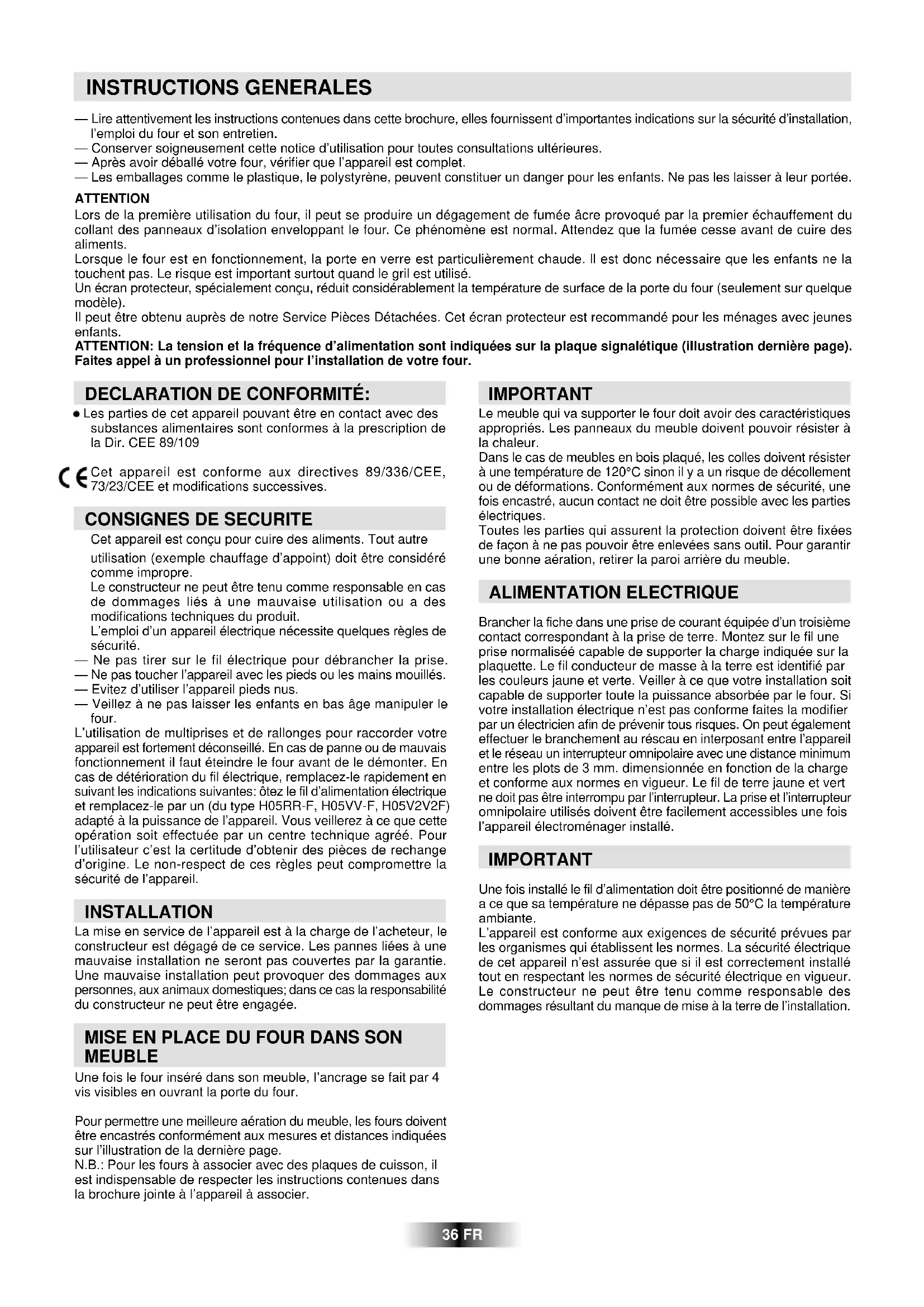 Cet appareil est conçu pour cuire des aliments. Tout autre utilisation (exemple chauffage d’appoint) doit être considéré comme impropre. Le constructeur ne peut être tenu comme responsable en cas de dommages liés à une mauvaise utilisation ou a des modifications techniques du produit. L’emploi d’un appareil électrique nécessite quelques règles de sécurité. — Ne pas tirer sur le fil électrique pour débrancher la prise. — Ne pas toucher l’appareil avec les pieds ou les mains mouillés. — Evitez d’utiliser l’appareil pieds nus. — Veillez à ne pas laisser les enfants en bas âge manipuler le four. L’utilisation de multiprises et de rallonges pour raccorder votre appareil est fortement déconseillé. En cas de panne ou de mauvais fonctionnement il faut éteindre le four avant de le démonter. En cas de détérioration du fil électrique, remplacez-le rapidement en suivant les indications suivantes: ôtez le fil d’alimentation électrique et remplacez-le par un (du type H05RR-F, H05VV-F, H05V2V2F) adapté à la puissance de l’appareil. Vous veillerez à ce que cette opération soit effectuée par un centre technique agréé. Pour l’utilisateur c’est la certitude d’obtenir des pièces de rechange d’origine. Le non-respect de ces règles peut compromettre la sécurité de l’appareil. INSTALLATION La mise en service de l’appareil est à la charge de l’acheteur, le constructeur est dégagé de ce service. Les pannes liées à une mauvaise installation ne seront pas couvertes par la garantie. Une mauvaise installation peut provoquer des dommages aux personnes, aux animaux domestiques; dans ce cas la responsabilité du constructeur ne peut être engagée. MISE EN PLACE DU FOUR DANS SON MEUBLE Une fois le four inséré dans son meuble, I’ancrage se fait par 4 vis visibles en ouvrant la porte du four. Pour permettre une meilleure aération du meuble, les fours doivent être encastrés conformément aux mesures et distances indiquées sur l’illustration de la dernière page. N.B.: Pour les fours à associer avec des plaques de cuisson, il est indispensable de respecter les instructions contenues dans la brochure jointe à l’appareil à associer. 36 FRNe jamais utiliser de grattoir, de produit chimique pour nettoyer la catalyse. Utilisez plutôt de l’eau chaude et une éponge. Si jamais vous cuisinez un plat très gras ou une viande au gril, utiliser un plat avec de grands rebords pour limiter les projections de graisse. La porosité de la catalyse est primordiale pour vous assurer un nettoyage optimal. N.B.: Les panneaux autonettoyants ont une durée de fonctionnement d’environ 300 heures. En cas de baisse d’efficacité il est alors possible de les changer.