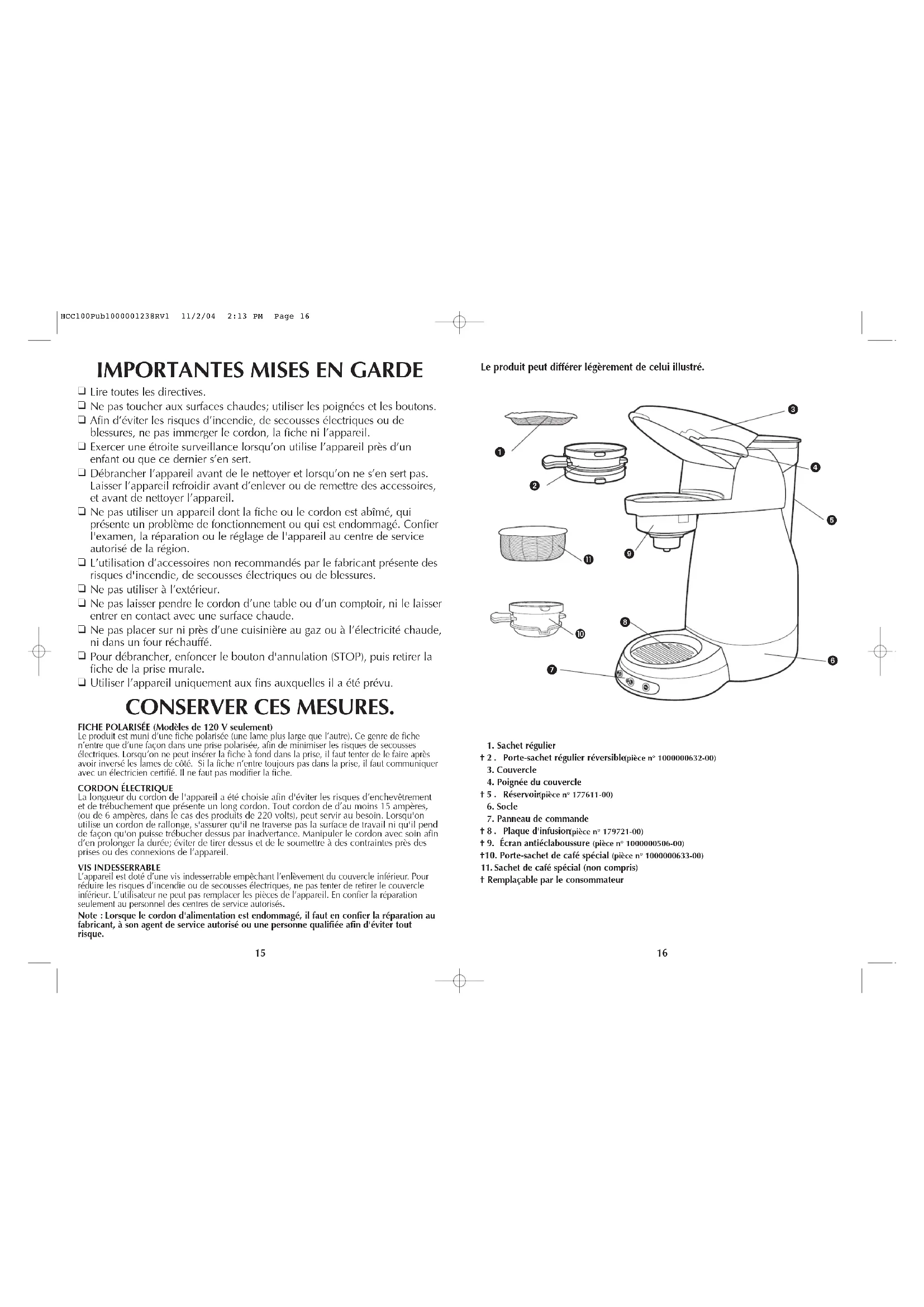 . Des sachets de café spéciaux seront bientôt en vente. Consulter le site www.homecafe.com (en anglais seulement) pour obtenir de plus amples renseignements. Q. Que puis-je faire pour empêcher les éclaboussures qui surviennent à l'occasion? R Il peut y avoir des éclaboussures selon le type de tasse utilisée. Pour minimiser les éclaboussures, utiliser une chope haute. En cas d'éclaboussures, ne pas rester près de l'appareil afin d'éviter les brûlures. Q. Pourquoi y a-t-il deux porte-sachets différents avec l'appareil? R. Le porte-sachet réversible sert pour les sachets de café régulier. La partie moins profonde sert pour un sachet et la partie profonde accepte deux sachet. L'autre porte-sachets sert pour les sachets de cafés spéciaux. Consulter le site www.homecafe.com (en anglais seulement) pour obtenir de plus amples renseignements. Q. Puis-je infuser des sachet de café ordinaire dans le porte-sachet de café spécial? R. Non. Le porte-sachet de café spécial est conçu spécialement pour les sachets de café spécial. Q. Puis-je infuser des sachets de café spécial dans le porte-sachet de café ordinaire? R. Non. Les sachets de café spécial ne s'insèrent que dans le porte-sachet de café spécial. Q. Puis-je préparer une tasse de 266 ou de 414 ml (7 ou 9 oz) de café spécial? R. Il faut préparer les sachets de café spécial au réglage de 207 ml (7 oz) pour maximiser la saveur et la consistance du café Q. Puis-je réutiliser un sachet de café? A. Il n'est pas conseillé de les réutiliser. L'extraction du café est bien meilleure à la première infusion. HCC100Pub1000001238RV1 11/2/04 2:13 PM Page 2022