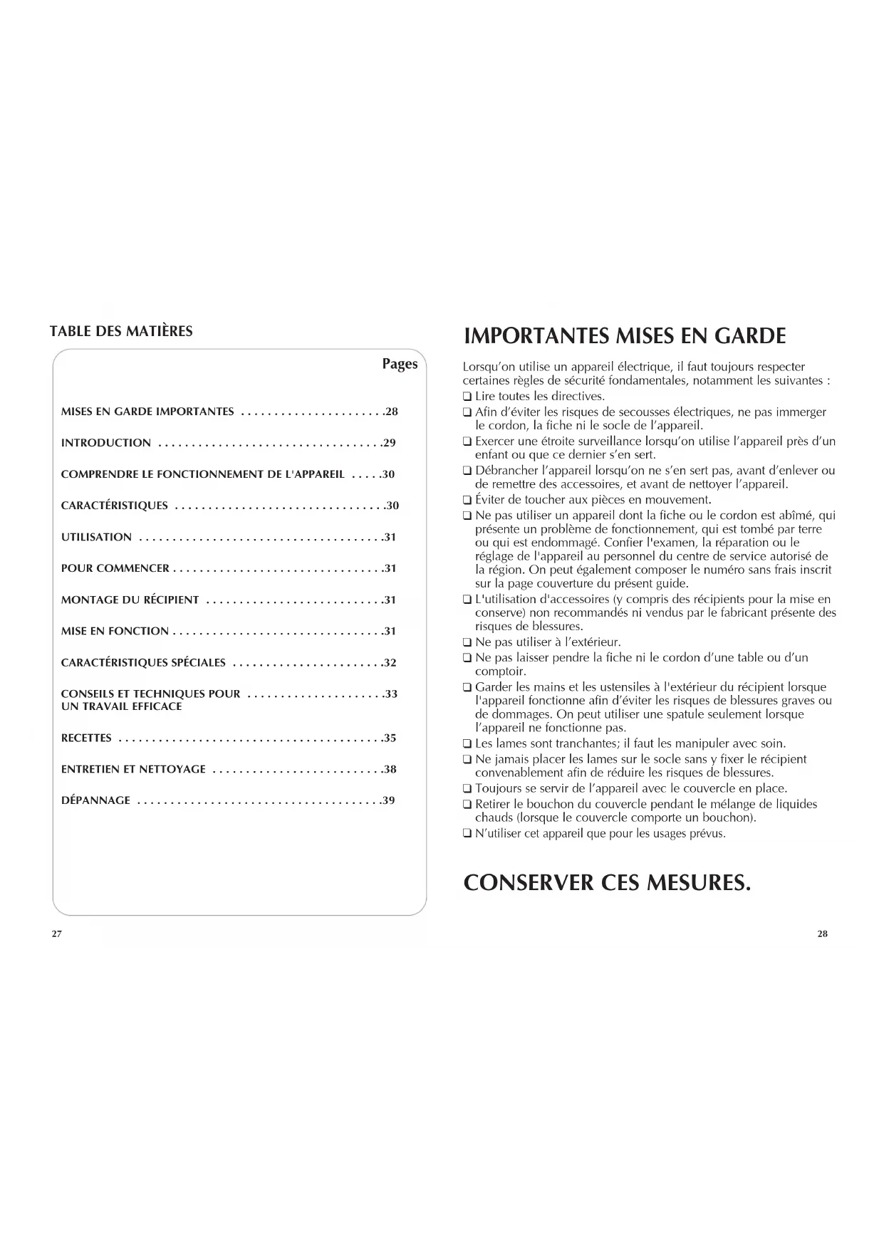 Retirer le bouchon du couvercle pendant le mélange de liquides chauds (lorsque le couvercle comporte un bouchon). ❑ N’utiliser cet appareil que pour les usages prévus. CONSERVER CES MESURES. BLP5600GMUC 6/11/07 9:56 AM Page 2829
