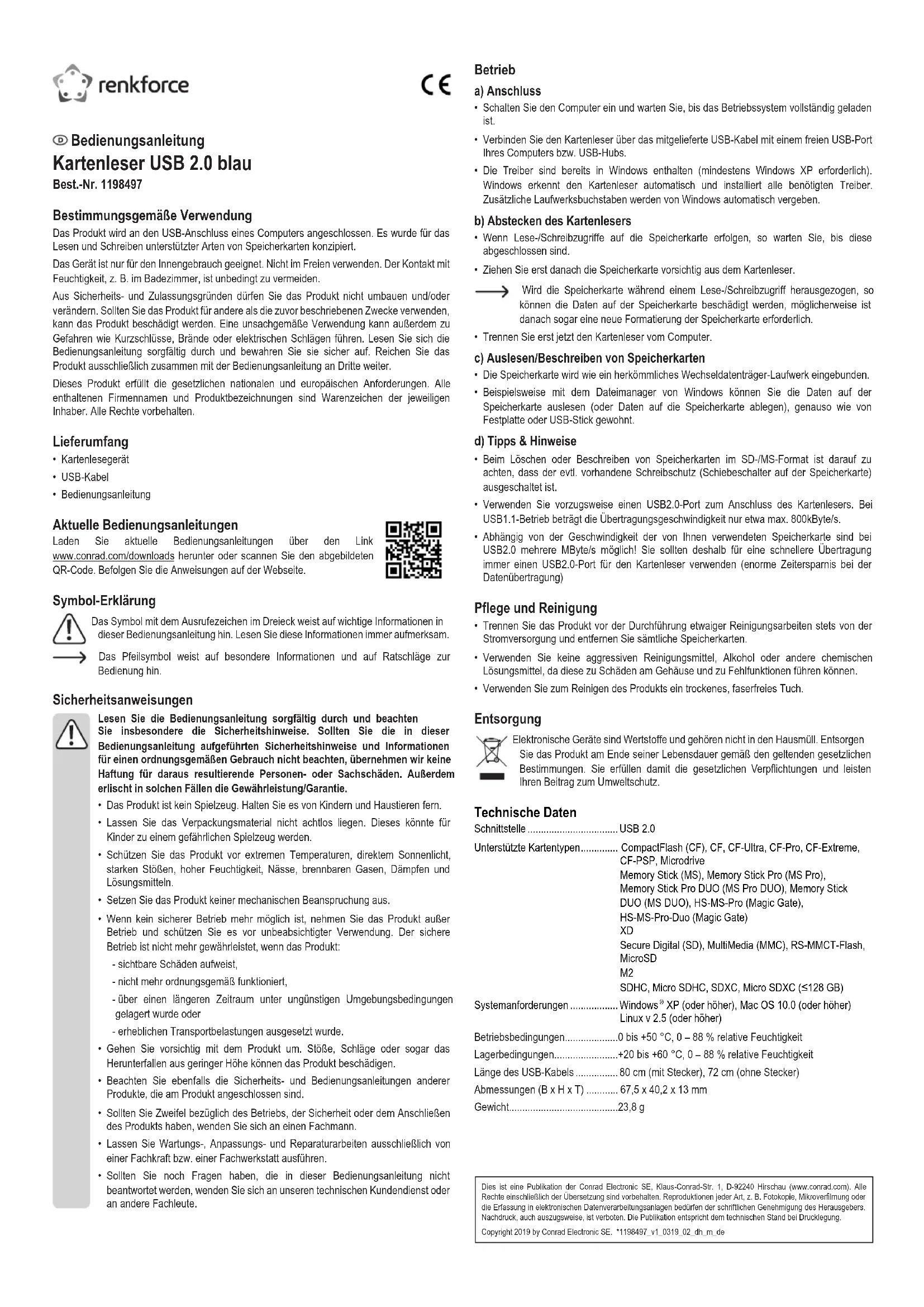 USB 2.0 1198497 - Lecteur de mémoire Renkforce - Notice d'utilisation et mode d'emploi gratuit