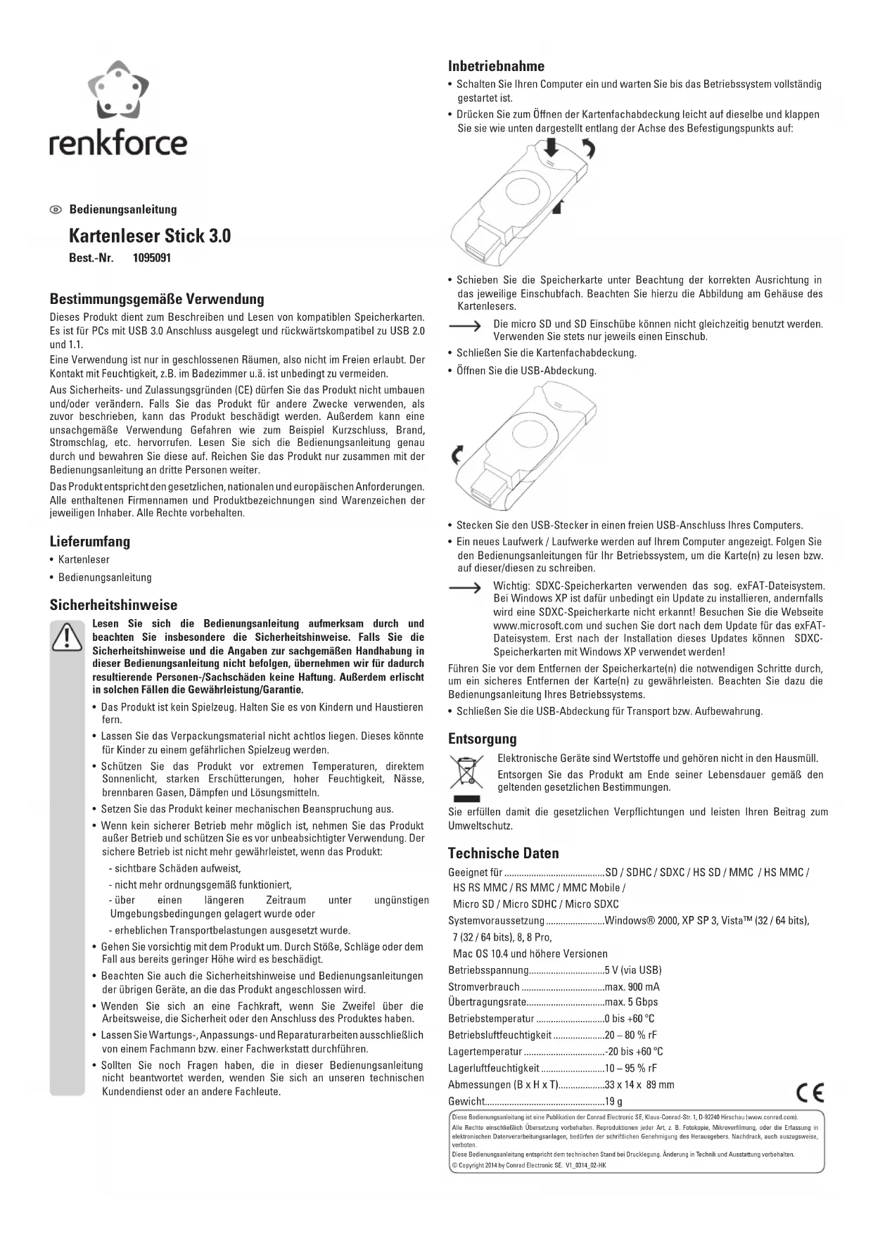 - Close the USB cover for travelling or storage. Disposal Electronic devices are recyclable waste and must not be disposed of in the household waste. At the end of its service life, dispose of the product according to the relevant statutory regulations. You thus full your statutory obligations and contribute to the protection of the environment. Technical data Suitable for ........................................... SD / SDHC / SDXC / HS SD / MMC / HS MMC / HS RS MMC / RS MMC / MMC Mobile / Micro SD / Micro SDHC / Micro SDXC System requirements .........................Windows® 2000, XP SP 3, Vista™ (32 / 64 bits), 7 (32 / 64 bits), 8, 8 Pro, Mac OS 10.4 or above Operating voltage................................5 V/DC (via USB) Current consumption .......................... max. 900 mA Transmission rate ................................max. 5 Gbps Operating temperature.......................0 to +60 ºC Operating humidity..............................20 – 80 % RH Storage temperature ..........................-20 to +60 ºC Storage humidity .................................10 – 95 % RH Dimensions (W x H x D)......................33 x 14 x 89 mm Weight ...................................................19 g These operating instructions are published by Conrad Electronic SE, Klaus-Conrad-Str. 1, D-92240 Hirschau (www.conrad.com). All rights including translation reserved. Reproduction by any method, e.g. photocopy, microlming, or the capture in electronic data processing systems require the prior written approval by the editor. Reprinting, also in part, is prohibited. These operating instructions represent the technical status at the time of printing. Changes in technology and equipment reserved. © Copyright 2014 by Conrad Electronic SE. V1_0314_02-HKMode d‘emploi Memory stick multi-cartes 3.0 Nº de commande 1095091 Utilisation prévue Le produit est conçu pour la lecture et l’écriture sur des cartes mémoire compatibles. Il a été conçu pour un ordinateur (PC) doté d’une connexion USB 3.0 et est rétro compatible avec USB 2.0 et 1.1. L’utilisation est uniquement autorisée en intérieur, dans les locaux fermés ; l’utilisation en plein air est interdite. Impérativement éviter tout contact avec l’humidité, par ex. dans la salle de bains, etc. Pour des raisons de sécurité et d’homologation (CE), toute transformation et/ou modication du produit est interdite. Si vous utilisez le produit à d’autres ns que celles décrites précédemment, cela risque d’endommager le produit. Par ailleurs, une utilisation incorrecte peut être source de dangers tels que court-circuit, incendie, électrocution. Lisez attentivement le mode d’emploi et conservez le. Ne transmettez le produit à des tiers qu’accompagné de son mode d’emploi. Le produit est conforme aux exigences des directives européennes et nationales en vigueur. Tous les noms d’entreprises et appellations de produits contenus dans ce mode d’emploi sont des marques déposées des propriétaires correspondants. Tous droits réservés. Contenu d’emballage