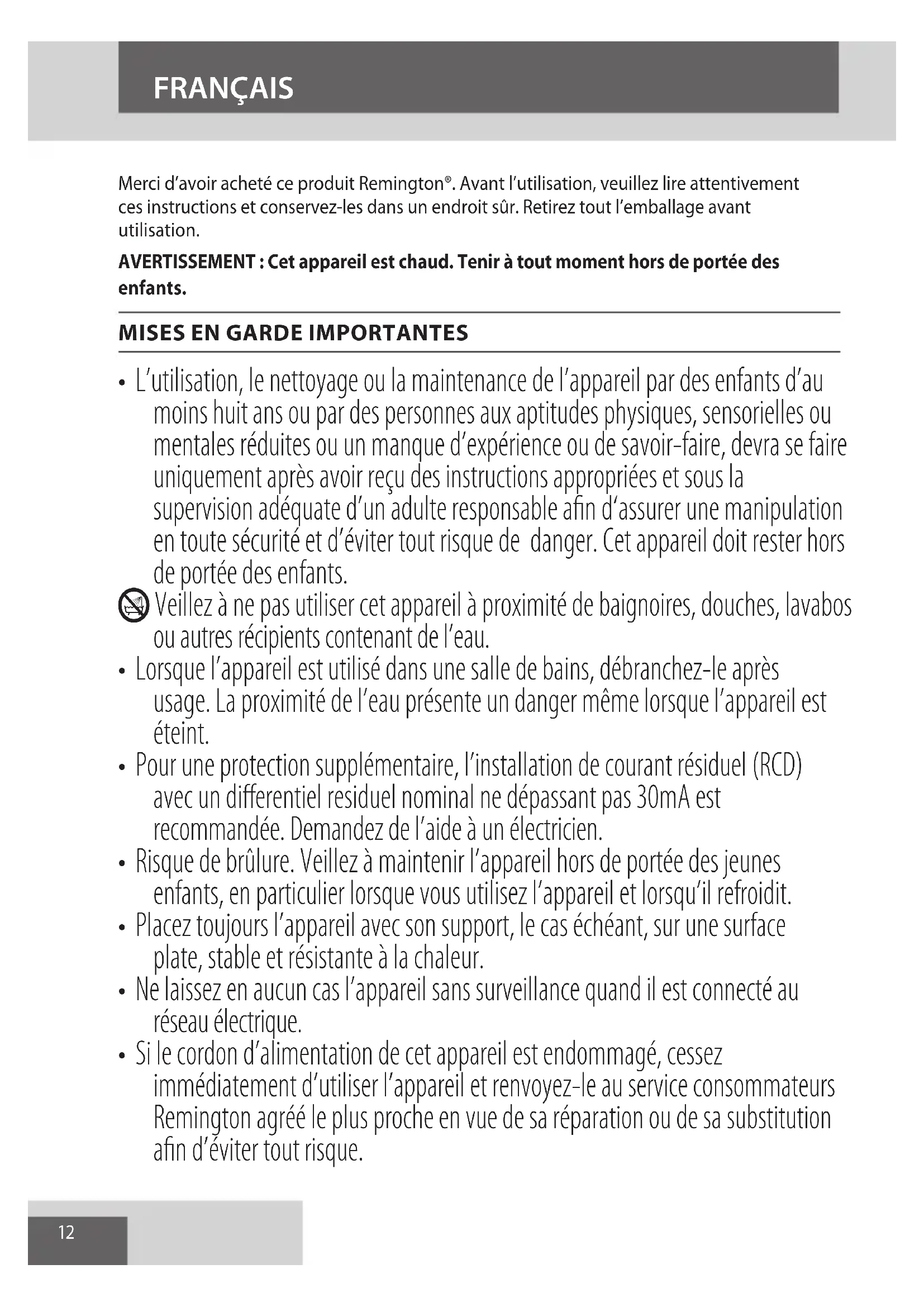 AE12 Merci d’avoir acheté ce produit Remington®. Avant l’utilisation, veuillez lire attentivement ces instructions et conservez-les dans un endroit sûr. Retirez tout l’emballage avant utilisation.