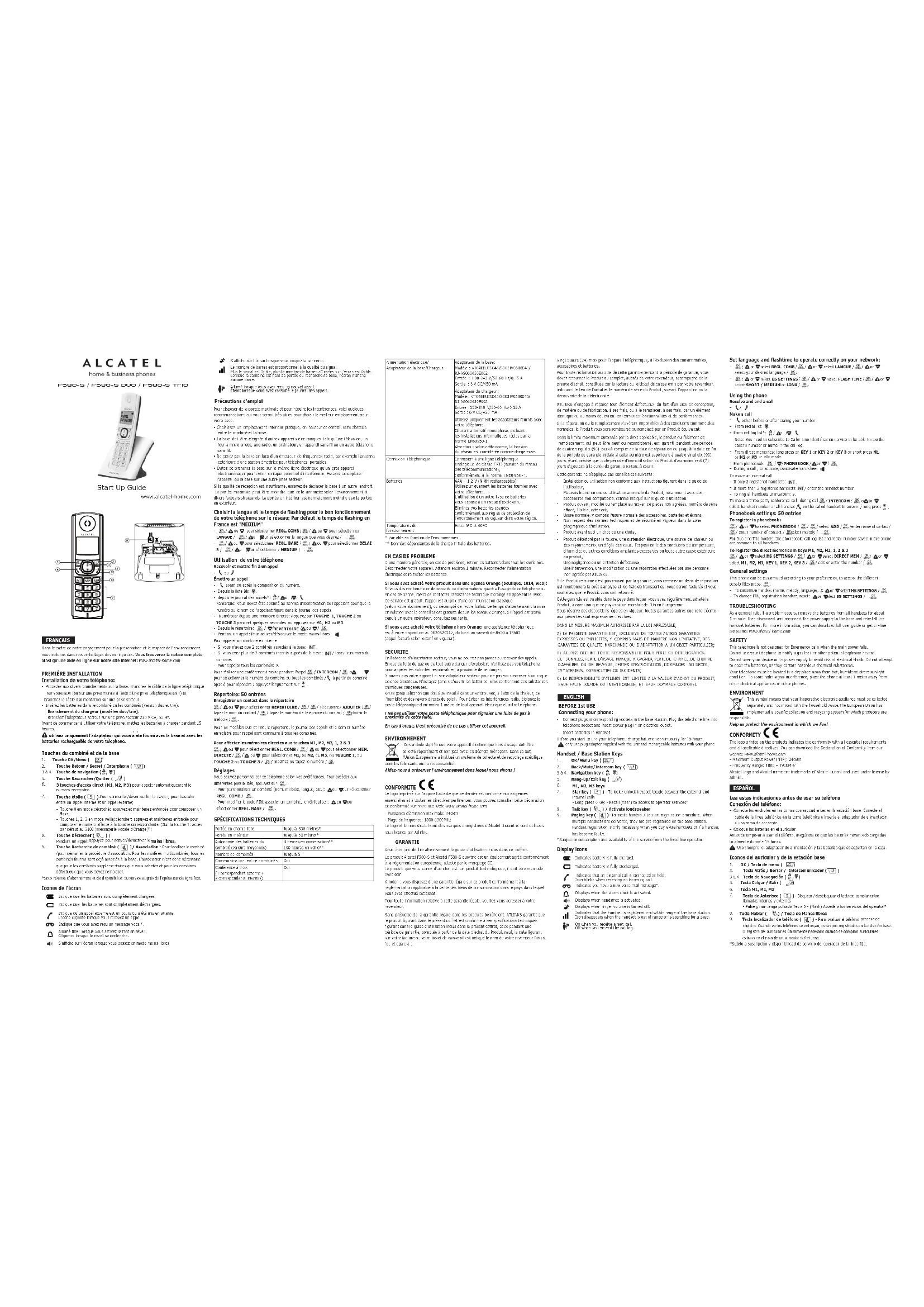 D'une manière générale, en cas de problème, retirer les batteries dans tous les combinés. Déconnecter votre appareil. Attendre environ 1 minute. Reconnecter l'alimentation électrique et réinsérer les batteries. Si vous avez acheté votre produit dans une agence Orange (boutique, 1014, web): Si vous désirez bénéficier de conseils ou d’informations quant à l’usage de ce téléphone ou en cas de panne, merci de contacter l’assistance technique d’orange en appelant le 3900. Ce service est gratuit, l’appel est au prix d’une communication classique (selon votre abonnement), ou décompté de votre forfait. Le temps d’attente avant la mise en relation avec le conseiller est gratuite depuis les réseaux Orange. Si l’appel est passé depuis un autre opérateur, consultez ses tarifs. Si vous avez acheté votre téléphone hors Orange: une assistance téléphonique est à votre disposition au 0820820217, du lundi au samedi de 8h00 à 19h00 (appel facturé selon le tarif en vigueur). SECURITE En l'absence d'alimentation secteur, vous ne pourrez pas passer ou recevoir des appels. En cas de fuite de gaz ou de tout autre danger d'explosion, n'utilisez pas votr e téléphone pour appeler les autorités responsables, à proximité de ce danger. N'ouvrez pas votre appareil ni son adaptateur secteur pour ne pas vous exposer à un risque de choc électrique. N'essayez jamais d'ouvrir les batteries, elles contiennent des substances chimiques dangereuses. Votre poste téléphonique doit être installé dans un endroit sec, à l'abri de la chaleur, de l'humidité et des rayon s directs du soleil. Pour éviter les interférences radio, éloignez le poste téléphonique d'au-moins 1 mètre de tout appareil électrique et autre téléphone. ENVIRONNEMENT Ce symbole signifie que votre appareil électronique hors d'usage doit être collecté séparément et non jeté avec les déchets ménagers. Dans ce but, l'Union Européenne a institué un système de collecte et de recyclage spécifique dont les fabricants ont la responsabilité. Aidez-nous à préserver l'environnement dans lequel nous vivons ! CONFORMITE Le logo imprimé sur l'appareil atteste que ce dernier est conforme aux exigences essentielles et à toutes les directives pertinentes. Vous pouvez consulter cette déclaration de conformité sur notre site Web: www.alcatel-home.com Le logo et le nom Alcatel sont des marques enregistrées d'Alcatel -Lucent et sont utilisées sous licence par Atlinks. ENGLISH FRANÇAIS Dans le cadre de notre engagement pour la préservation et le respect de l'environnement, nous incluons dans nos emballages des mini-guides. Vous trouverez la notice complète ainsi qu'une aide en ligne sur notre site internet: www.alcatel-home.com