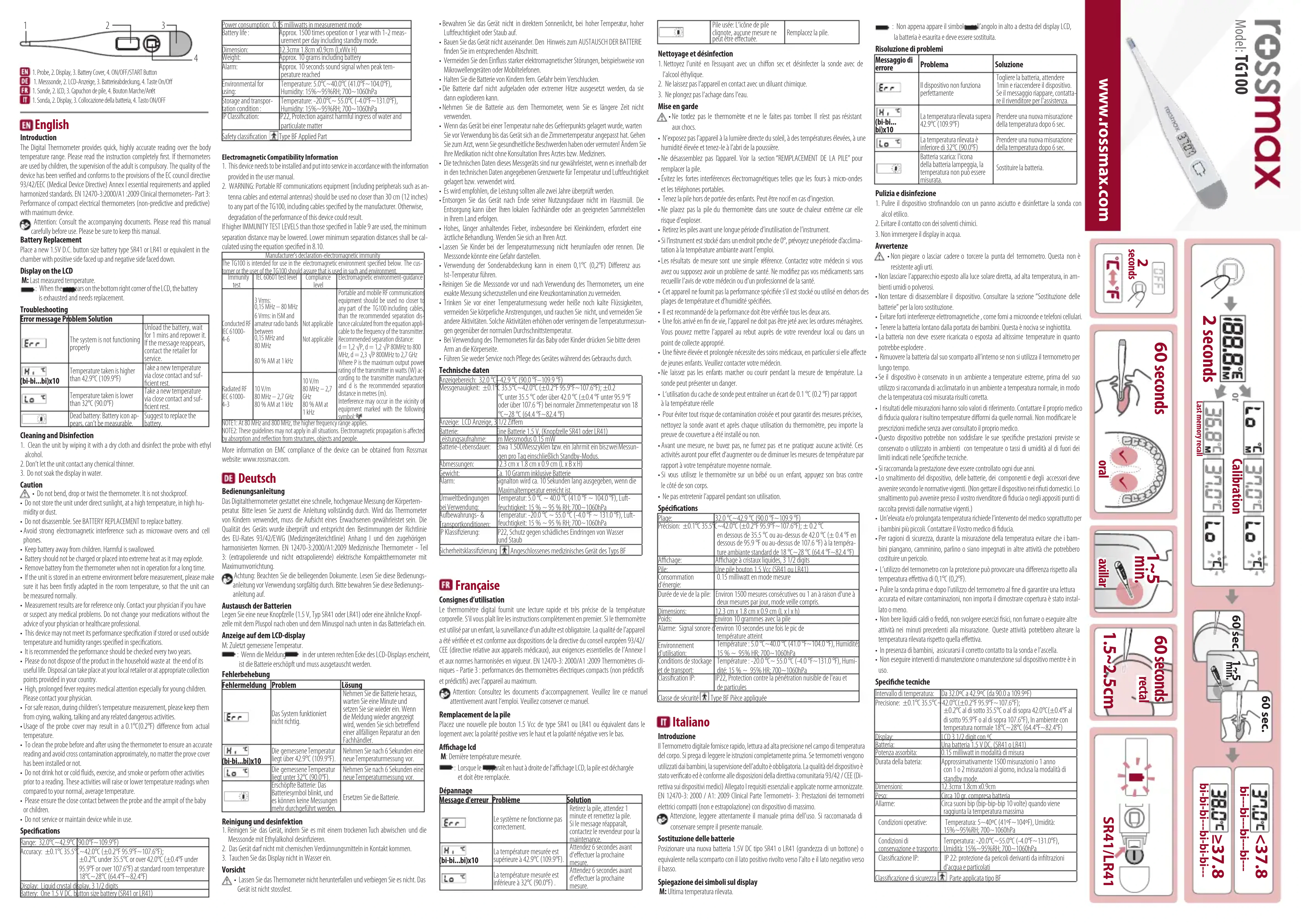 - Reinigen Sie die Messsonde vor und nach Verwendung des Thermometers, um eine exakte Messung sicherzustellen und eine Kreuzkontamination zu vermeiden.• Trinken Sie vor einer Temperaturmessung weder heiße noch kalte Flüssigkeiten, vermeiden Sie körperliche Anstrengungen, und rauchen Sie nicht, und vermeiden Sie andere Aktivitäten. Solche Aktivitäten erhöhen oder verringern die Temperaturmessun-gen gegenüber der normalen Durchschnittstemperatur.• Bei Verwendung des Thermometers für das Baby oder Kinder drücken Sie bitte deren Arm an die Körperseite.• Führen Sie weder Service noch Pege des Gerätes während des Gebrauchs durch.Technische datenAnzeigebereich: 32.0 °C–42.9 °C (90.0 °F–109.9 °F)Messgenauigkeit: ±0.1°C 35.5°C~42.0°C (±0.2°F 95.9°F~107.6°F); ±0.2 °C unter 35.5 °C oder über 42.0 °C (±0.4 °F unter 95.9 °F oder über 107.6 °F) bei normaler Zimmertemperatur von 18 °C~28 °C (64.4 °F~82.4 °F)Anzeige: LCD Anzeige, 3 1/2 ZiernBatterie: Eine Batterie 1.5 V, (Knopfzelle SR41 oder LR41)Leistungsaufnahme: Im Messmodus 0.15 mW Batterie-Lebensdauer: Etwa 1.500 Messzyklen bzw. ein Jahr mit ein bis zwei Messun- gen pro Tag einschließlich Standby-Modus.Abmessungen: 12.3 cm x 1.8 cm x 0.9 cm (L x B x H)Gewicht: Ca. 10 Gramm inklusive BatterieAlarm: Signalton wird ca. 10 Sekunden lang ausgegeben, wenn die Maximaltemperatur erreicht ist.Umweltbedingungen bei Verwendung: Temperatur: 5.0 °C ~ 40.0 °C (41.0 °F ~ 104.0 °F), Luft-feuchtigkeit: 15 % ~ 95 % RH; 700~1060hPaAufbewahrungs- & Transportkonditionen:Temperatur: -20.0 °C ~ 55.0 °C (-4.0 °F ~ 131.0 °F), Luft-feuchtigkeit: 15 % ~ 95 % RH; 700~1060hPaIP Klassizierung: IP22, Schutz gegen schädliches Eindringen von Wasser und StaubSicherheitsklassizierung Angeschlossenes medizinisches Gerät des Typs BF FrançaiseConsignes d’utilisationLe thermomètre digital fournit une lecture rapide et très précise de la température corporelle. S’il vous plaît lire les instructions complètement en premier. Si le thermomètre est utilisé par un enfant, la surveillance d’un adulte est obligatoire. La qualité de l’appareil a été vériée et est conforme aux dispositions de la directive du conseil européen 93/42/CEE (directive relative aux appareils médicaux), aux exigences essentielles de l’Annexe I et aux normes harmonisées en vigueur. EN 12470-3: 2000/A1 :2009 Thermomètres cli-niques - Partie 3 : performances des thermomètres électriques compacts (non prédictifs et prédictifs) avec l’appareil au maximum. Attention: Consultez les documents d‘accompagnement. Veuillez lire ce manuel attentivement avant l‘emploi. Veuillez conserver ce manuel.Remplacement de la pilePlacez une nouvelle pile bouton 1.5 Vcc de type SR41 ou LR41 ou équivalent dans le logement avec la polarité positive vers le haut et la polarité négative vers le bas.Achage lcd M: Dernière température mesurée. : Lorsque le apparaît en haut à droite de l‘achage LCD, la pile est déchargée et doit être remplacée. DépannageMessage d'erreur Problème SolutionLe système ne fonctionne pas correctement.Retirez la pile, attendez 1 minute et remettez la pile. Si le message réapparaît, contactez le revendeur pour la maintenance. (bi-bi...bi)x10La température mesurée est supérieure à 42.9°C (109.9°F).Attendez 6 secondes avant d‘eectuer la prochaine mesure.La température mesurée est inférieure à 32°C (90.0°F) .Attendez 6 secondes avant d‘eectuer la prochaine mesure.Pile usée: L‘icône de pile clignote, aucune mesure ne peut être eectuée. Remplacez la pile.Nettoyage et désinfection