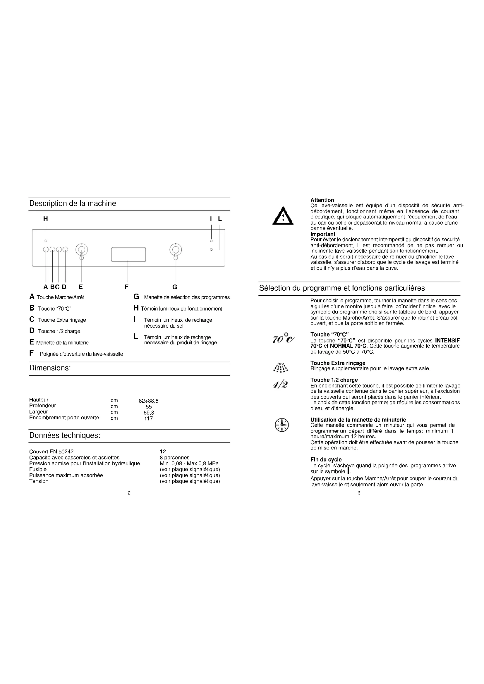 Description de la machine Données techniques: Dimensions: A Touche Marche/Arrêt B Touche “70°C” C Touche Extra rinçage D Touche 1/2 charge E Manette de la minuterie F Poignée d'ouverture du lave-vaisselle G Manette de sélection des programmes H Témoin lumineux de fonctionnement I Témoin lumineux de recharge nécessaire du sel L Témoin lumineux de recharge nécessaire du produit de rinçage A BC D E F G I LH4 PRELAVAGE INTENSIF 70°C ECO 50°C NORMAL 70°C NORMAL 50°C FRAGILE 50°C
