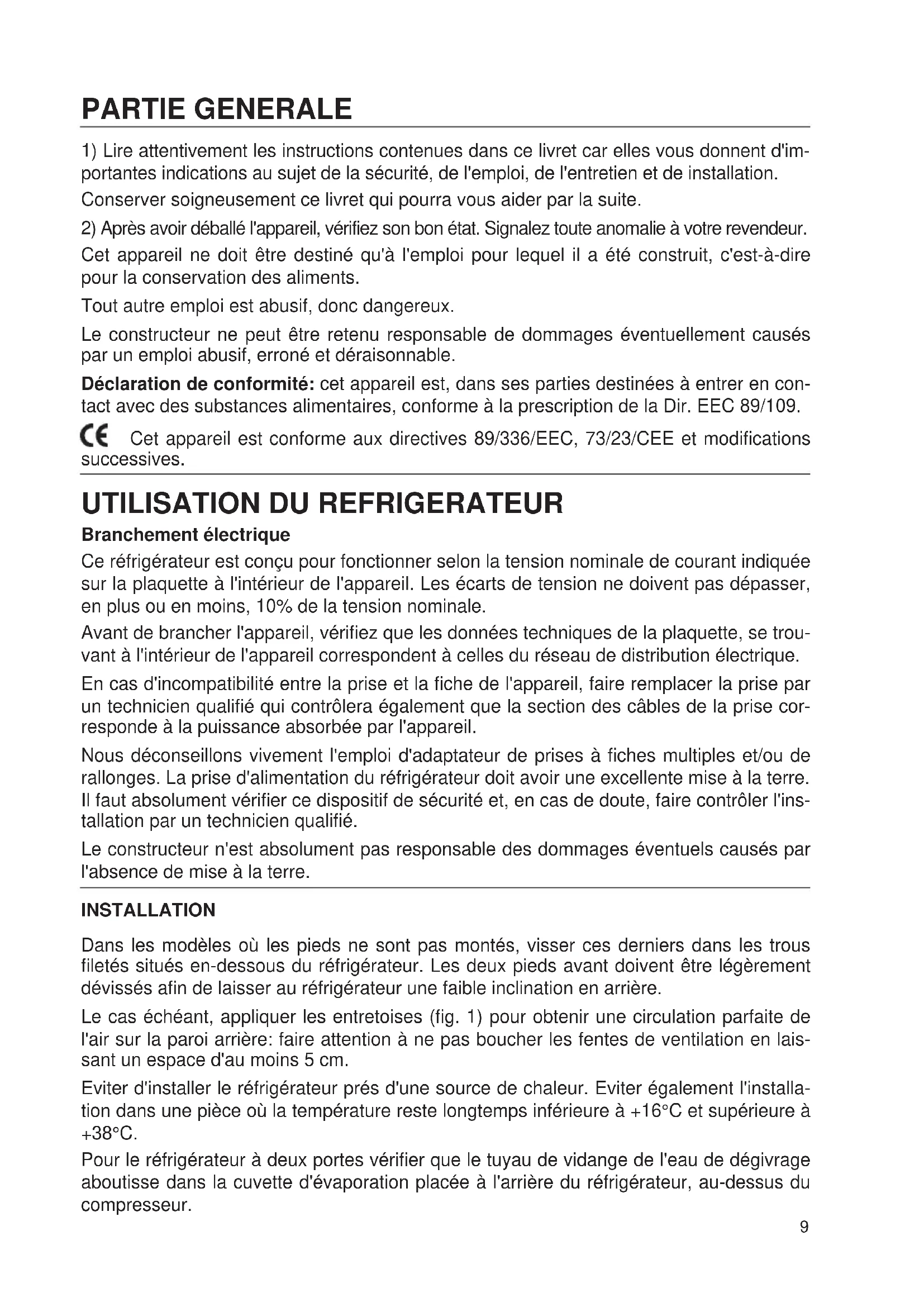 Branchement électrique Ce réfrigérateur est conçu pour fonctionner selon la tension nominale de courant indiquée sur la plaquette à l'intérieur de l'appareil. Les écarts de tension ne doivent pas dépasser, en plus ou en moins, 10% de la tension nominale. Avant de brancher l'appareil, vérifiez que les données techniques de la plaquette, se trou- vant à l'intérieur de l'appareil correspondent à celles du réseau de distribution électrique. En cas d'incompatibilité entre la prise et la fiche de l'appareil, faire remplacer la prise par un technicien qualifié qui contrôlera également que la section des câbles de la prise cor- responde à la puissance absorbée par l'appareil. Nous déconseillons vivement l'emploi d'adaptateur de prises à fiches multiples et/ou de rallonges. La prise d'alimentation du réfrigérateur doit avoir une excellente mise à la terre. Il faut absolument vérifier ce dispositif de sécurité et, en cas de doute, faire contrôler l'ins- tallation par un technicien qualifié. Le constructeur n'est absolument pas responsable des dommages éventuels causés par l'absence de mise à la terre. INSTALLATION Dans les modèles où les pieds ne sont pas montés, visser ces derniers dans les trous filetés situés en-dessous du réfrigérateur. Les deux pieds avant doivent être légèrement dévissés afin de laisser au réfrigérateur une faible inclination en arrière. Le cas échéant, appliquer les entretoises (fig. 1) pour obtenir une circulation parfaite de l'air sur la paroi arrière: faire attention à ne pas boucher les fentes de ventilation en lais- sant un espace d'au moins 5 cm. Eviter d'installer le réfrigérateur prés d'une source de chaleur. Eviter également l'installa- tion dans une pièce où la température reste longtemps inférieure à +16°C et supérieure à +38°C. Pour le réfrigérateur à deux portes vérifier que le tuyau de vidange de l'eau de dégivrage aboutisse dans la cuvette d'évaporation placée à l'arrière du réfrigérateur, au-dessus du compresseur. 9Le réfrigérateur peut-être aussi installé sous les éléments de cuisine; dans ce cas la libre circulation de l'air doit être garantie, laissant un espace libre d'environ 5 centimètres entre le meuble et l'appareil ou dans la partie postérieure du meuble. Une mauvaise installation peut causer des dommages aux personnes, aux animaux etc... et le constructeur ne peut en être tenu responsable. CONSEILS POUR LE CONTRÔLE DE LA TEMPÉRATURE ET POUR LE RESPECT