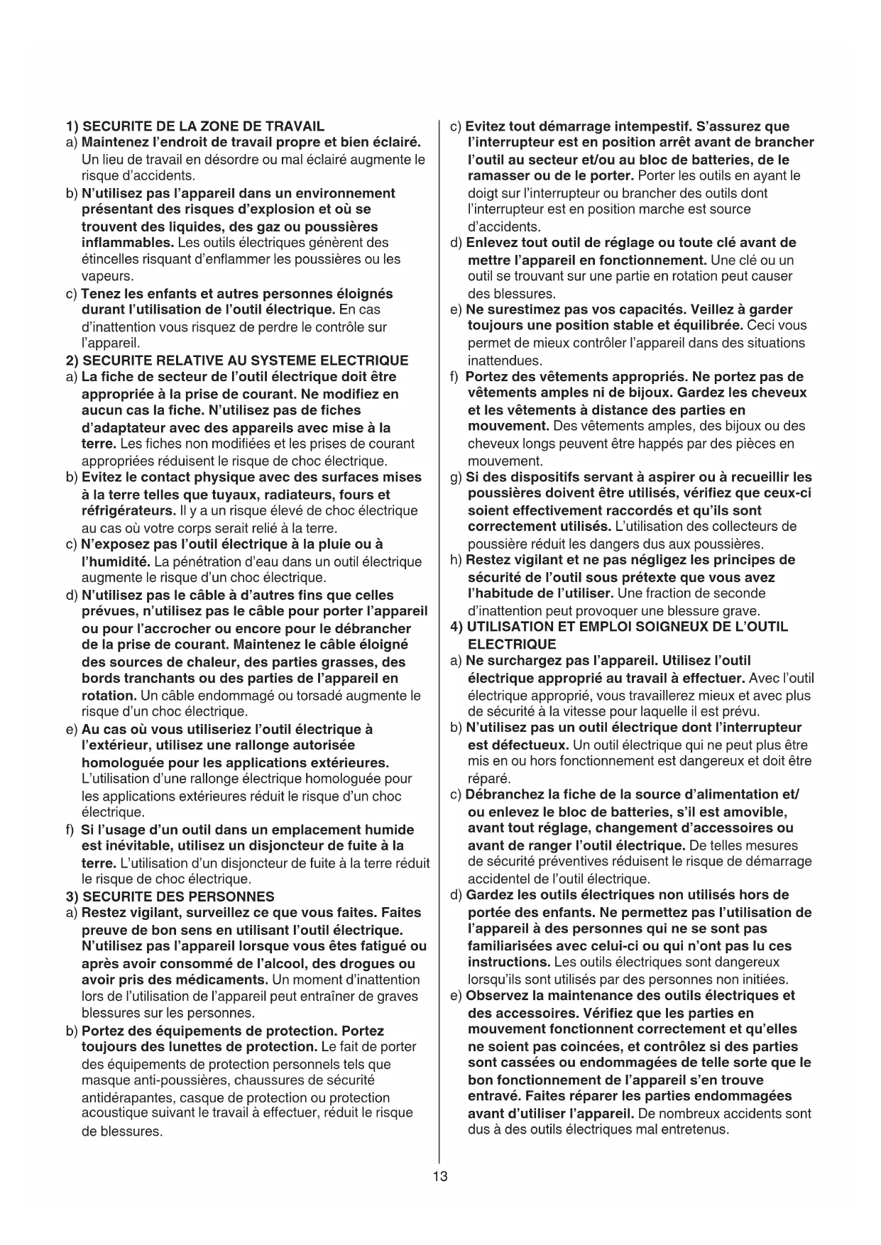 AVERTISSEMENT Lisez tous les avertissements de sécurité, les instructions, les illustrations et les spécifications fournis avec cet outil électrique. Ne pas suivre les instructions énumérées ci-dessous peut provoquer un choc électrique, un incendie et/ou une blessure sérieuse. Conservez tous les avertissements et toutes les instructions pour pouvoir s’y reporter ultérieurement. Le terme “outil électrique” dans les avertissements se rapporte à des outils électriques raccordés au secteur (avec câble de raccordement) et à des outils électriques à batterie (sans câble de raccordement).13