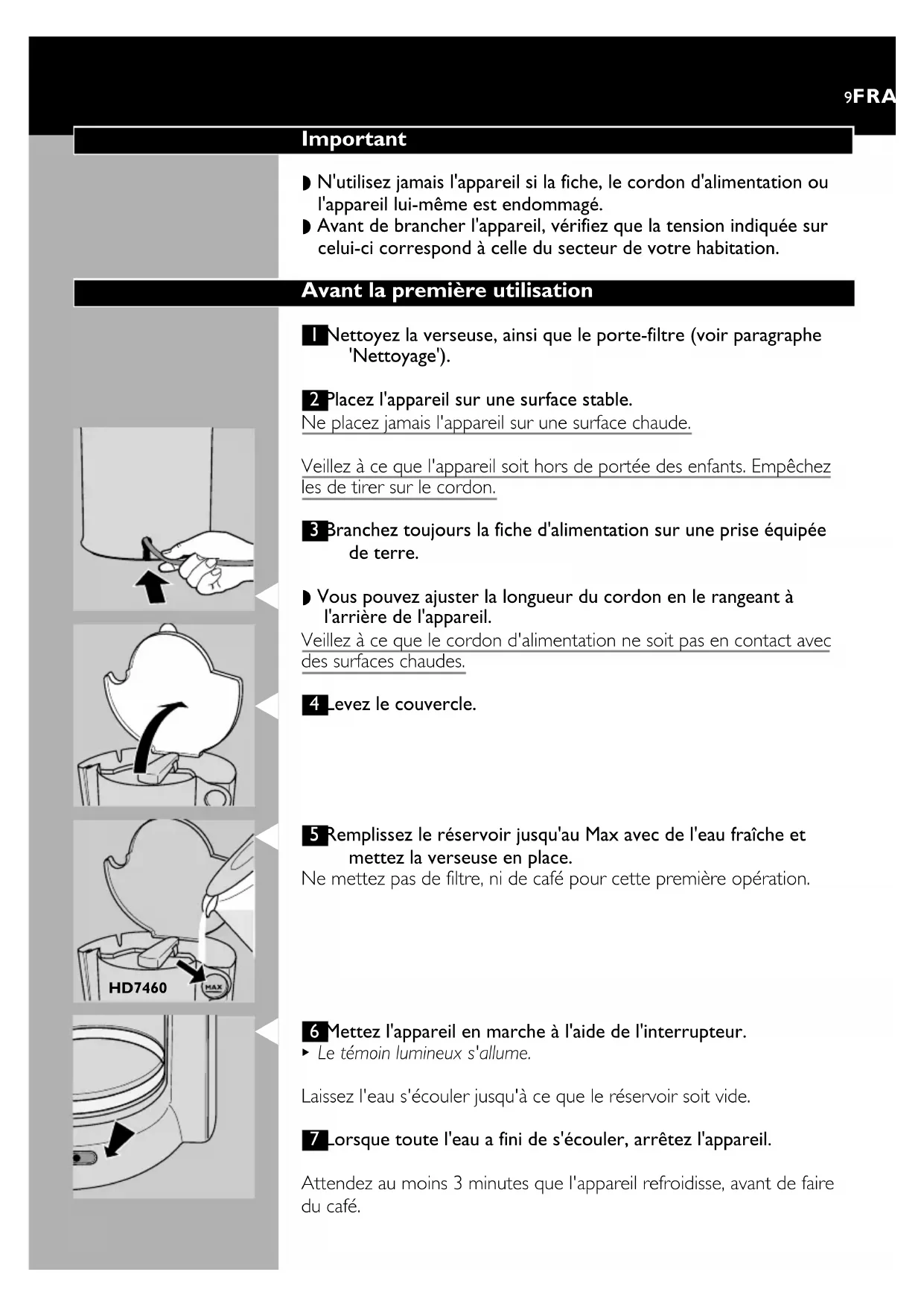 Le témoin lumineux s'allume. Laissez l'eau s'écouler jusqu'à ce que le réservoir soit vide. 7 Lorsque toute l'eau a fini de s'écouler, arrêtez l'appareil. Attendez au moins 3 minutes que l'appareil refroidisse, avant de faire du café. 9FRANÇAIS HD7460Pour faire du café 1 Levez le couvercle.
