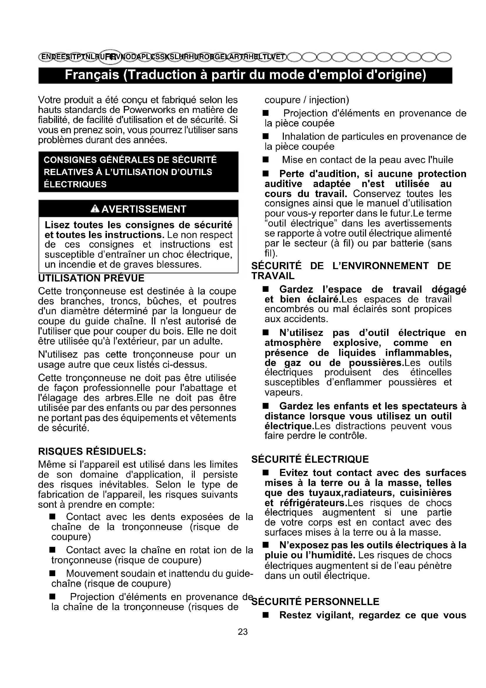 EN DE ES IT PT NL RU FI SV NO DA PL CS SK SL HR HU RO BG EL AR TR HE LT LV ET Votre produit a été conçu et fabriqué selon les hauts standards de Powerworks en matière de fiabilité, de facilité d'utilisation et de sécurité. Si vous en prenez soin, vous pourrez l'utiliser sans problèmes durant des années. CONSIGNES GÉNÉRALES DE SÉCURITÉ