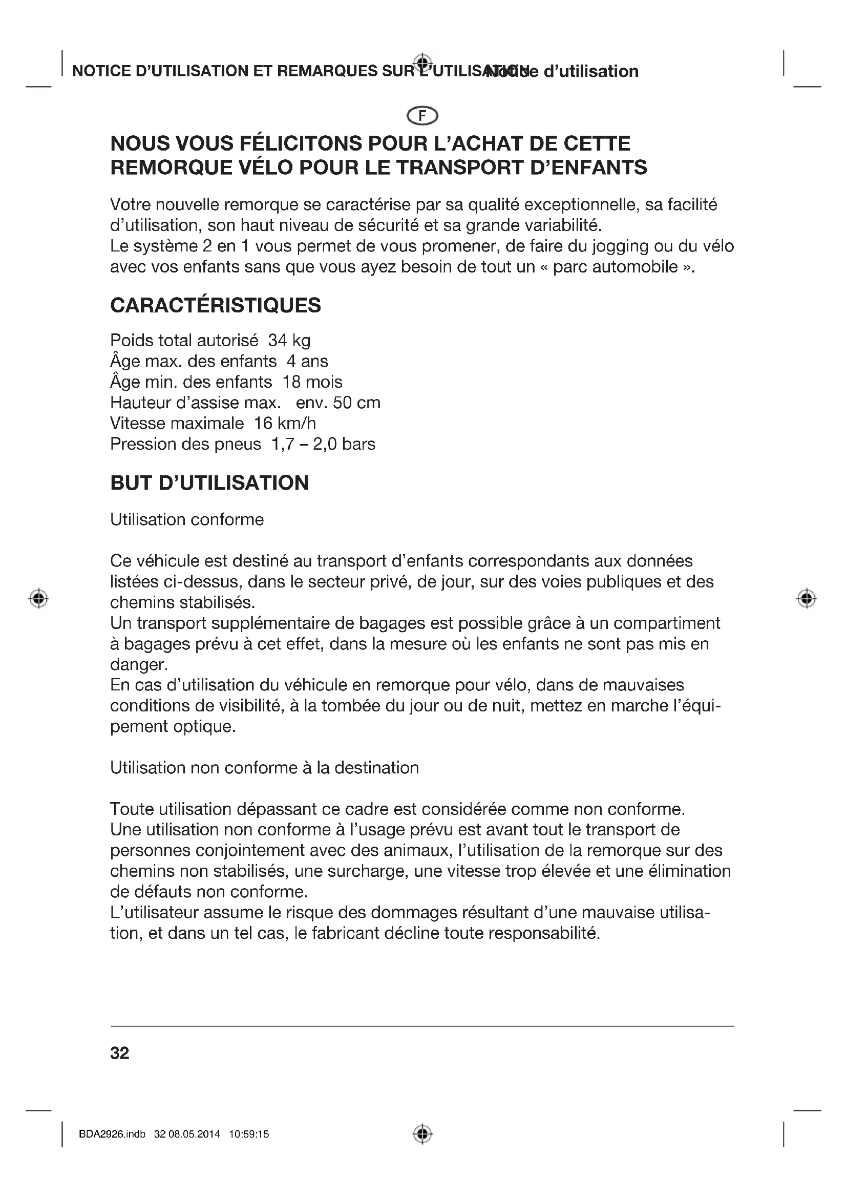 Utilisation conforme Ce véhicule est destiné au transport d’enfants correspondants aux données listées ci-dessus, dans le secteur privé, de jour, sur des voies publiques et des chemins stabilisés. Un transport supplémentaire de bagages est possible grâce à un compartiment à bagages prévu à cet eet, dans la mesure où les enfants ne sont pas mis en danger. En cas d’utilisation du véhicule en remorque pour vélo, dans de mauvaises conditions de visibilité, à la tombée du jour ou de nuit, mettez en marche l’équi- pement optique. Utilisation non conforme à la destination Toute utilisation dépassant ce cadre est considérée comme non conforme. Une utilisation non conforme à l’usage prévu est avant tout le transport de personnes conjointement avec des animaux, l’utilisation de la remorque sur des chemins non stabilisés, une surcharge, une vitesse trop élevée et une élimination de défauts non conforme. L’utilisateur assume le risque des dommages résultant d’une mauvaise utilisa- tion, et dans un tel cas, le fabricant décline toute responsabilité. NOTICE D’UTILISATION ET REMARQUES SUR L’UTILISATION