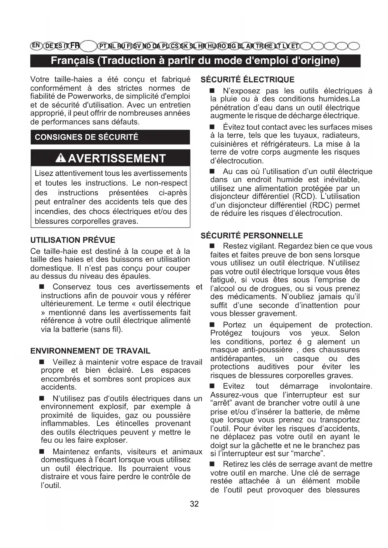 DE ES IT FR PT NL RU FI SV NO DA PL CS SK SL HR HU RO BG EL AR TR HE LT LV ET Votre taille-haies a été conçu et fabriqué conformément à des strictes normes de fiabilité de Powerworks, de simplicité d'emploi et de sécurité d'utilisation. Avec un entretien approprié, il peut offrir de nombreuses années de performances sans défauts.