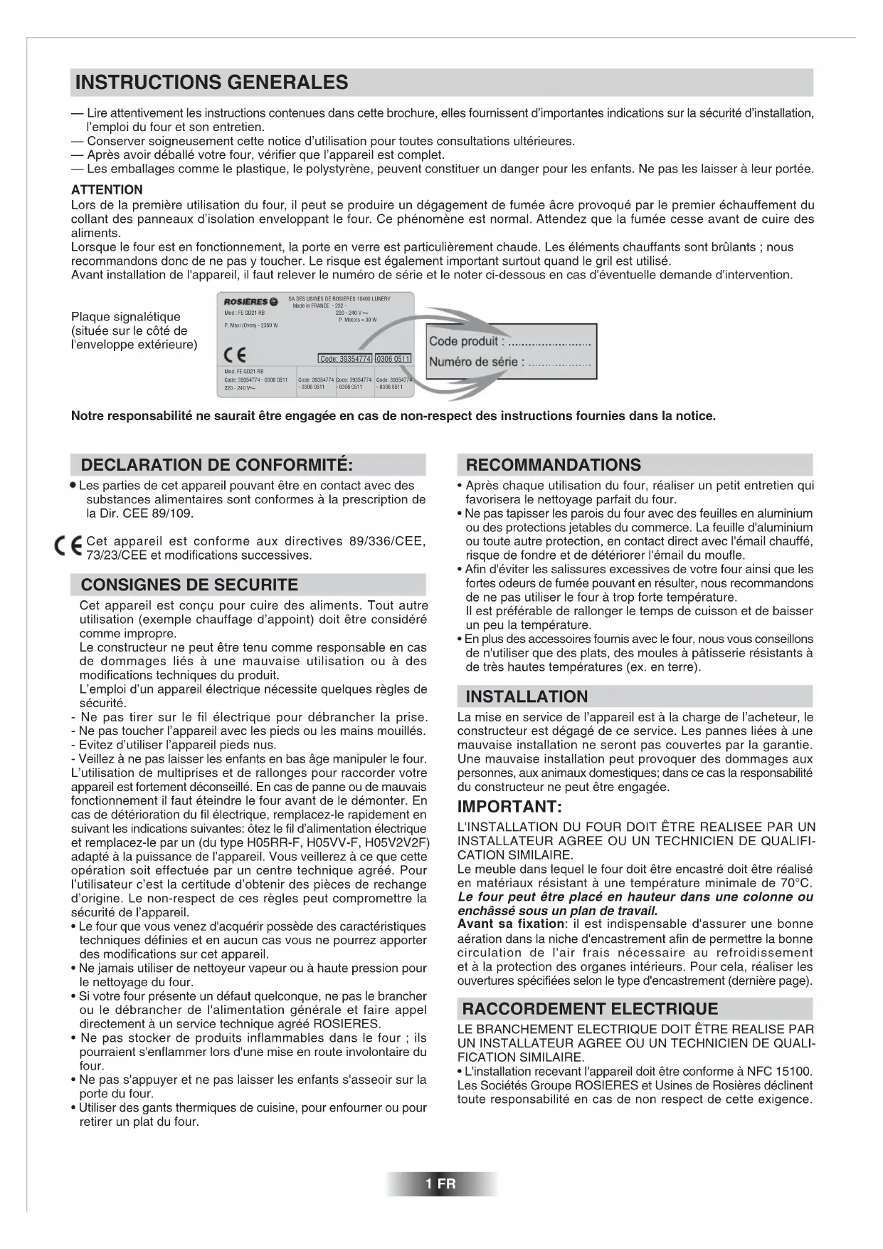 - L'installation recevant l'appareil doit être conforme à NFC 15100. Les Sociétés Groupe ROSIERES et Usines de Rosières déclinent toute responsabilité en cas de non respect de cette exigence. — Lire attentivement les instructions contenues dans cette brochure, elles fournissent d’importantes indications sur la sécurité d’installation, l’emploi du four et son entretien. — Conserver soigneusement cette notice d’utilisation pour toutes consultations ultérieures. — Après avoir déballé votre four, vérifier que l’appareil est complet. — Les emballages comme le plastique, le polystyrène, peuvent constituer un danger pour les enfants. Ne pas les laisser à leur portée. ATTENTION Lors de la première utilisation du four, il peut se produire un dégagement de fumée âcre provoqué par le premier échauffement du collant des panneaux d’isolation enveloppant le four. Ce phénomène est normal. Attendez que la fumée cesse avant de cuire des aliments. Lorsque le four est en fonctionnement, la porte en verre est particulièrement chaude. Les éléments chauffants sont brûlants ; nous recommandons donc de ne pas y toucher. Le risque est également important surtout quand le gril est utilisé. Avant installation de l'appareil, il faut relever le numéro de série et le noter ci-dessous en cas d'éventuelle demande d'intervention. Plaque signalétique (située sur le côté de l'enveloppe extérieure) Notre responsabilité ne saurait être engagée en cas de non-respect des instructions fournies dans la notice. INSTRUCTIONS GENERALES DECLARATION DE CONFORMITÉ: