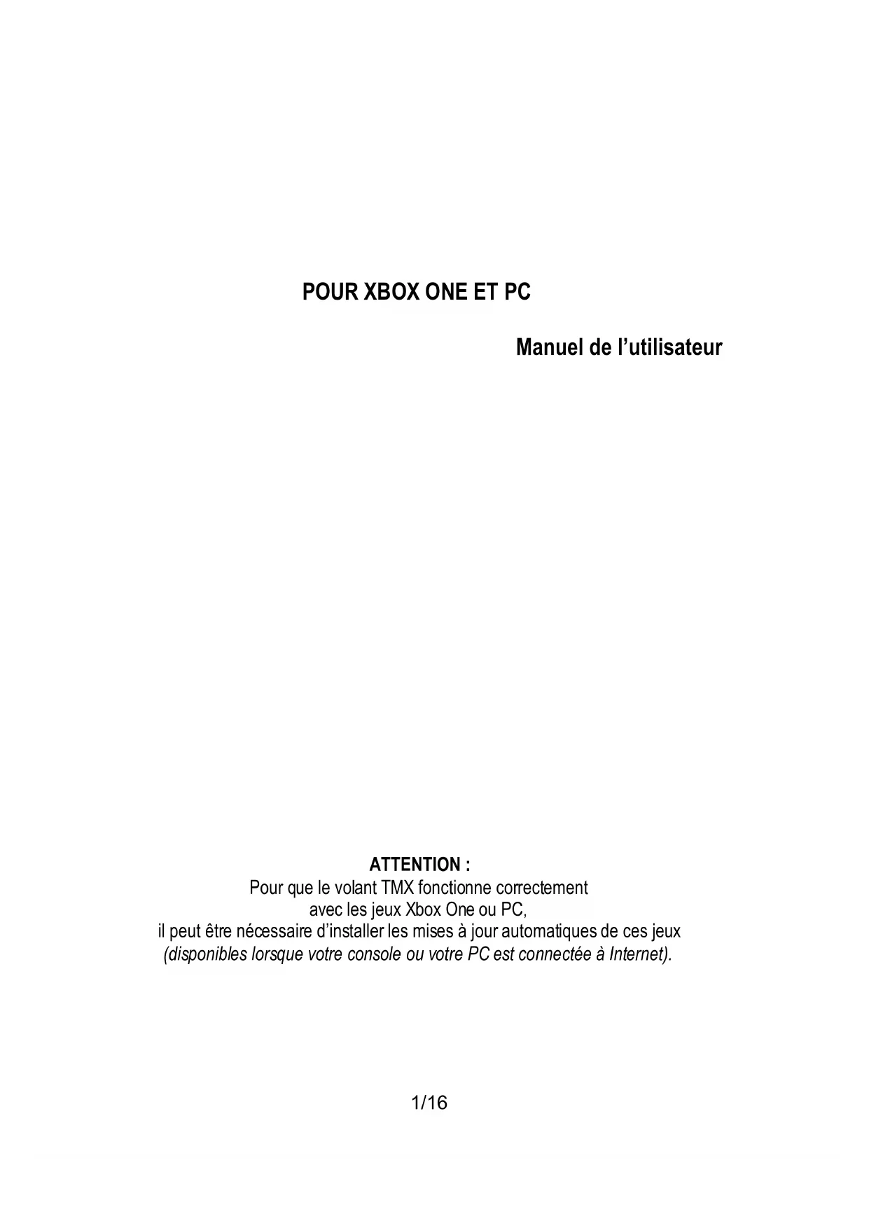 ATTENTION : Pour que le volant TMX fonctionne correctement avec les jeux Xbox One ou PC, il peut être nécessaire d’installer les mises à jour automatiques de ces jeux (disponibles lorsque votre console ou votre PC est connectée à Internet).2/16
