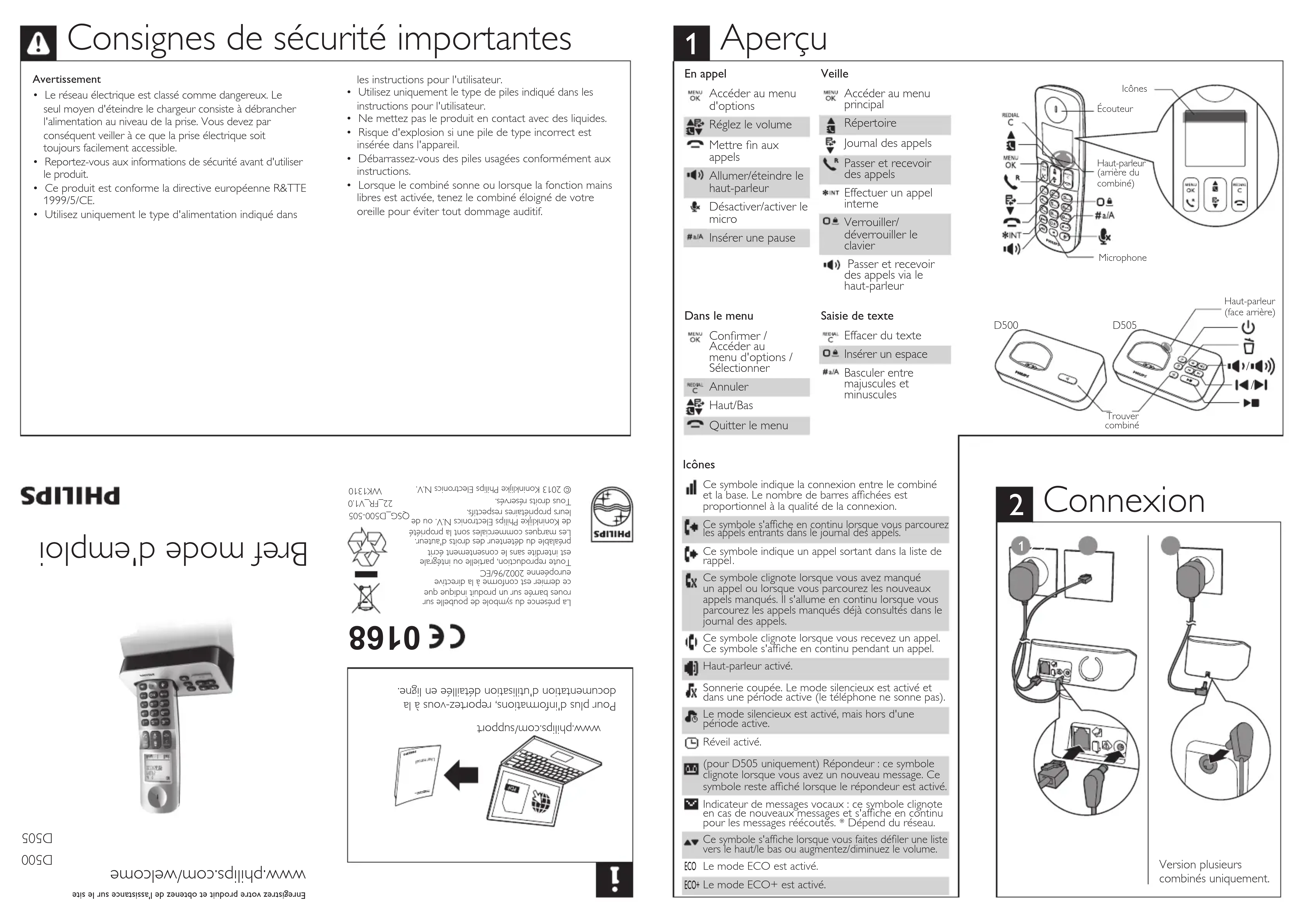 D500 D505 Enregistrez votre produit et obtenez de l'assistance sur le site www.philips.com/welcome Bref mode d'emploi La présence du symbole de poubelle surroues barrée sur un produit indique quece dernier est conforme à la directiveeuropéenne 2002/96/ECToute reproduction, partielle ou intégrale est interdite sans le consentement écrit préalable du détenteur des droits d'auteur. Les marques commerciales sont la propriété de Koninklijke Philips Electronics N.V. ou de leurs propriétaires respectifs.Tous droits réservés.© 2013 Koninklijke Philips Electronics N.V. QSG_D500-50522_FR_V1.0WK1310 www.philips.com/supportPour plus d'informations, reportez-vous à la documentation d'utilisation détaillée en ligne.1 2 3