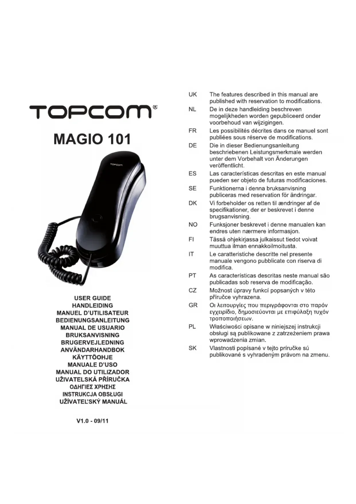 - Jetez les piles et procédez à l'entretien de l'appareil dans le respect de l'environnement. 3 Nettoyage Nettoyez le téléphone à l'aide d'un chiffon légèrement humide ou antistatique. N'utilisez jamais de détergents ou de solvants abrasifs. Veuillez lire attentivement les instructions suivantes relatives à la sécurité et à l'utilisation correcte du produit. Familiarisez-vous avec toutes les fonctions de l'équipement. Veillez à conserver ces conseils et, si nécessaire, transmettez-les à une autre personne. HL_Magio 101.book Page 6 Friday, September 9, 2011 4:29 PM7 DEUTSCH Topcom Magio 101 1 Beschreibung (siehe Bild auf dem aufgeklappten Deckblatt)
