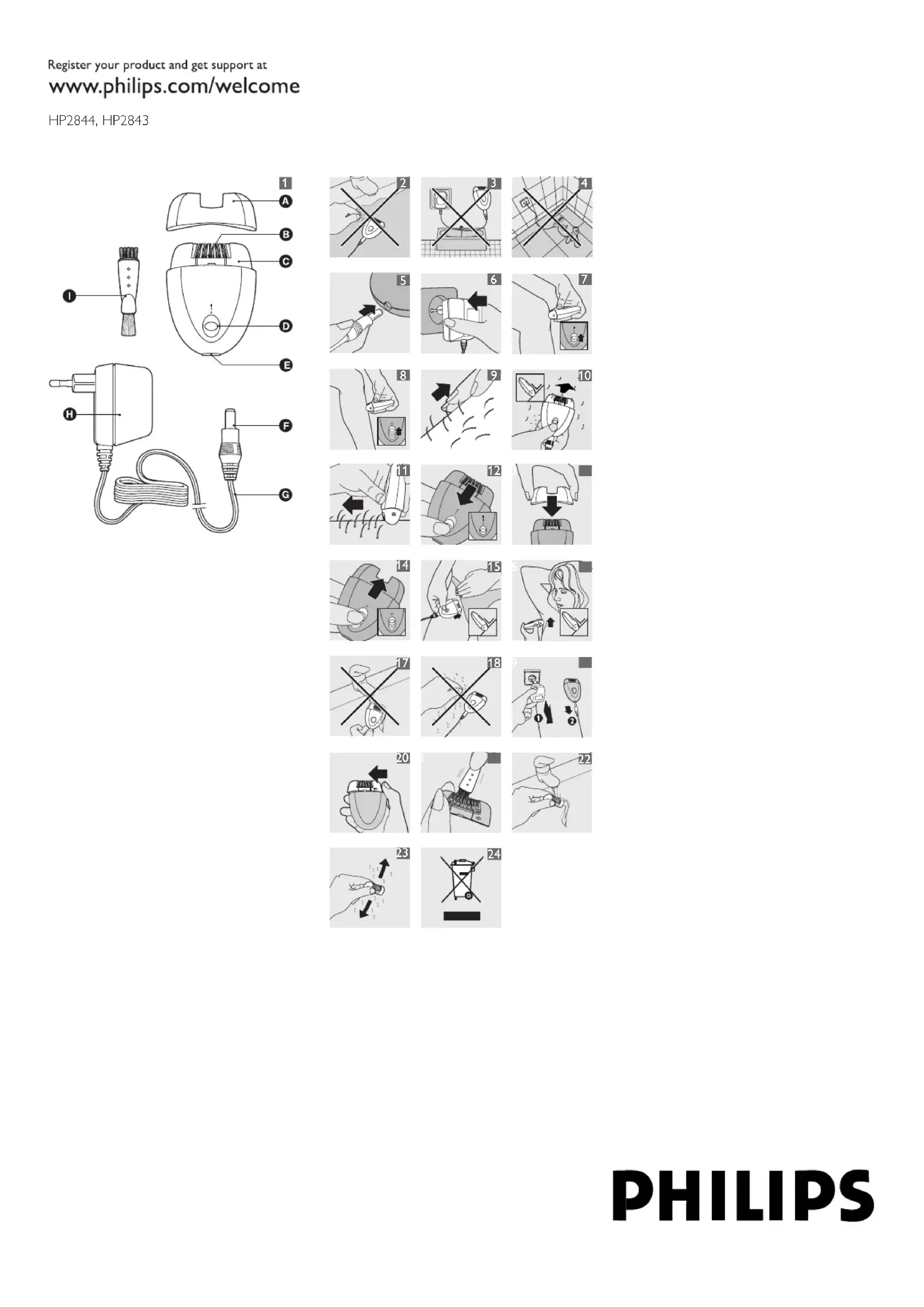 3/10FRANÇAIS Introduction Félicitations pour votre achat et bienvenue dans l’univers Philips ! Pour bénécier pleinement de l’assistance Philips, enregistrez votre produit sur le site www.philips. com/welcome. Ce nouvel épilateur permet une épilation rapide, facile et efcace. Les disques rotatifs attrapent même les poils les plus courts (jusqu’à un demi-millimètre) et les enlèvent à la racine. Le poil repousse doux et n, et votre peau reste douce et épilée pendant plusieurs semaines. Description générale (fig. 1) A Adaptateur spécial zones sensibles (HP2844 uniquement) B Disques rotatifs C Tête d’épilation D Bouton coulissant marche/arrêt 1 0 = arrêt 2 I = vitesse normale 3 II = vitesse rapide E Prise pour la che de l’appareil F Fiche de l’appareil G Adaptateur H Brosse Important Lisez attentivement ce mode d’emploi avant d’utiliser l’appareil et conservez-le pour un usage ultérieur. Danger Évitez de mouiller l’appareil et l’adaptateur. N’utilisez jamais l’appareil près d’une baignoire ou d’un lavabo rempli d’eau (g. 2). N’utilisez jamais l’appareil dans le bain ni sous la douche (g. 3). Si vous utilisez l’appareil dans la salle de bain, évitez d’y brancher une rallonge (g. 4). Avertissement Avant de brancher l’appareil, vériez que la tension secteur indiquée sur la plaque correspond à la tension secteur locale. Utilisez l’appareil uniquement avec l’adaptateur fourni. N’utilisez pas l’appareil lorsque celui-ci ou l’adaptateur est endommagé. Si l’adaptateur est endommagé, remplacez-le toujours par un adaptateur de même type pour éviter tout accident. L’adaptateur contient un transformateur. N’essayez pas de remplacer la che de l’adaptateur pour éviter tout accident. Cet appareil n’est pas destiné à être utilisé par des personnes (notamment des enfants) dont les capacités physiques, sensorielles ou intellectuelles sont réduites, ou par des personnes manquant d’expérience ou de connaissances, à moins que celles-ci ne soient sous surveillance ou qu’elles aient reçu des instructions quant à l’utilisation de l’appareil par une personne responsable de leur sécurité. Veillez à ce que les enfants ne puissent pas jouer avec l’appareil. Attention Utilisez la capsule spéciale zones sensibles pour épiler les aisselles et le maillot. Pour prévenir tout dommage ou blessure, évitez de faire fonctionner l’appareil près de vos cheveux, de vos sourcils et cils, ainsi qu’à proximité de vêtements, ls, câbles, brosses, etc. N’utilisez pas l’appareil sans avoir consulté votre médecin si votre peau est irritée ou si vous avez des varices, rougeurs, boutons, grains de beauté (poilus) ou blessures. De même, avant la première utilisation, les personnes ayant une immunité réduite ou souffrant de diabète, d’hémophilie ou d’immunodécience doivent aussi consulter leur médecin. Lors des premières utilisations, il est possible que la peau rougisse ou s’irrite légèrement. Il s’agit d’une réaction normale qui disparaîtra rapidement. La gêne ressentie au début diminuera progressivement à chaque utilisation. Au fur et à mesure, votre peau s’habituera et la repousse sera plus ne. Cependant, si l’irritation persiste au-delà de trois jours, consultez votre médecin.
