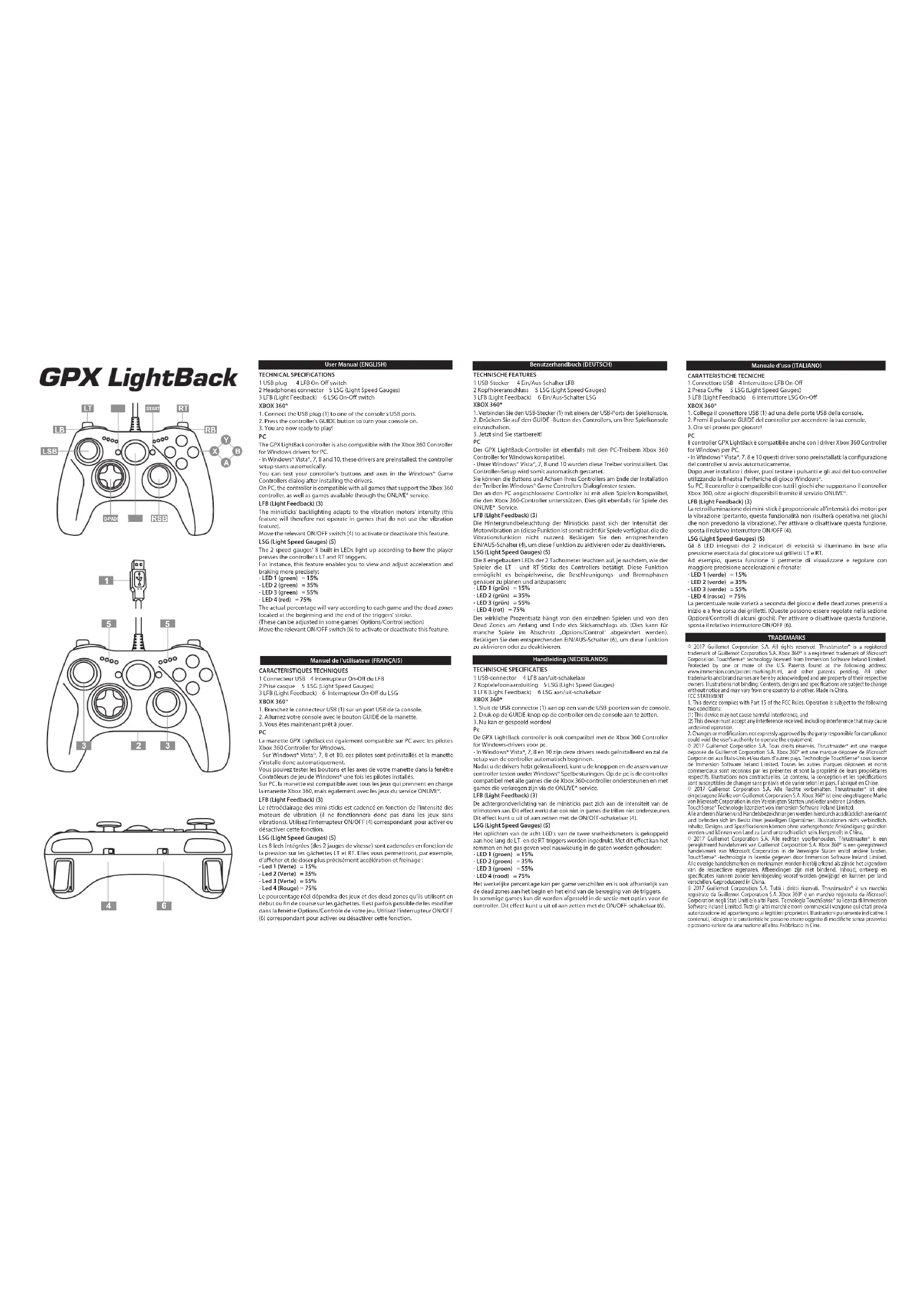 La manette GPX LightBack est également compatible sur PC avec les pilotes Xbox 360 Controller for Windows. - Sur Windows® Vista®, 7, 8 et 10, ces pilotes sont préinstallés et la manette s’installe donc automatiquement. Vous pouvez tester les boutons et les axes de votre manette dans la fenêtre Contrôleurs de jeu de Windows® une fois les pilotes installés. Sur PC, la manette est compatible avec tous les jeux qui prennent en charge la manette Xbox 360, mais également avec les jeux du service ONLIVE®. LFB (Light Feedback) (3) Le rétroéclairage des mini-sticks est cadencé en fonction de l’intensité des moteurs de vibration (il ne fonctionnera donc pas dans les jeux sans vibrations). Utilisez l’interrupteur ON/OFF (4) correspondant pour activer ou désactiver cette fonction. LSG (Light Speed Gauges) (5) Les 8 leds intégrées (des 2 jauges de vitesse) sont cadencées en fonction de la pression sur les gâchettes LT et RT. Elles vous permettront, par exemple, d’acher et de doser plus précisément accélération et freinage : - Led 1 (Verte) = 15% - Led 2 (Verte) = 35% - Led 3 (Verte) = 55% - Led 4 (Rouge) = 75% Le pourcentage réel dépendra des jeux et des dead zones qu’ils utilisent en début ou n de course sur les gâchettes. Il est parfois possible de les modier dans la fenêtre Options/Contrôle de votre jeu. Utilisez l’interrupteur ON/OFF (6) correspondant pour activer ou désactiver cette fonction. Benutzerhandbuch (DEUTSCH) TECHNISCHE FEATURES 1 USB-Stecker 4 Ein/Aus-Schalter LFB 2 Kopfhöreranschluss 5 LSG (Light Speed Gauges) 3 LFB (Light Feedback) 6 Ein/Aus-Schalter LSG XBOX 360®