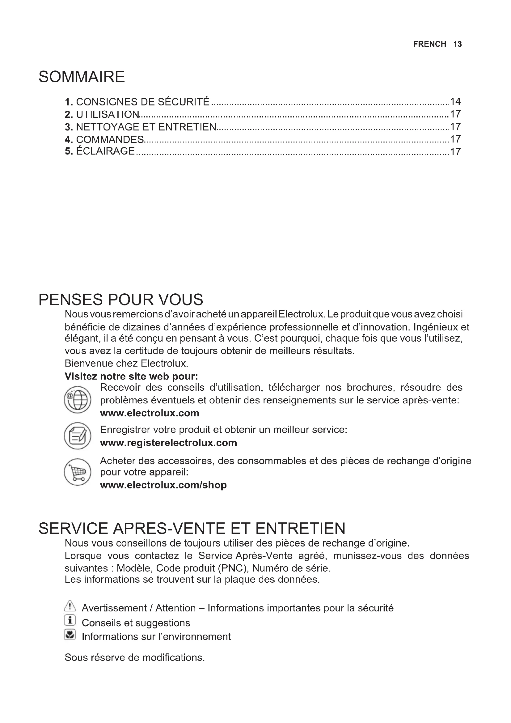 Nous vous conseillons de toujours utiliser des pièces de rechange d’origine. Lorsque vous contactez le Service Après-Vente agréé, munissez-vous des données suivantes : Modèle, Code produit (PNC), Numéro de série. Les informations se trouvent sur la plaque des données. Avertissement / Attention – Informations importantes pour la sécurité Conseils et suggestions Informations sur l’environnement Sous réserve de modications.14 www.electrolux.com