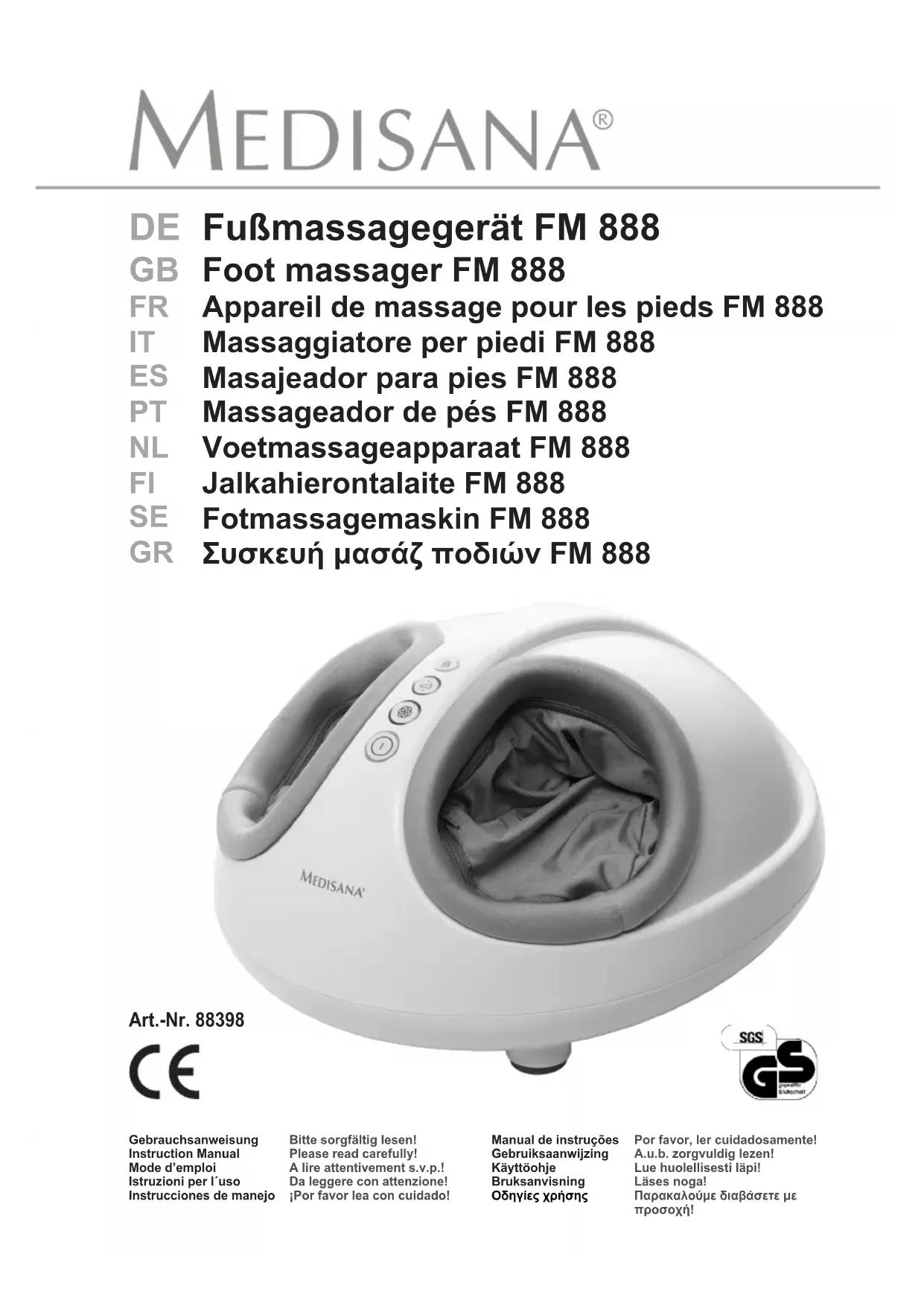 Félicitations et merci de votre confiance!Avec l'appareil de massage pour les pieds FM 888, vous avez acquis un produit de qualité de MEDISANA. Cet appareil est conçu pour le massage des pieds avec ou sans fonction de chauffage. Pour vous permettre d'atteindre le succès escompté et de bénéficier encore longtemps de votre appareil de massage pour les pieds FM 888 de MEDISANA, nous vous recommandons de lire attentivement les conseils d'utilisation et d'entretien ci-après.Merci! Élémentsfourniset emballageVeuillez vérifier si l'appareil est au complet et ne présente aucun dommage. En cas de doute, ne faites pas fonctionner l’appareil et adressez-vous à votre revendeur ou à un point de service après-vente.La fourniture comprend: G1 MEDISANA Appareil de massage pour les pieds FM 8881 Mode d'emploi