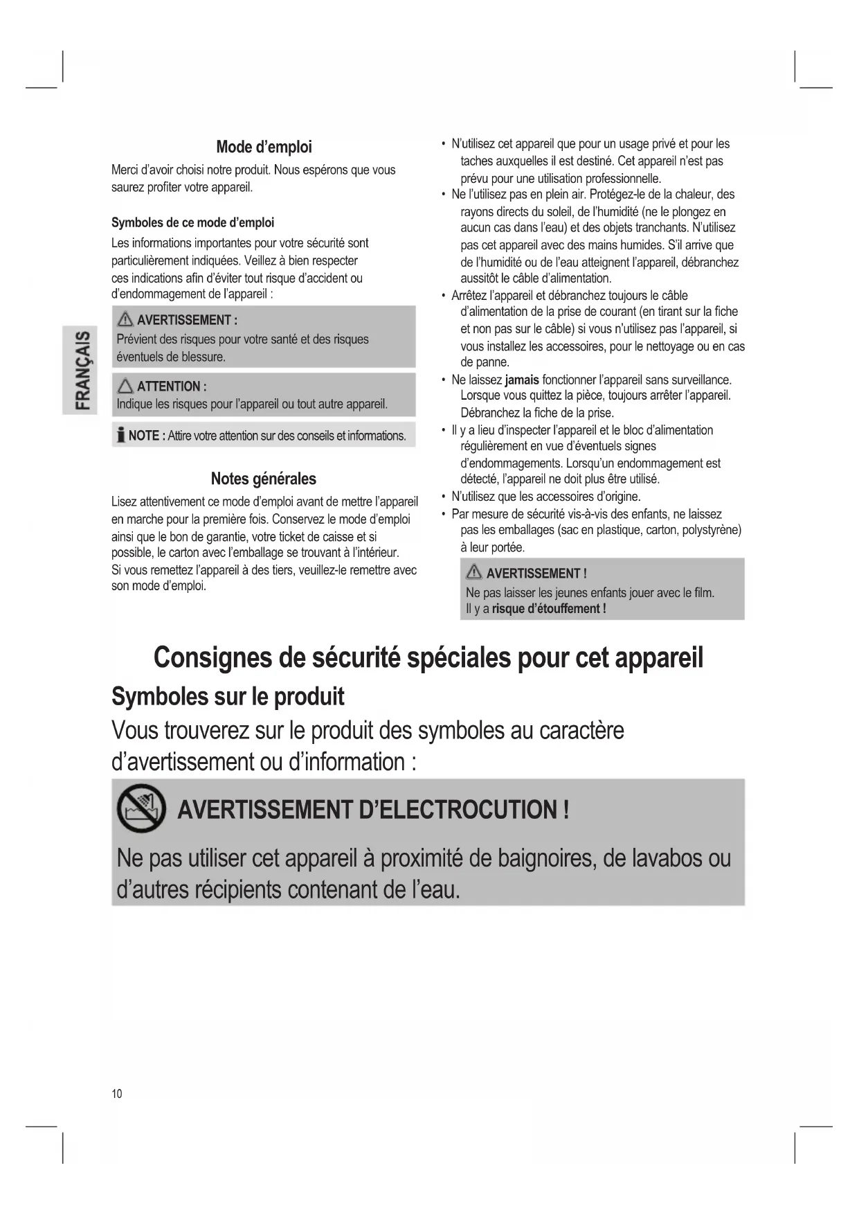 - Par mesure de sécurité vis-à-vis des enfants, ne laissez pas les emballages (sac en plastique, carton, polystyrène) à leur portée. AVERTISSEMENT ! Ne pas laisser les jeunes enfants jouer avec le lm. Il y a risque d’étouffement ! Mode d’emploi Merci d’avoir choisi notre produit. Nous espérons que vous saurez proter votre appareil. Symboles de ce mode d’emploi Les informations importantes pour votre sécurité sont particulièrement indiquées. Veillez à bien respecter ces indications an d’éviter tout risque d’accident ou d’endommagement de l’appareil :