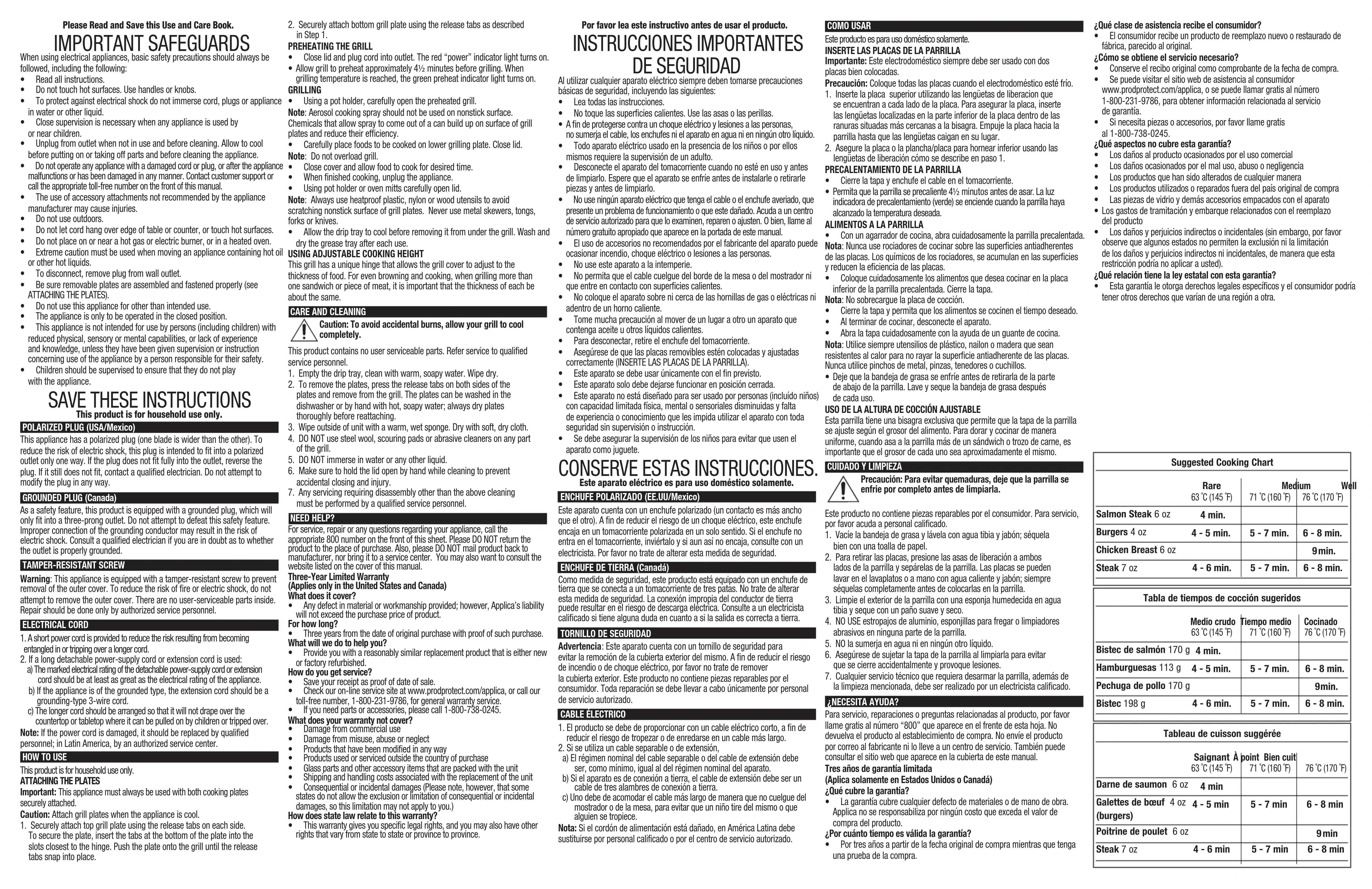 la placa de la parrilla (ambos lados) †8. Bandeja de grasa (Pieza N° GRP1060-03) Nota: † indica piezas desmontables/ reemplazables por el consumidor Veuillez lire et conserver ce guide d’entretien et d’utilisation. IMPORTANTES CONSIGNES DE SÉCURITÉ. Lorsqu’on utilise des appareils électriques, il faut toujours respecter certaines règles de sécurité fondamentales, notamment les suivantes :
