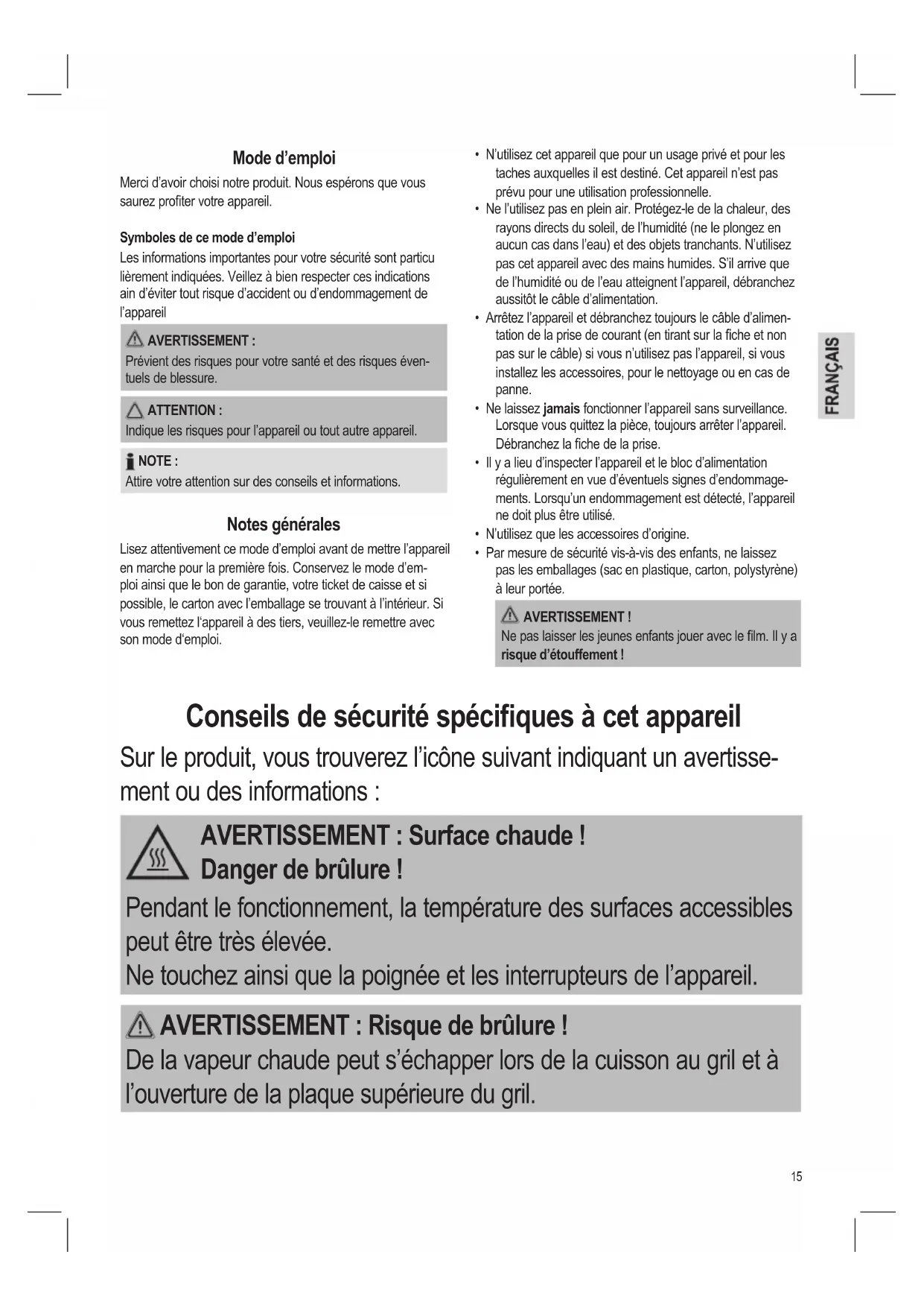 - En cas de livraison incomplète ou de dégâts, n’utilisez pas l’appareil. Renvoyez-le à votre vendeur immédiatement. NOTE : L’appareil peut garder des restes de production ou de pous- sière. Nous vous conseillons de nettoyer l’appareil conformé- ment au chapitre “Nettoyage”. Conseils d’utilisation ATTENTION : Evitez d’endommager les surfaces antiadhésives du gril !
