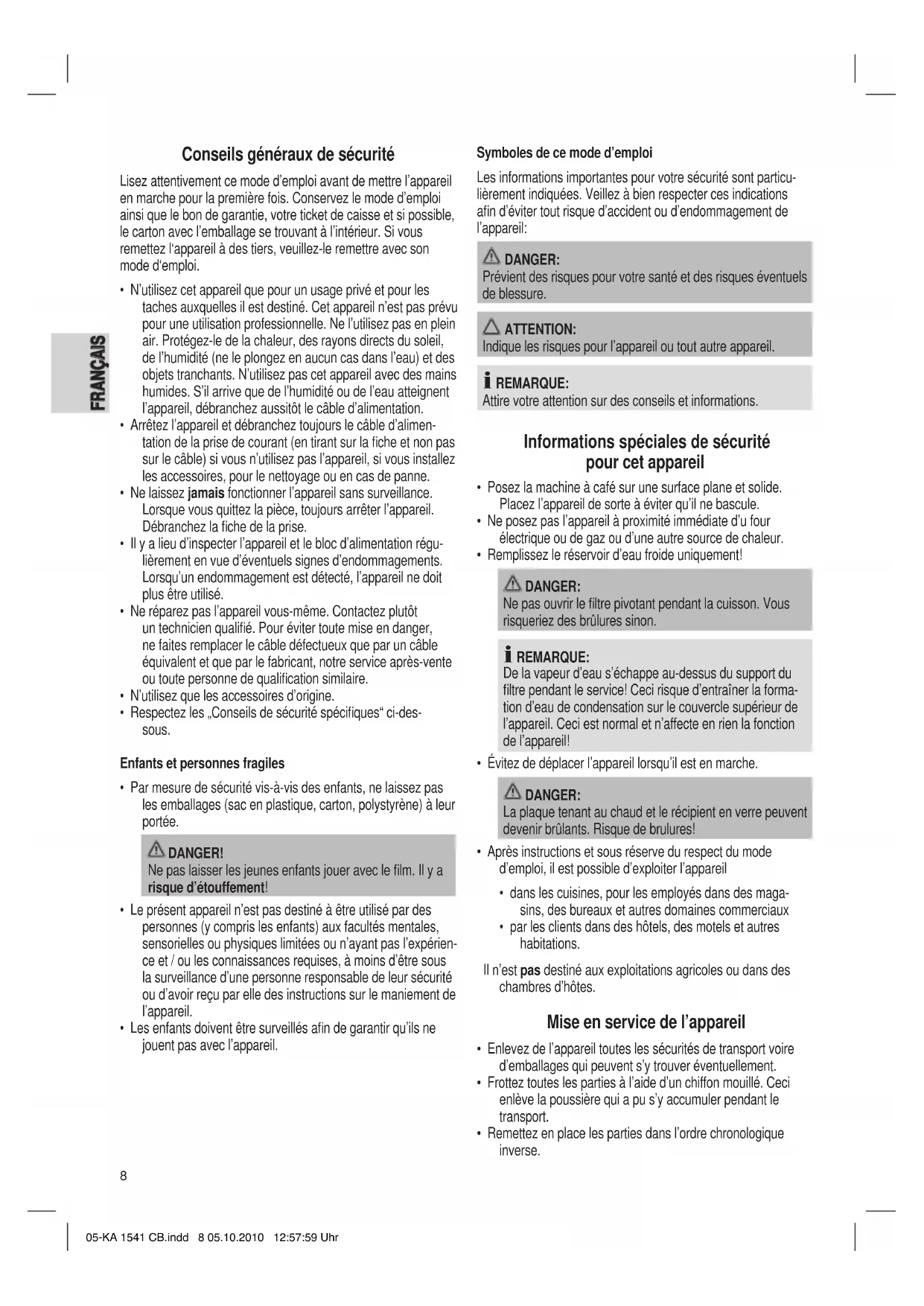 Modèle:.......................................................................KA 1541 CB Alimentation: ..............................................220-240 V ~ 50/60 Hz Consommation: ............................................................730-870 W Quantité de remplissage: ..............................................1,25 Litres Classe de protection: ................................................................... Ι Poids net: ..........................................................................1,25 kg 05-KA 1541 CB.indd 9 05.10.2010 12:57:59 Uhr10 fRANÇAIS Cet appareil a été contrôlé d’après toutes les directives euro- péennes actuelles applicables, comme par exemple concernant la compatibilité électromagnétique et la basse tension. Cet ap- pareil a été fabriqué en respect des réglementations techniques de sécurité les plus récentes. Sous réserve de modications techniques. Signication du symbole „Elimination“ Protégez votre environnement, ne jetez pas vos appareils électriques avec les ordures ménagères. Utilisez, pour l’élimination de vos appareils électriques, les bornes de collecte prévues à cet effet où vous pouvez vous débarrasser des appareils que vous n’utilisez plus. Vous contribuez ainsi à éviter les impacts potentiels dans l’envi- ronnement et sur la santé de chacun, causés par une mauvaise élimination de ces déchets. Vous contribuez aussi au recyclage sous toutes ses formes des appareils électriques et électroniques usagés. Vous trouverez toutes les informations sur les bornes d’élimina- tion des appareils auprès de votre commune ou de l’administra- tion de votre communauté. 05-KA 1541 CB.indd 10 05.10.2010 12:57:59 Uhr11