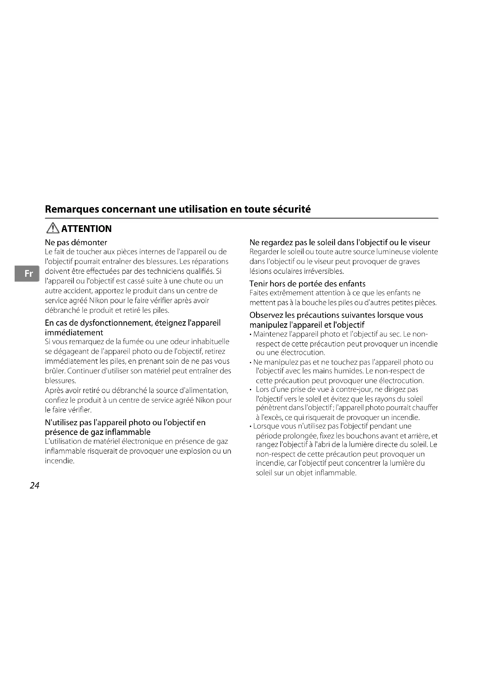 Remarques concernant une utilisation en toute sécurité ATTENTION Ne pas démonter Le fait de toucher aux pièces internes de l'appareil ou de l'objectif pourrait entraîner des blessures. Les réparations doivent être effectuées par des techniciens qualifiés. Si l'appareil ou l'objectif est cassé suite à une chute ou un autre accident, apportez le produit dans un centre de service agréé Nikon pour le faire vérifier après avoir débranché le produit et retiré les piles. En cas de dysfonctionnement, éteignez l'appareil immédiatement Si vous remarquez de la fumée ou une odeur inhabituelle se dégageant de l'appareil photo ou de l'objectif, retirez immédiatement les piles, en prenant soin de ne pas vous brûler. Continuer d'utiliser son matériel peut entraîner des blessures. Après avoir retiré ou débranché la source d'alimentation, confiez le produit à un centre de service agréé Nikon pour le faire vérifier. N'utilisez pas l'appareil photo ou l'objectif en présence de gaz inflammable L'utilisation de matériel électronique en présence de gaz inflammable risquerait de provoquer une explosion ou un incendie. Ne regardez pas le soleil dans l'objectif ou le viseur Regarder le soleil ou toute autre source lumineuse violente dans l'objectif ou le viseur peut provoquer de graves lésions oculaires irréversibles. Tenir hors de portée des enfants Faites extrêmement attention à ce que les enfants ne mettent pas à la bouche les piles ou d'autres petites pièces. Observez les précautions suivantes lorsque vous manipulez l'appareil et l'objectif