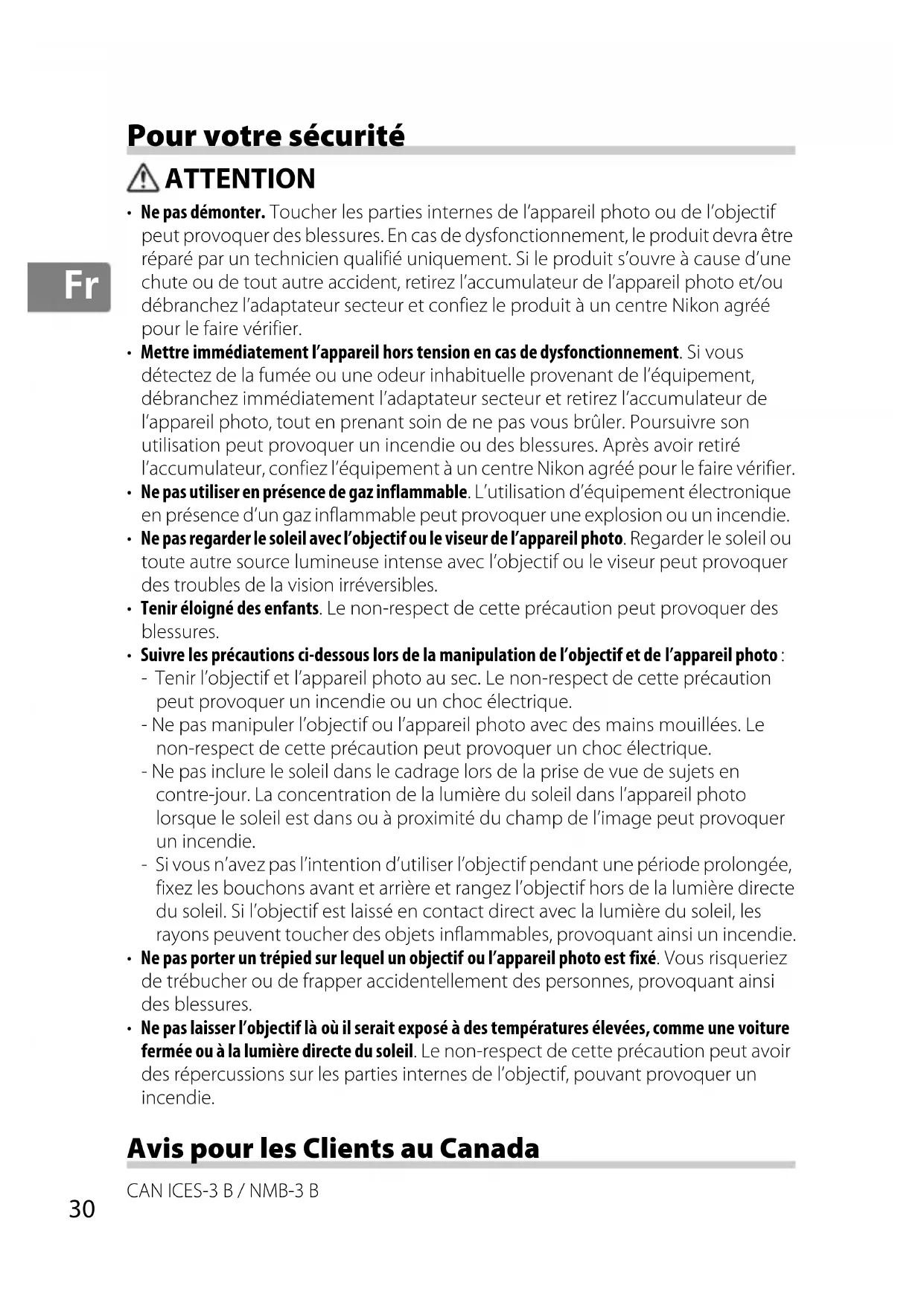 - Ne pas démonter. Toucher les parties internes de l’appareil photo ou de l’objectif peut provoquer des blessures. En cas de dysfonctionnement, le produit devra être réparé par un technicien qualifié uniquement. Si le produit s’ouvre à cause d’une chute ou de tout autre accident, retirez l’accumulateur de l’appareil photo et/ou débranchez l’adaptateur secteur et confiez le produit à un centre Nikon agréé pour le faire vérifier.