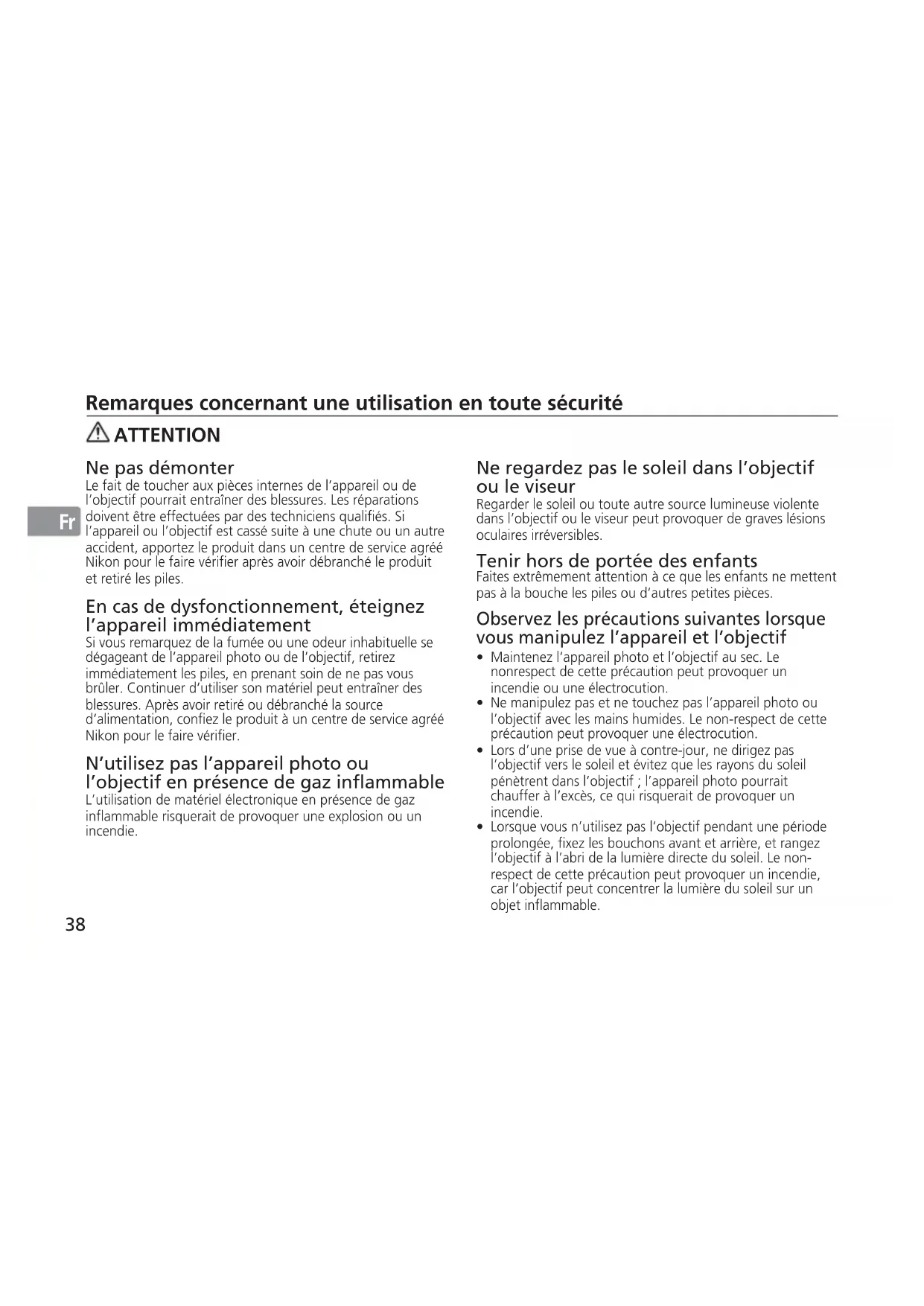 Remarques concernant une utilisation en toute sécurité ATTENTION Ne pas démonter Le fait de toucher aux pièces internes de l’appareil ou de l’objectif pourrait entraîner des blessures. Les réparations doivent être effectuées par des techniciens qualifiés. Si l’appareil ou l’objectif est cassé suite à une chute ou un autre accident, apportez le produit dans un centre de service agréé Nikon pour le faire vérifier après avoir débranché le produit et retiré les piles. En cas de dysfonctionnement, éteignez l’appareil immédiatement Si vous remarquez de la fumée ou une odeur inhabituelle se dégageant de l’appareil photo ou de l’objectif, retirez immédiatement les piles, en prenant soin de ne pas vous brûler. Continuer d’utiliser son matériel peut entraîner des blessures. Après avoir retiré ou débranché la source d’alimentation, confiez le produit à un centre de service agréé Nikon pour le faire vérifier. N’utilisez pas l’appareil photo ou l’objectif en présence de gaz inflammable L’utilisation de matériel électronique en présence de gaz inflammable risquerait de provoquer une explosion ou un incendie. Ne regardez pas le soleil dans l’objectif ou le viseur Regarder le soleil ou toute autre source lumineuse violente dans l’objectif ou le viseur peut provoquer de graves lésions oculaires irréversibles. Tenir hors de portée des enfants Faites extrêmement attention à ce que les enfants ne mettent pas à la bouche les piles ou d’autres petites pièces. Observez les précautions suivantes lorsque vous manipulez l’appareil et l’objectif